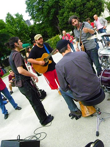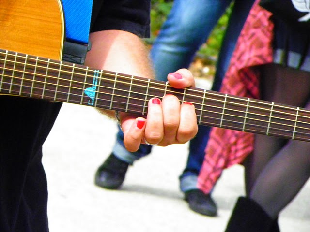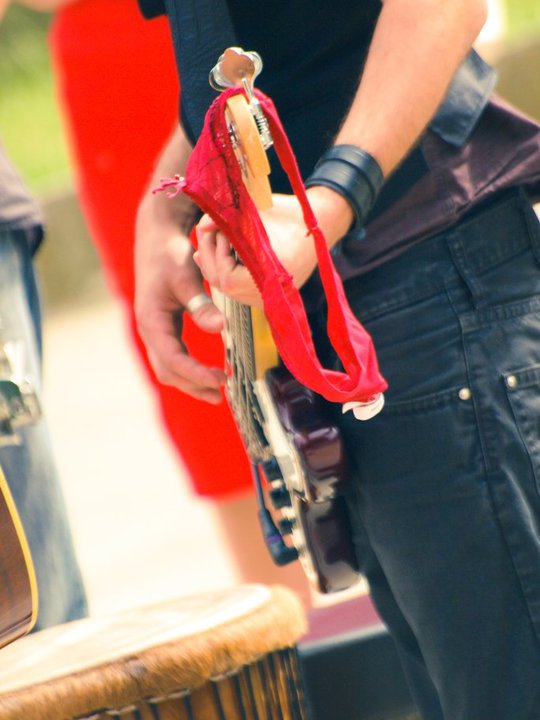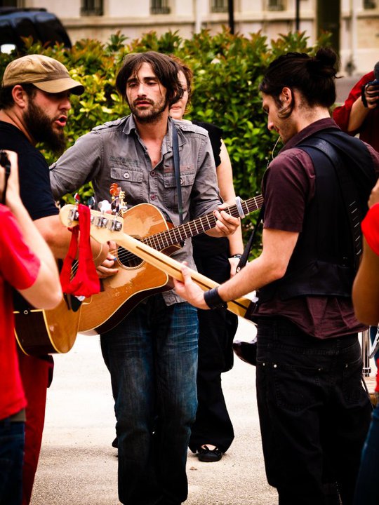 L’article 431-9 du code pénal dispose qu’une peine de 6 mois d’emprisonnement et de 7 500 euros d’amende punit le fait d’organiser une manifestation sur la voie publique qui n’a pas fait l’objet d’un déclaration préalable dans les conditions fixées par la loi… Mais, on ne peut définitivement pas être rock’n’roll et respecter scrupuleusement les règles de respect à l’ordre public, vous en conviendrez. Et, justement, les rockeurs eux-n’aiment pas respecter les règles, alors quand June Hill débarque à Paris, au diable le protocole : ils donnent rendez-vous à quelques amis, fans ou curieux à Montparnasse pour y improviser une sorte de petit concert sauvage acoustique… Dress code obligatoire : du rouge dans la tenue. Résultat : Thomas maquille ses ongles d’un beau vernis rouge à faire pâlir les fashonistas, quant à Jêrome, il accroché de la jolie dentelle rouge sexy à sa guitare : ROCK on t’a dit !