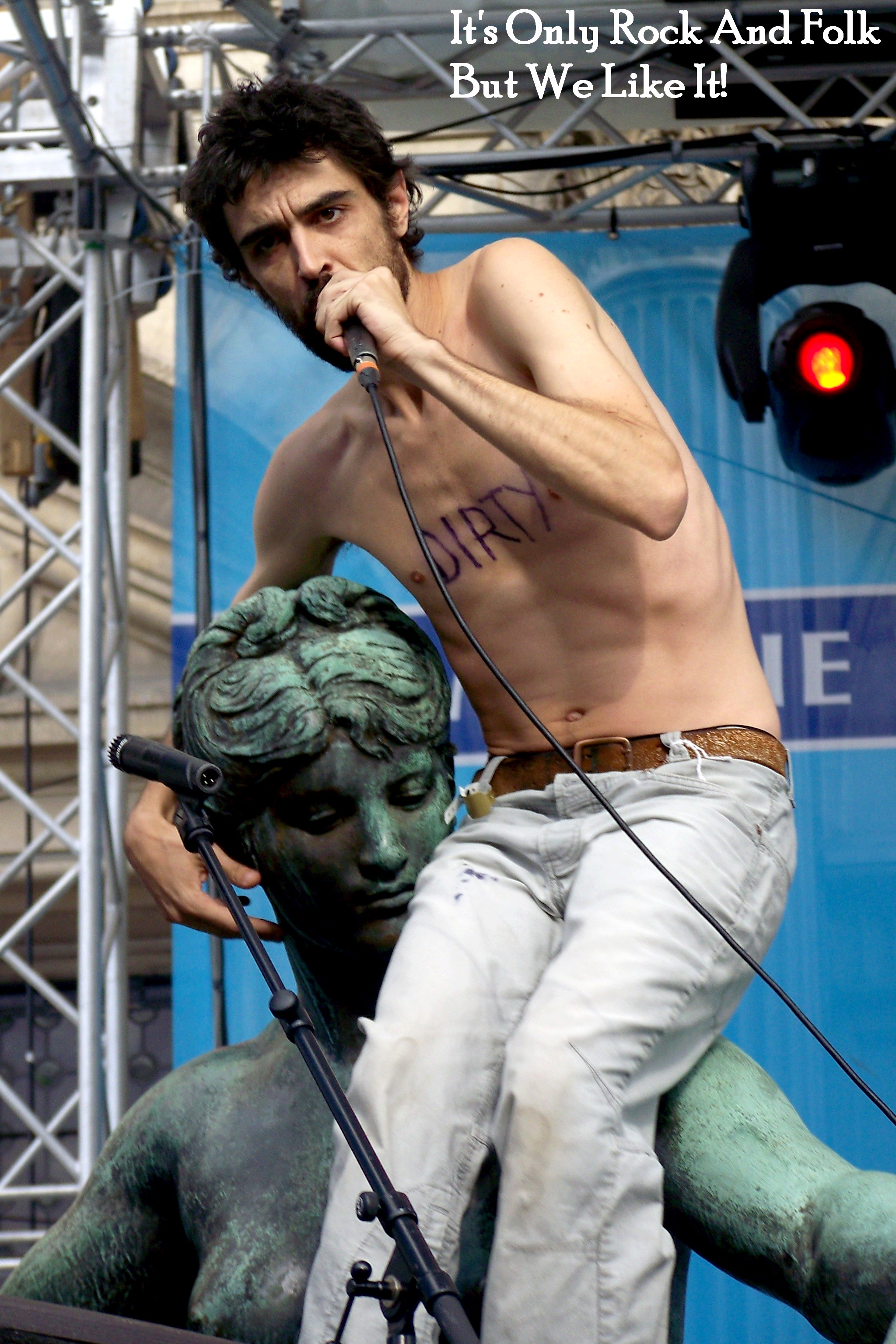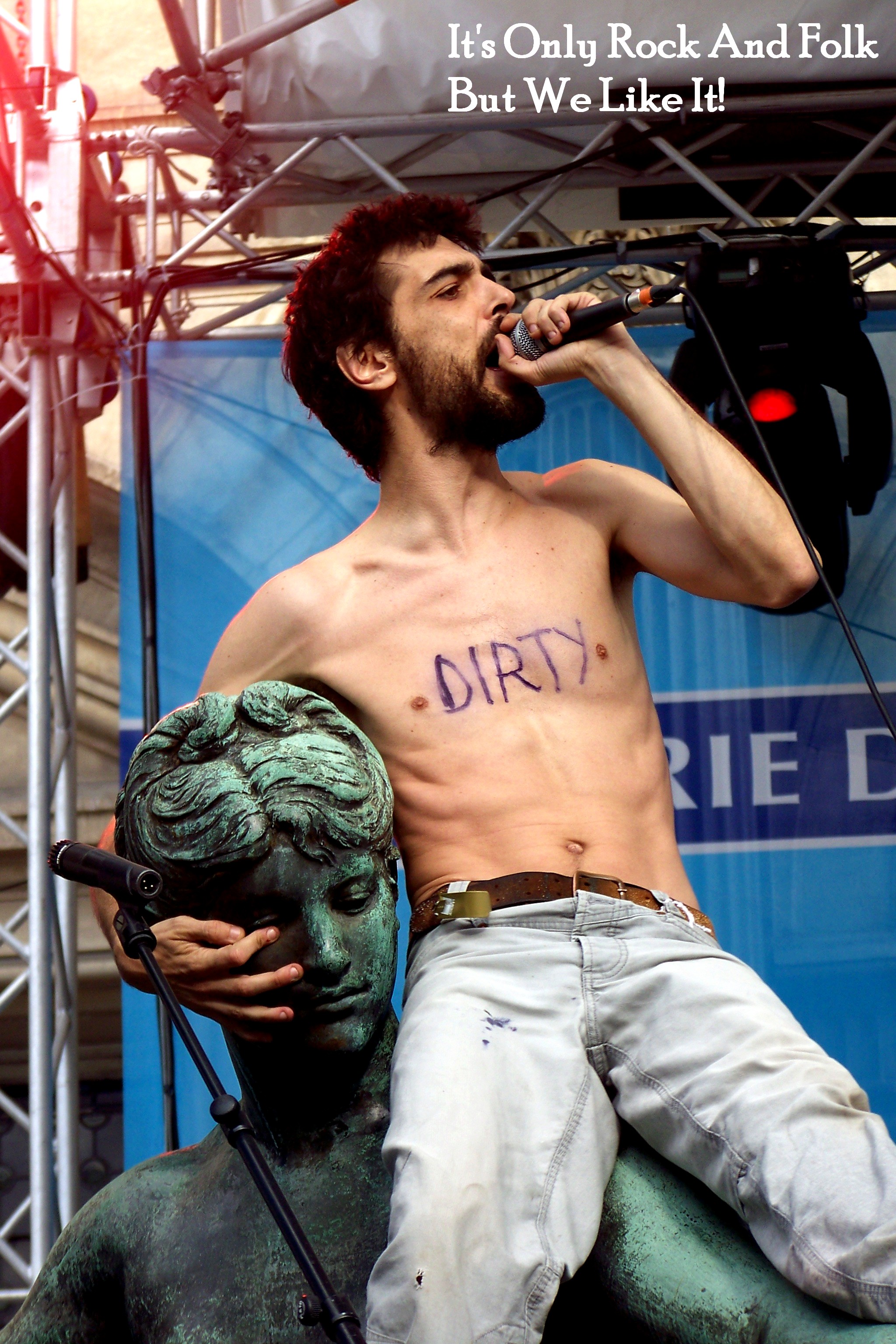 Se lâcher est un mot beaucoup trop faible, car la prestation live de Boogers a tout simplement phénoménal : c’est entre rock garage/hip-hop/électro/ska, le tout accompagné d’une pointe d’humour, et agrémenté d’un mini streap-tease. S’il arrive en sweet-shirt “style pyjama pour trainer à la maison”. Boogers fini son set top-less, et laisse dévoiler le mot “dirty” sur son torse. Ne voyez pas là une quelconque envie de séduire les filles (quoique!), l’homme orchestre explique juste que sur scène il a chaud donc il fait tomber le sweet jaune, puis le tee-shirt bleu… Pas étonnant, en vrai punk dans l’âme, il saute partout, se laisse tomber sur la scène, grimpe sur l’une des statues jonchant la scène, se traine par terre, et finit son set avec un drapeau des Doors enroulé sur son visage en chantant avant de sortir de la scène en trottinette… Bref, c’est loin d’être As Clean As Possible, comme s’intitule son album, sorti un peu plus tôt dans l’année.