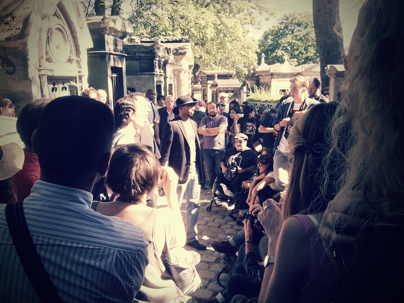 Comme les nombreuses personnes qui ont décidé de se réunir pour réciter des poèmes et chanter tout le répertoire des Doors au Père Lachaise, face à la tombe de Jim. Ils venaient de partout (une jeune femme expliquait venir du Costa Rica pour l’occasion). Et, si j’ai regardé tout ça de loin, j’ai trouvé l’hommage touchant. Je ne sais plus qui disait que Jim Morisson était un Dieu de son vivant. Je n’ai pas connu son mythe, mais j’ai vu que quarante ans après, l’homme possède encore un bon nombre de fidèle.