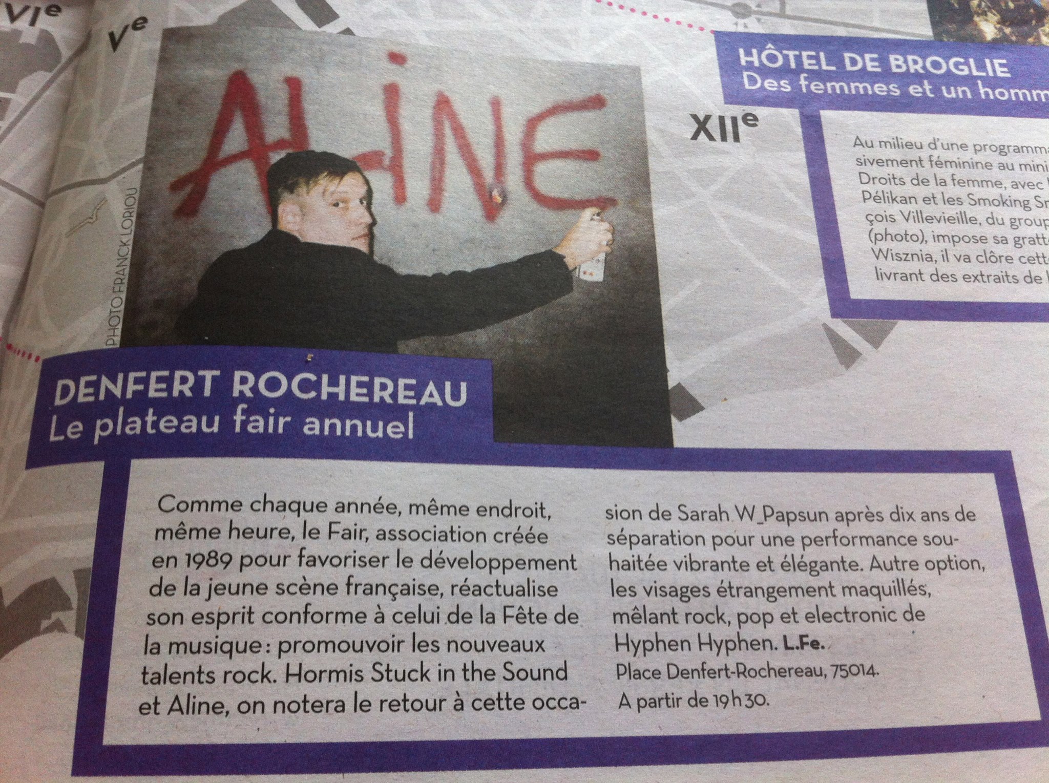 Sinon, tu peux quand même aller Place Denfert-Rochereau pour écouter de la vraie bonne musique labellisé le Fair et Ricard S.A Live avec Stuck In The Sound, Aline, Hyphen Hyphen et Sarah W. Papsun… et contrairement à ce qu’on écrit les stagiaires de Libération (décidément) ces derniers ne se retrouvent pas après 10 ans de séparation.