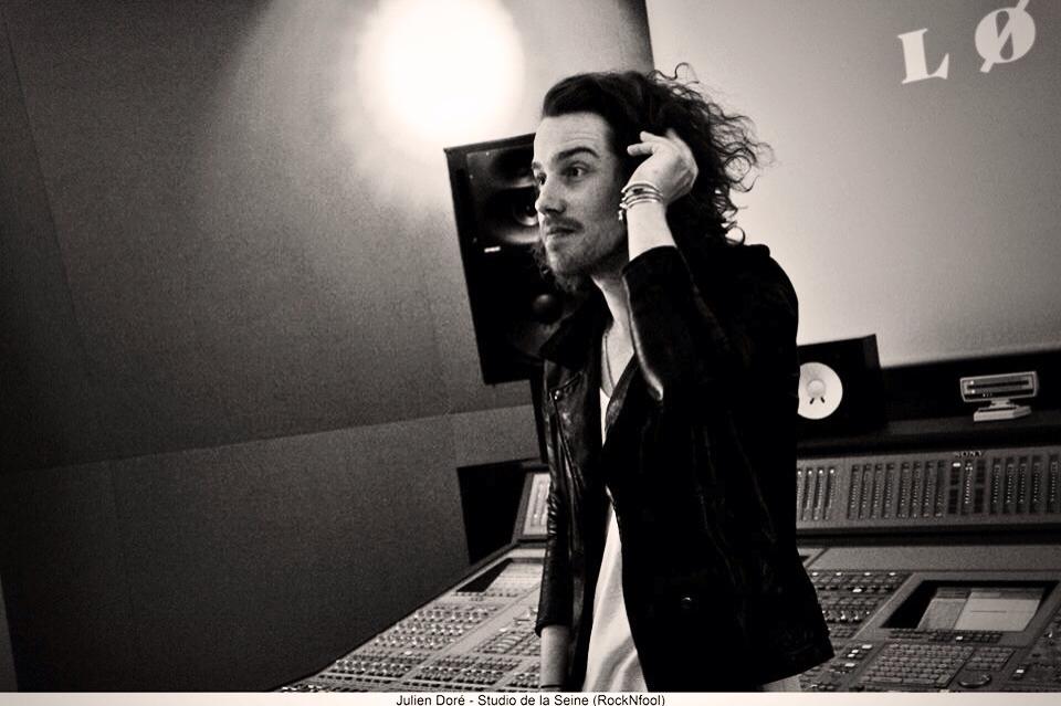 17 heures. Il pleut pour changer. J’ai rendez-vous au Studio de la Seine pour une écoute un peu spéciale. Celle du nouvel album de Julien Doré. On est quelques uns, journalistes et blogueurs à avoir l’immense privilège d’entendre ses nouveaux titres, parfois même pas terminés. Libération est là. Le Nouvel Obs, le Figaro aussi. Et moi. Pour RockNfool. Julien Doré aussi est là. Il sert la main des gens, claque la bise en serrant le bras comme on croise une vieille amie. Perfecto et jean noir, cheveux longs, quelques cernes sous les yeux. Il faut dire qu’il ne s’est pas beaucoup ménagé ces deux dernières années. Un film, une grosse tournée et dans la foulée l’enregistrement du troisième album, avec ses “gars”, ceux qui l’accompagnent sur les routes de France. Pendant trois mois ils se sont enfermés à La Fabrique, à Saint-Rémy-de-Provence pour façonner LØVE. On prononce louve. Cela veut dire Lion en danois, à ce qu’il paraît. Après le Bichon, on reste donc dans le domaine animalier. Dans ce troisième album, Julien nous parle d’amour. Évidemment. D’amour foiré, d’amour passionnel. L’Amour. Avec un grand A. Cette fois, il s’agit de ses textes à lui. Tout seul. L’album, il l’a écrit quasi-seul, alors forcément ce troisième bébé, il le chérit et c’est lui qui nous le présente. “Quand on est arrivé à la Fabrique, certains textes n’étaient même pas terminés, j’en ai fini quelques uns sur place. C’était tout nouveau pour moi”.