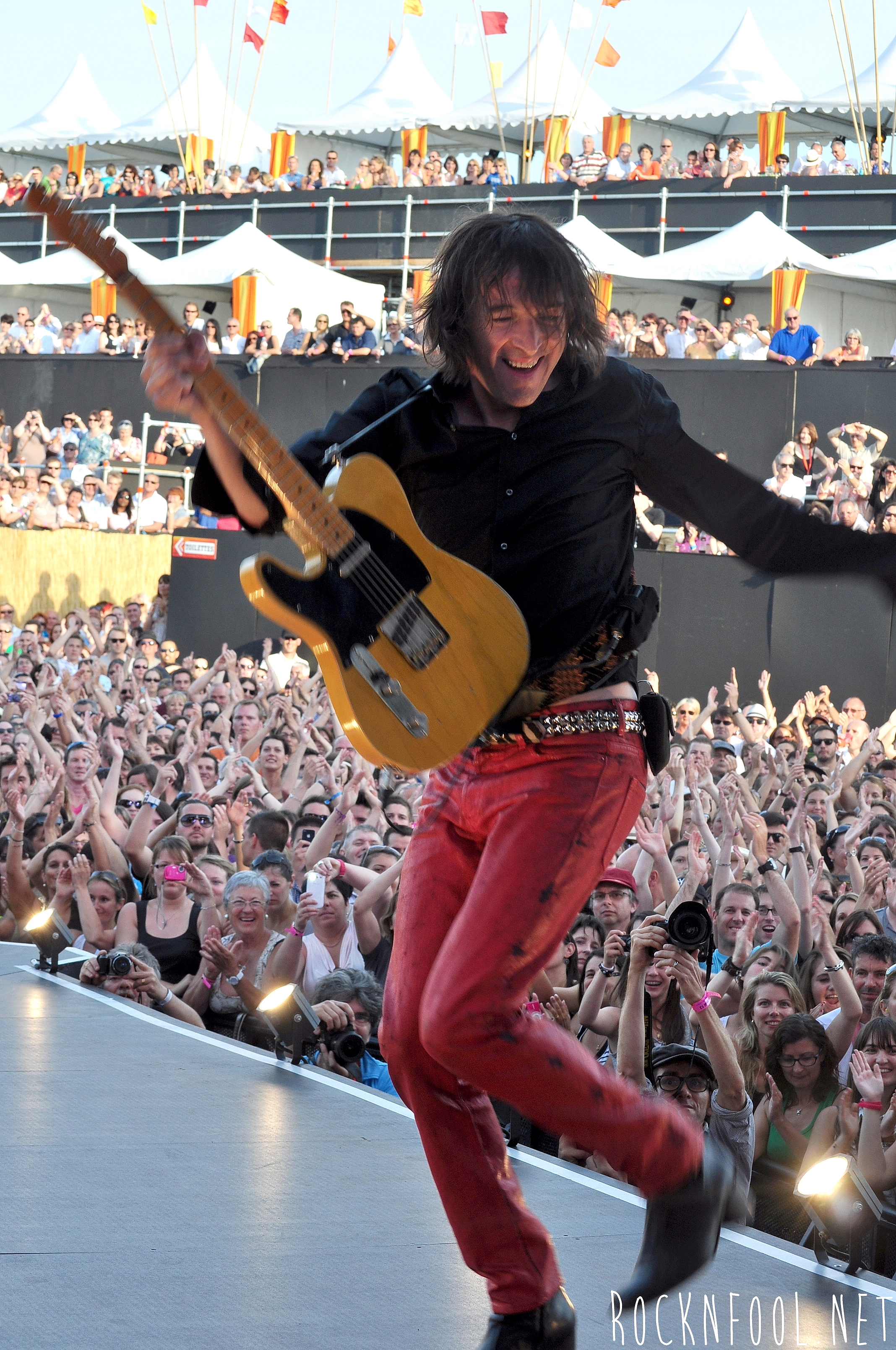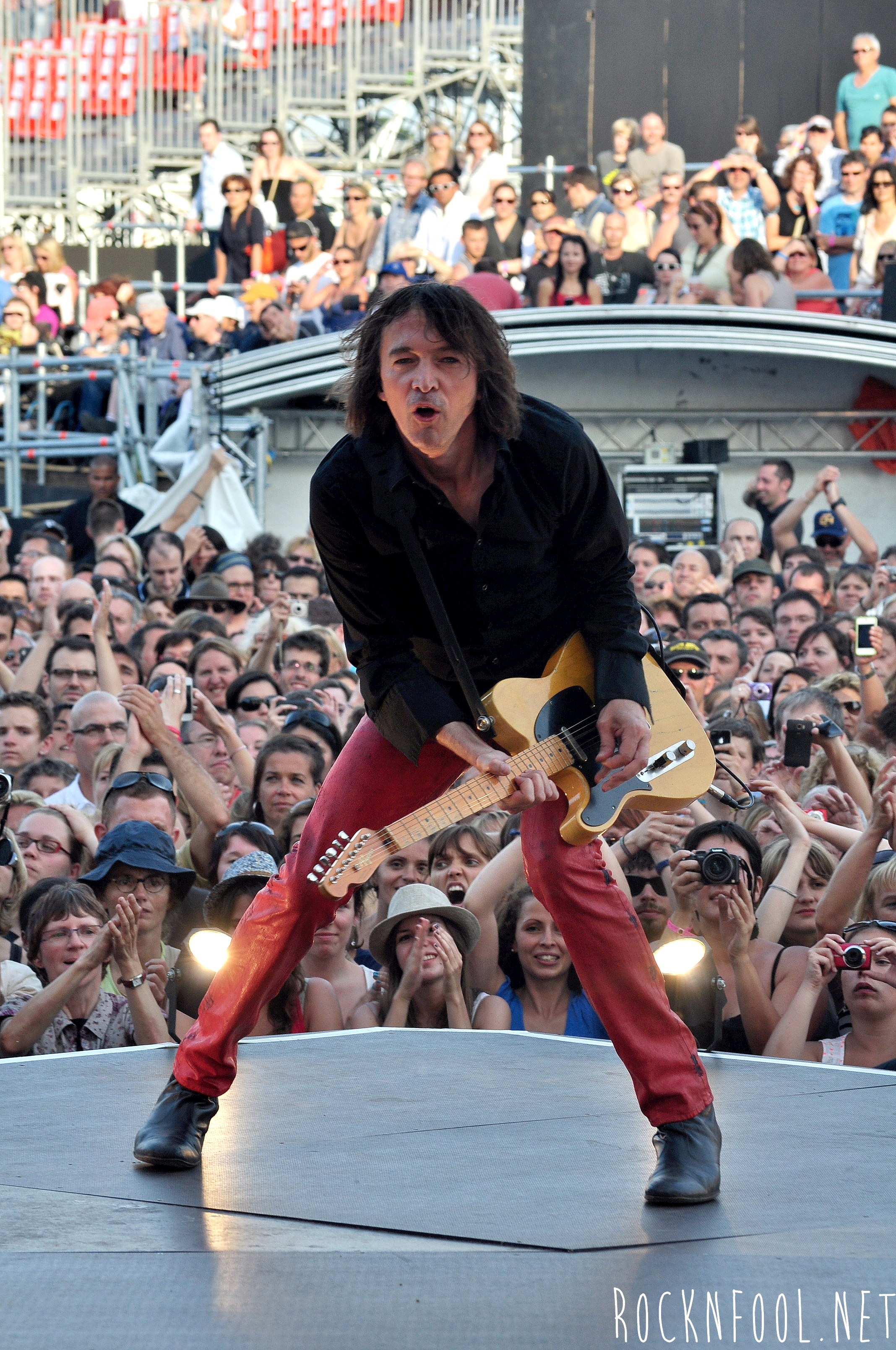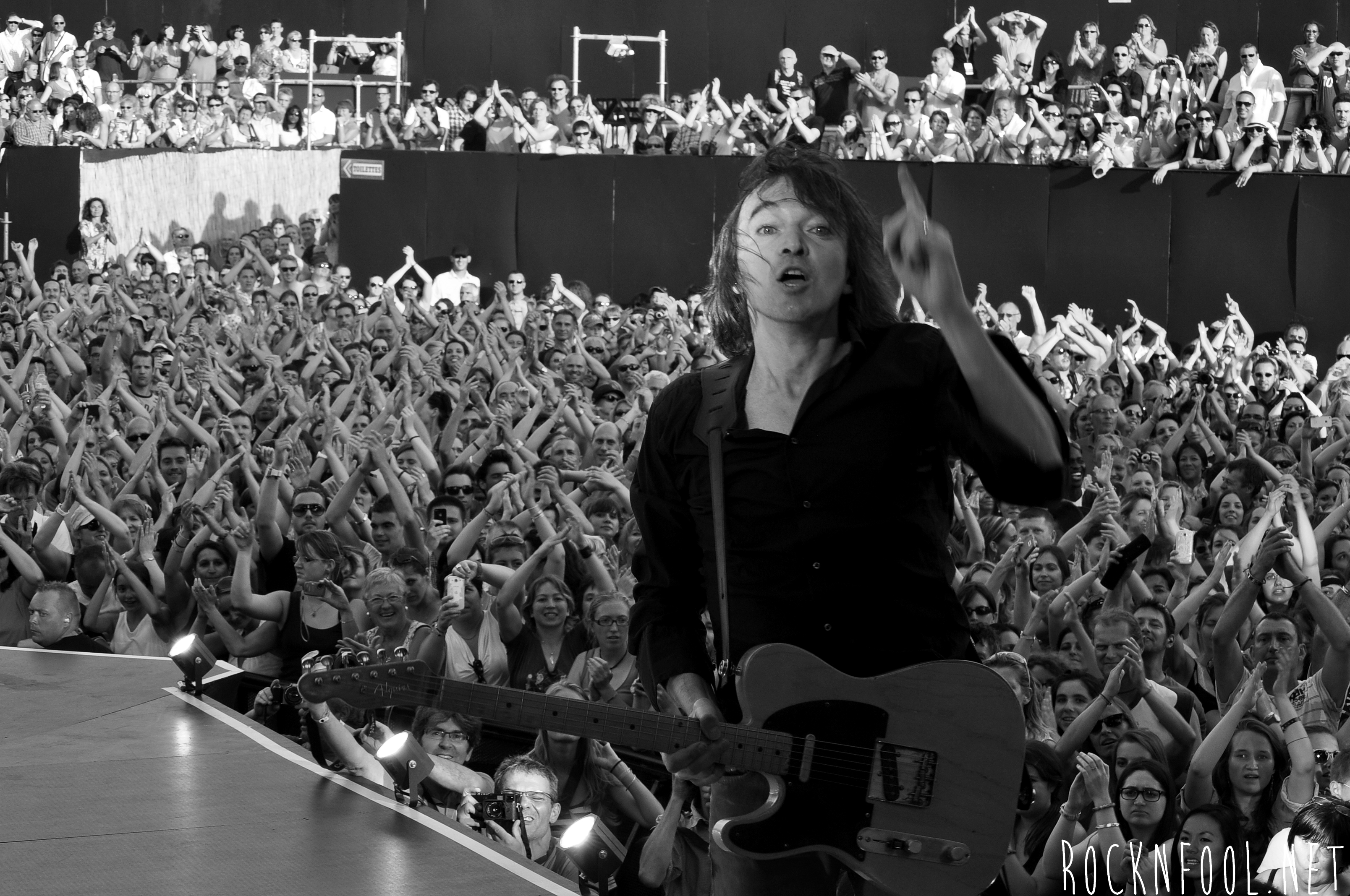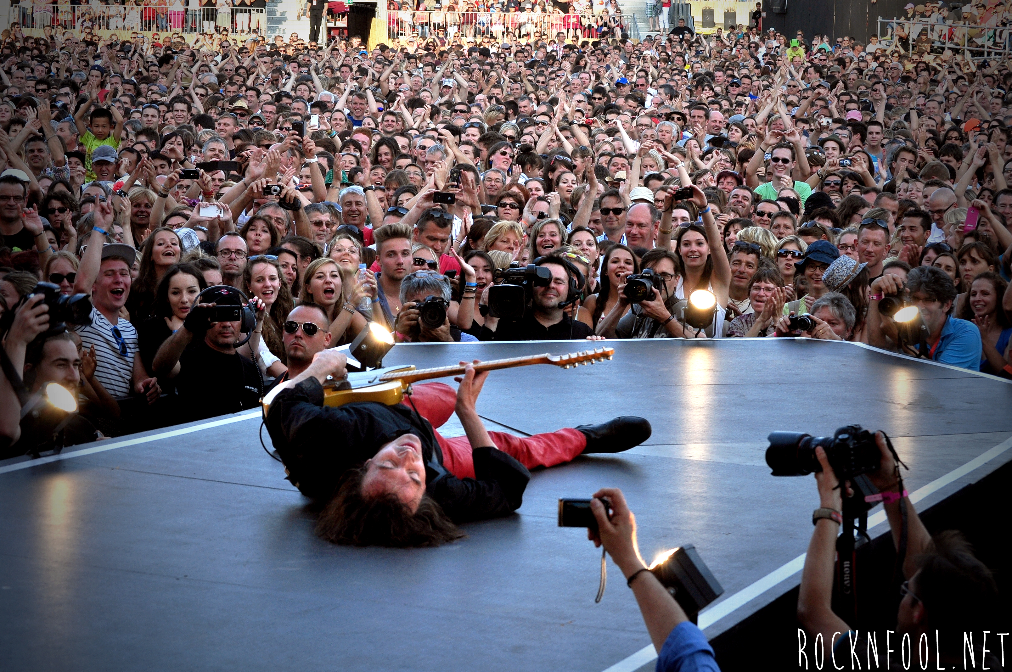 Je ne peux pas vous décrire ce concert tant je n’y croyais pas moi même. Cali semblait se nourrir de l’adrénaline de la scène. Il est venu chercher le public à chaque titre, et c’est pour lui qu’il jouait. C’est pour lui (et la mise en scène), qu’il a fait des galipettes sur la scène, qu’il s’est balancé une bouteille d’eau sur le crâne, qu’il a volé la caméra d’un technicien sur scène, qu’il a croqué des pétales de roses d’un bouquet pour mieux les recracher sur la caméra de fosse, qu’il a attrapé le drapeau breton d’une fan, qu’il a crié “A POIL !”, et enfin, qu’il a fait deux body-surfing, dont un énorme, où il s’est littéralement fait porter par le public du devant de la scène, jusqu’en haut du gradin au fin fond de la place. Complètement fada ? En tout cas c’est impressionnant.