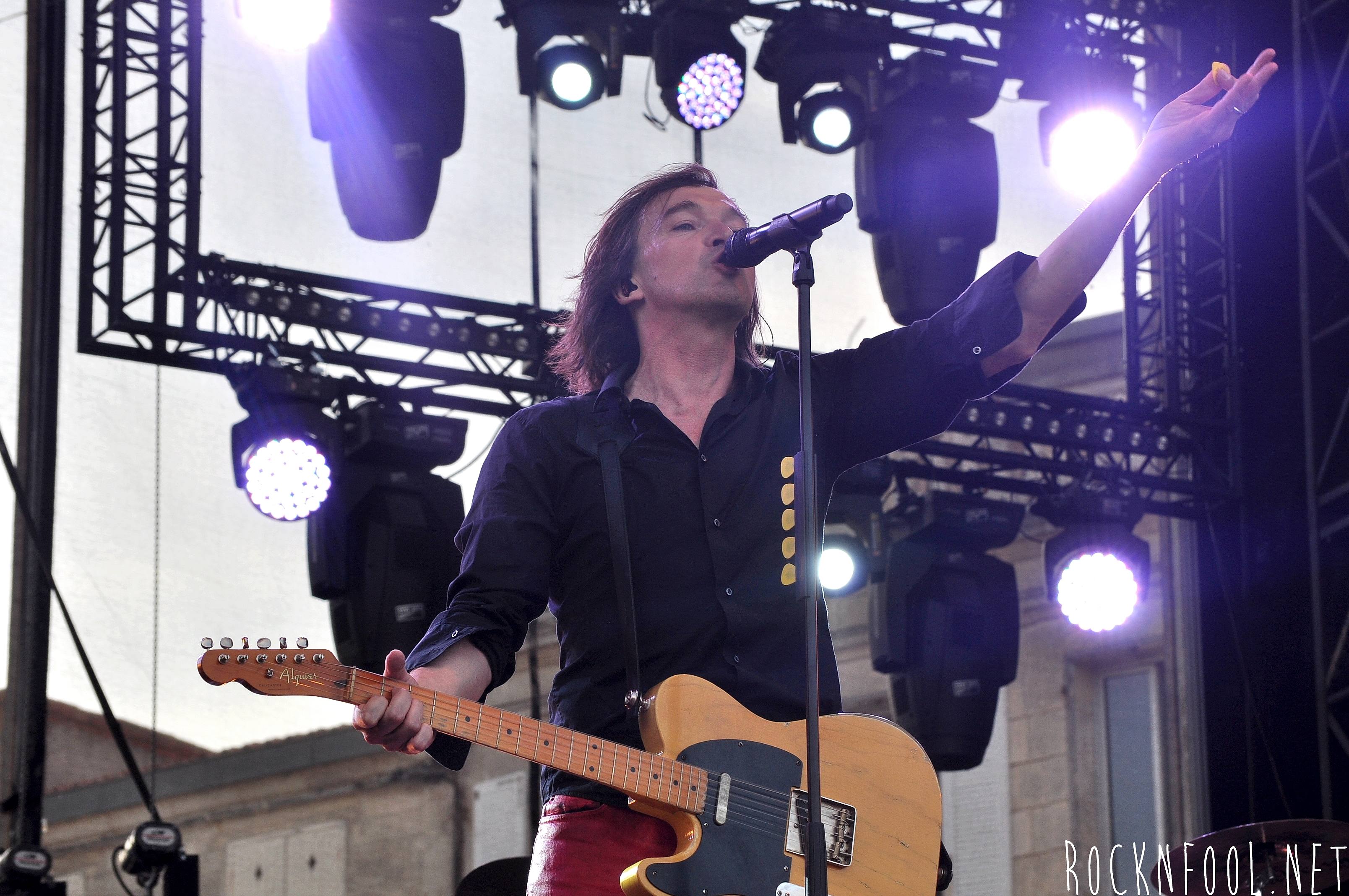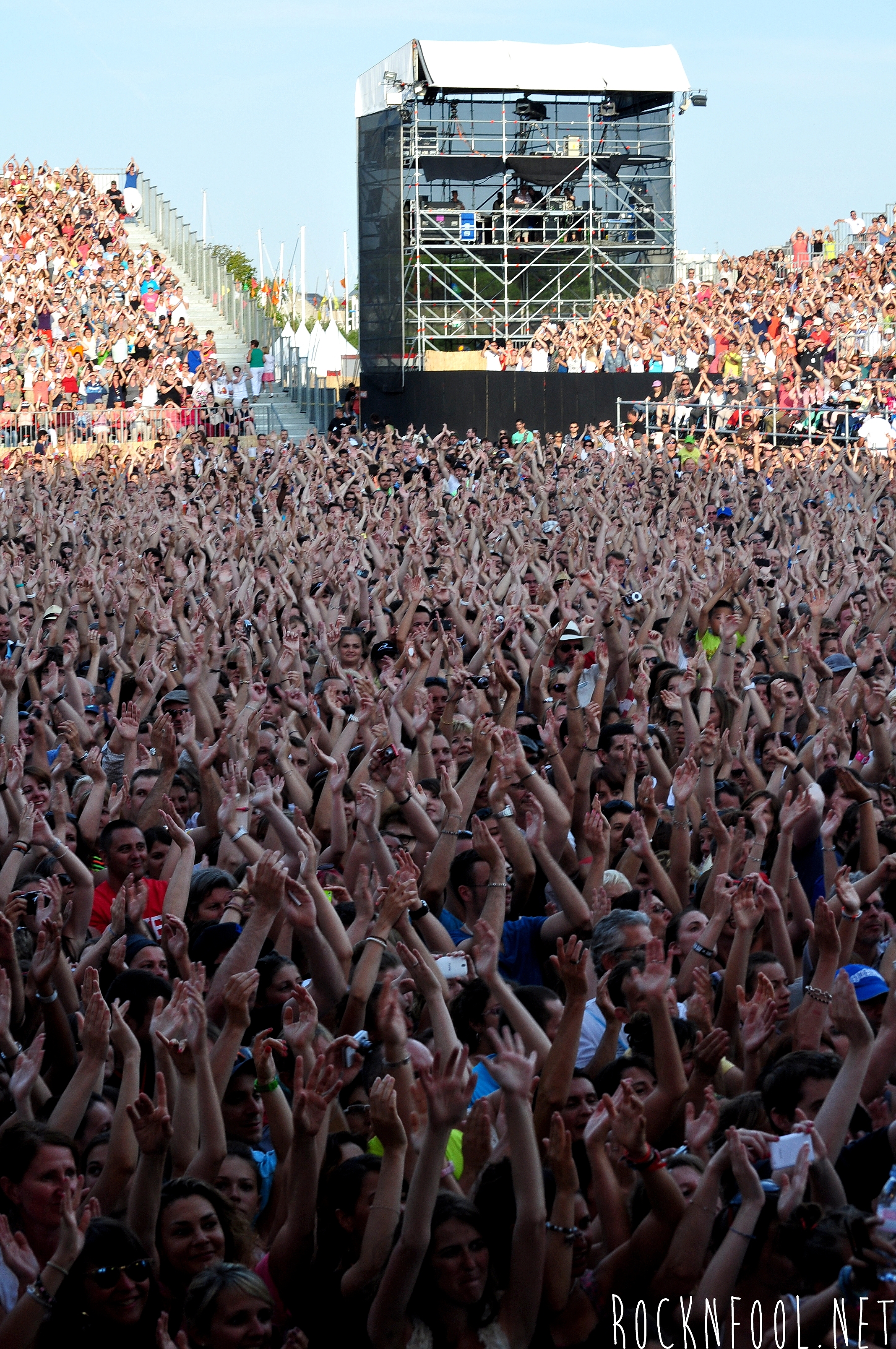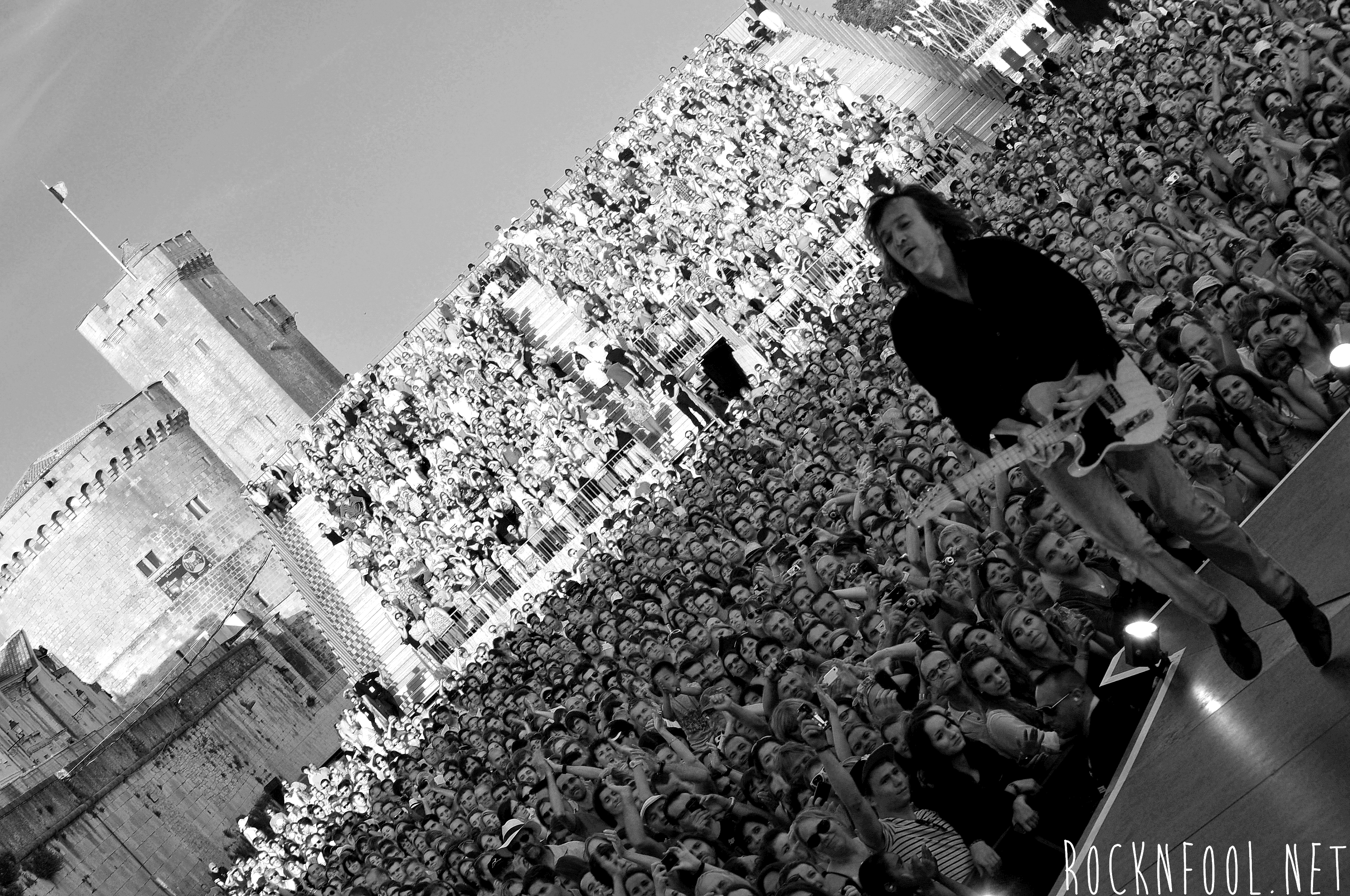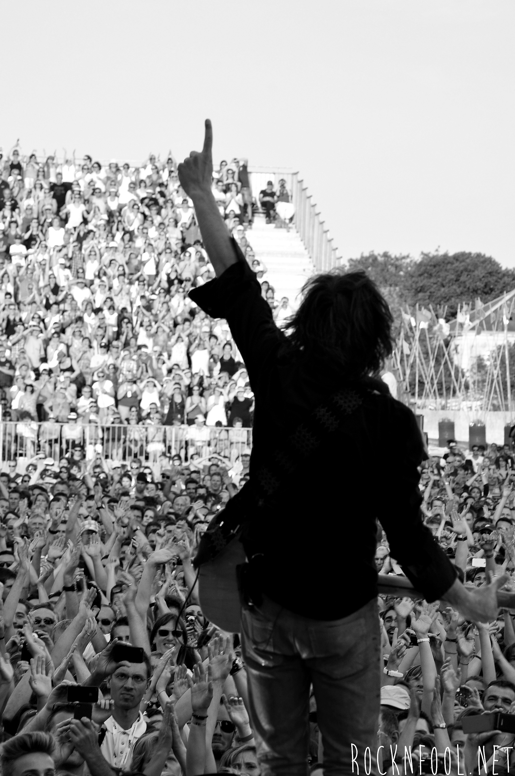 Je ne peux pas vous décrire ce concert tant je n’y croyais pas moi même. Cali semblait se nourrir de l’adrénaline de la scène. Il est venu chercher le public à chaque titre, et c’est pour lui qu’il jouait. C’est pour lui (et la mise en scène), qu’il a fait des galipettes sur la scène, qu’il s’est balancé une bouteille d’eau sur le crâne, qu’il a volé la caméra d’un technicien sur scène, qu’il a croqué des pétales de roses d’un bouquet pour mieux les recracher sur la caméra de fosse, qu’il a attrapé le drapeau breton d’une fan, qu’il a crié “A POIL !”, et enfin, qu’il a fait deux body-surfing, dont un énorme, où il s’est littéralement fait porter par le public du devant de la scène, jusqu’en haut du gradin au fin fond de la place. Complètement fada ? En tout cas c’est impressionnant.