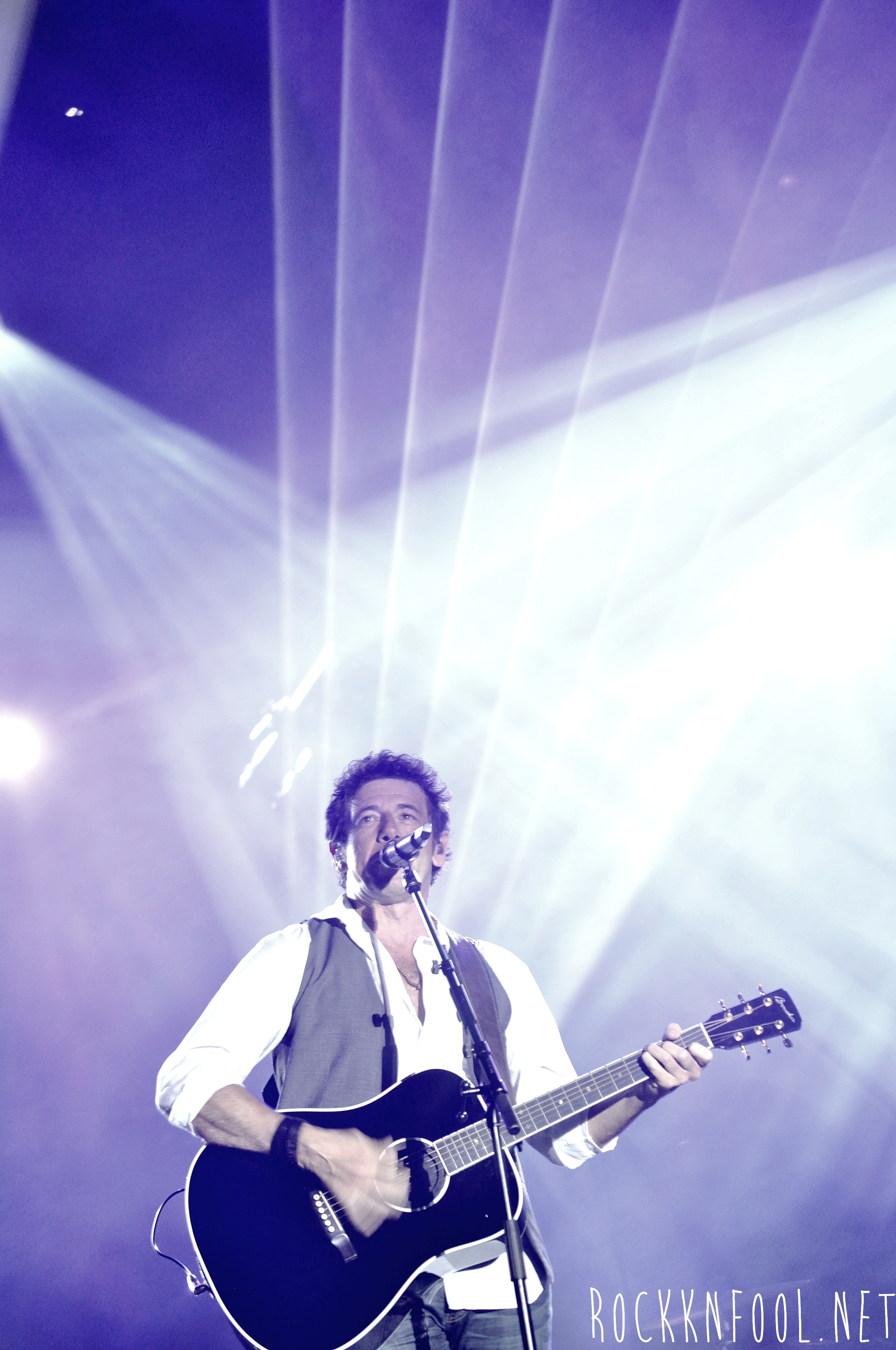 La mise en scène est bizarre, notamment cet espèce de décompte affiché sur les écrans de part et d’autres de la scène, où chaque nombre est accompagné d’une vieille photo de Patrick Bruel. Et puis, comme pour le Nouvel An, soudainement le décompte prend fin, et Patrick sort de la fumée avec sa guitare puis s’avance sous les cris de joie. Légèrement kitsch.