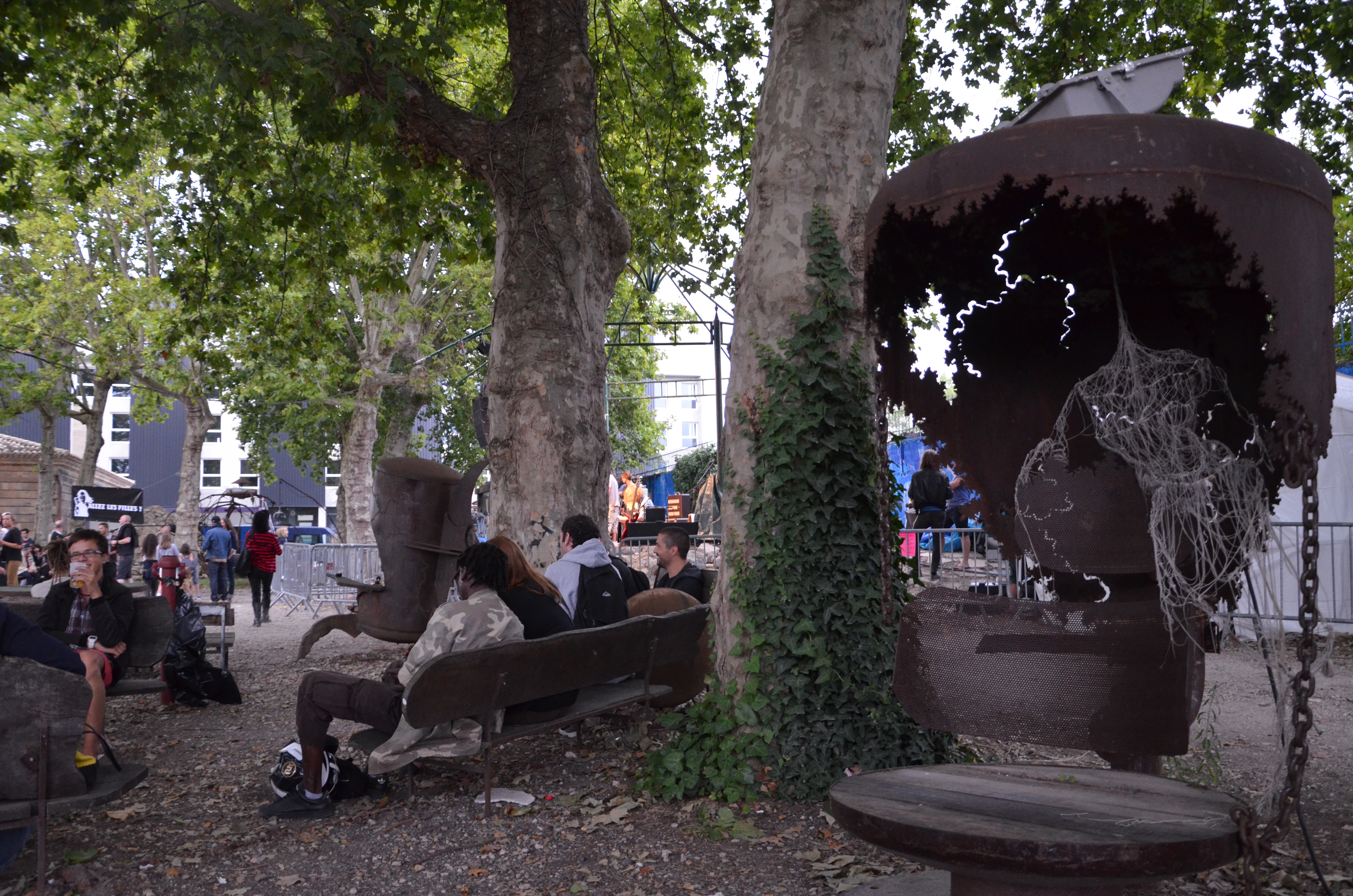 Chaque été à Bordeaux se déroule le festival Relâche, dans divers endroits parsemés aux quatre coins de la ville et des environs. C’est avant tout l’occasion de se laisser aller dans des cadres originaux à des divagations musicales de tout genre : rock, pop, chanson, hop hop, électro … Parmi ces lieux, les Vivres de l’Art, atelier d’artiste cerné par de vieux bâtiments désaffectés et rempli de sculptures en tout genre , que j’ai allègrement squatté. Report :