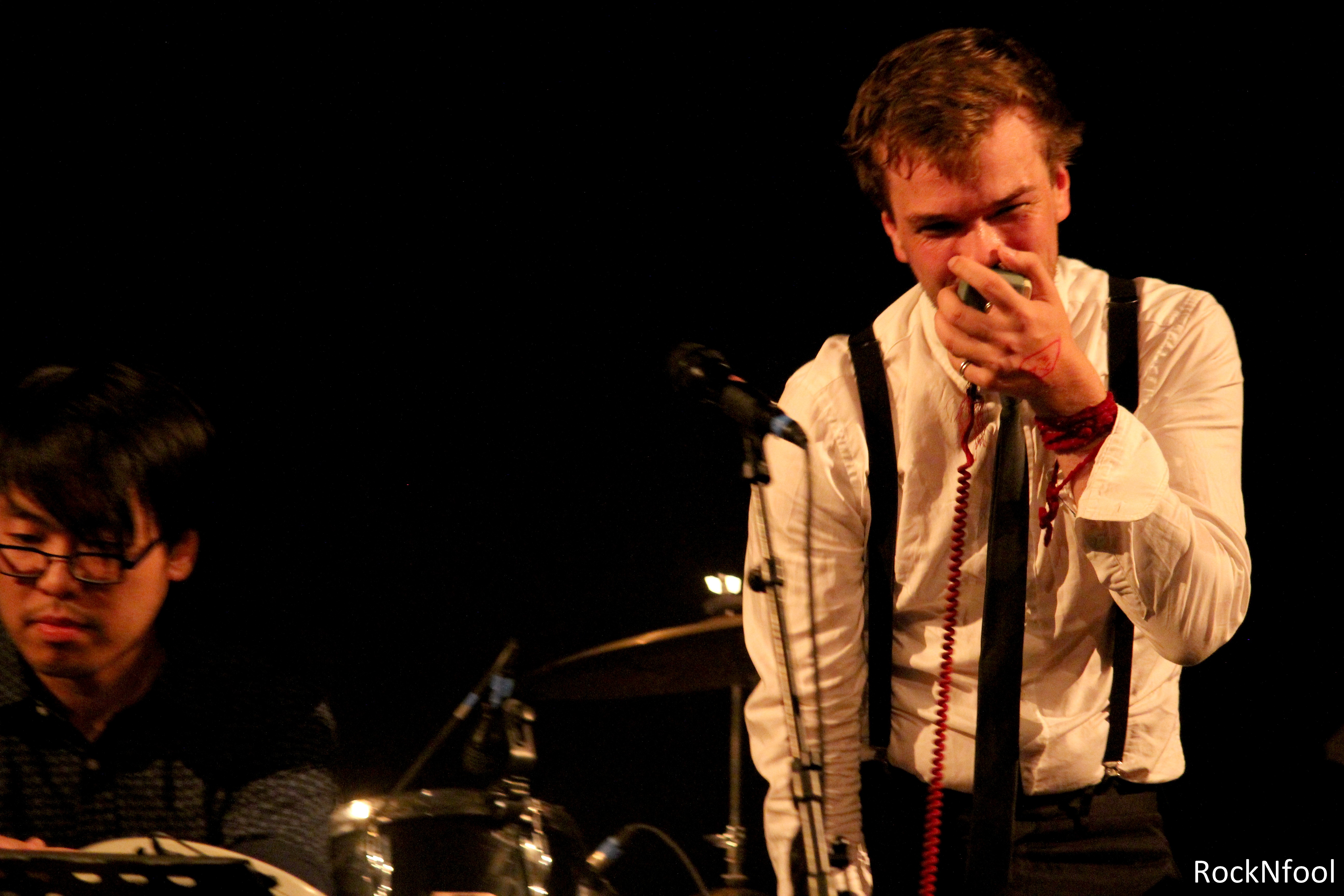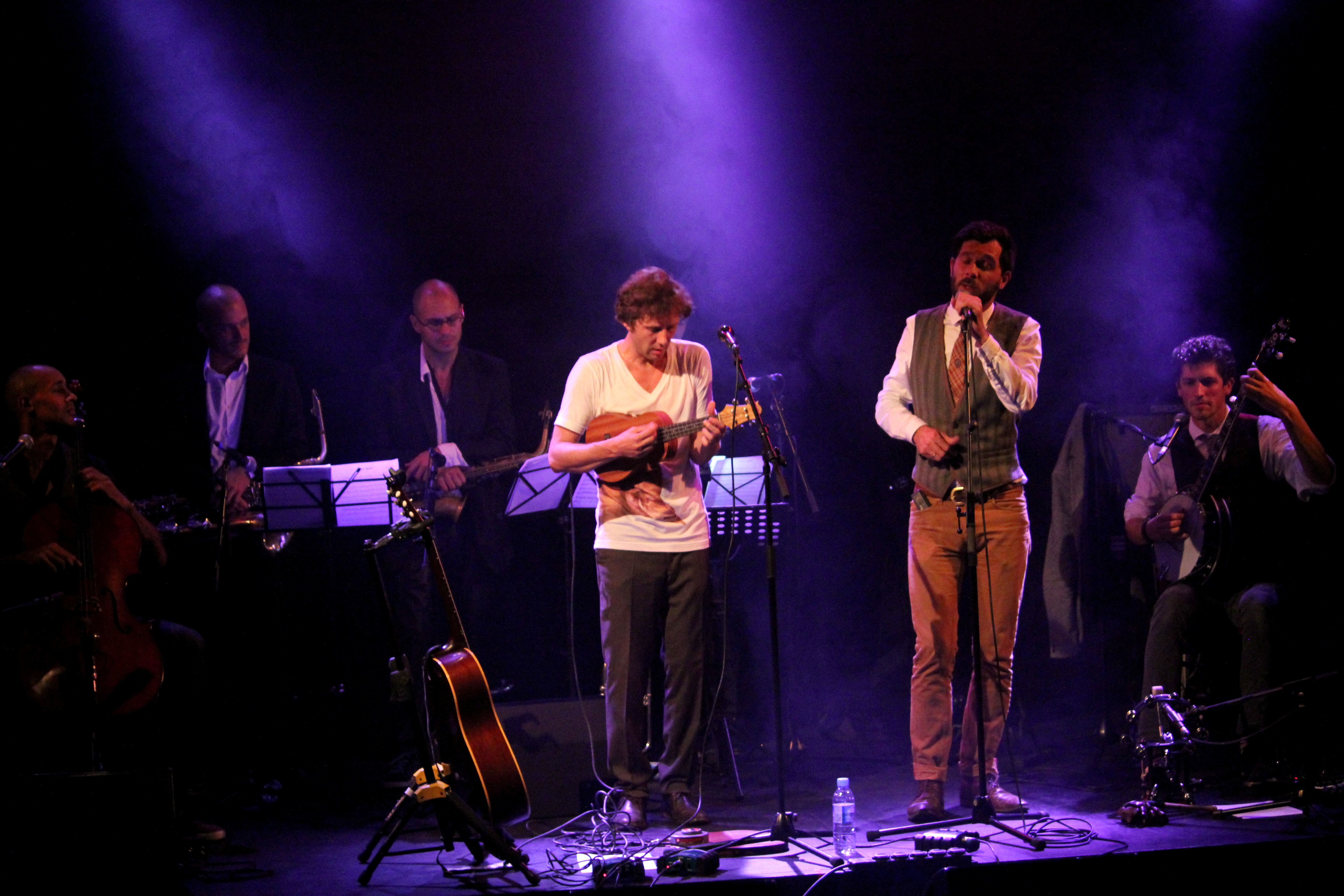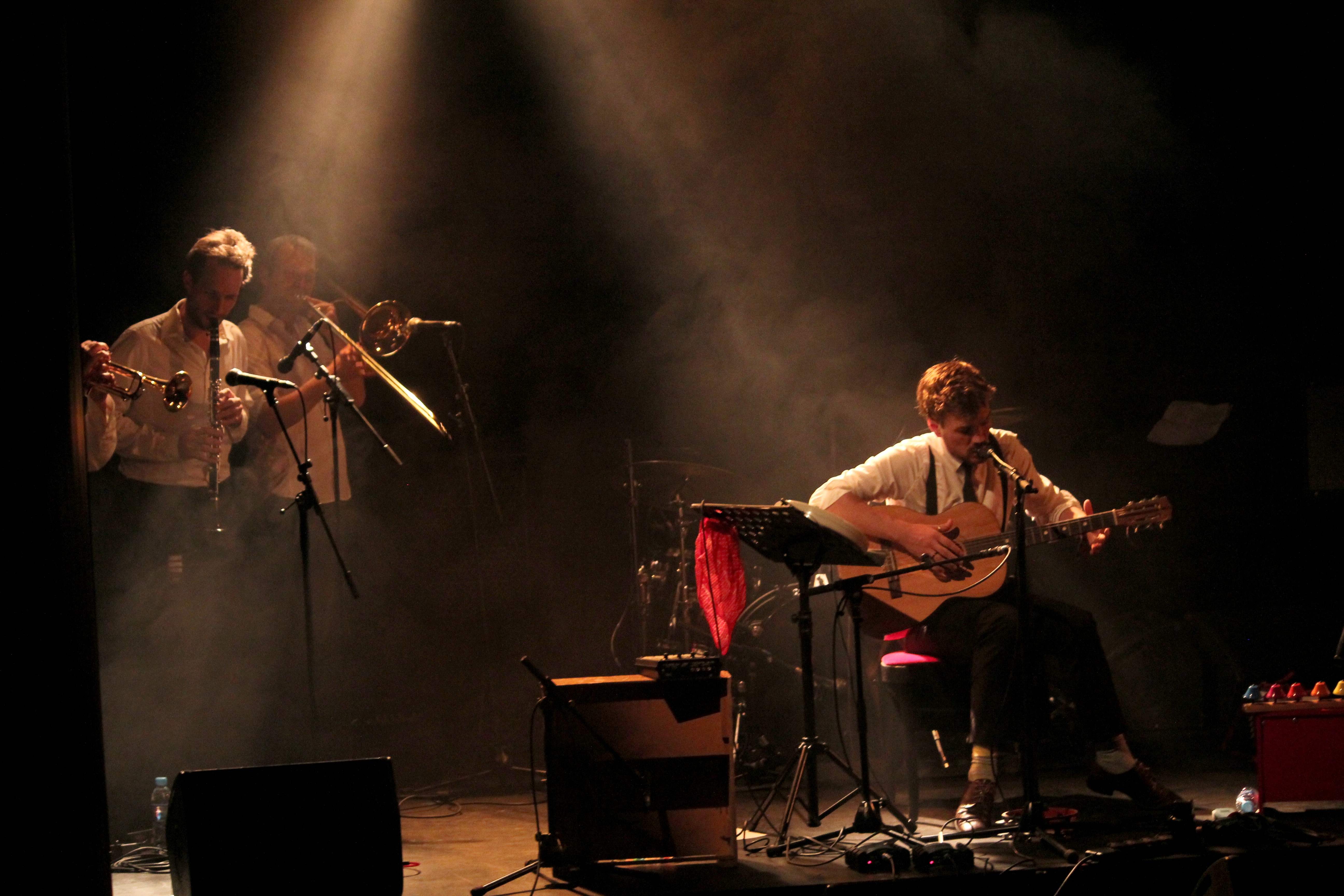 En première partie, c’est un curieux personnage qui foule la scène des Trois Baudets. Un anglais du nom de Michael Wookey, installé à Paris. L’accent totally British nous fait déjà fondre, et lorsqu’il entonne ses chansons, d’abord en guitare-voix, ce sont des cavalcades de frissons qui nous parcourent le corps. Une voix fragile et puissante à la fois, des arpèges tout en délicatesse et… des titres qui se terminent en éclats de rire. L’Anglais a quelque chose de désarmant, il fait rire et pleurer à la fois et il nous en met plein les oreilles lorsque sa troupe le rejoint sur scène. Un gros bordel musical s’installe, mais un bordel comme on entend que très rarement et comme on aimerait en entendre plus souvent.