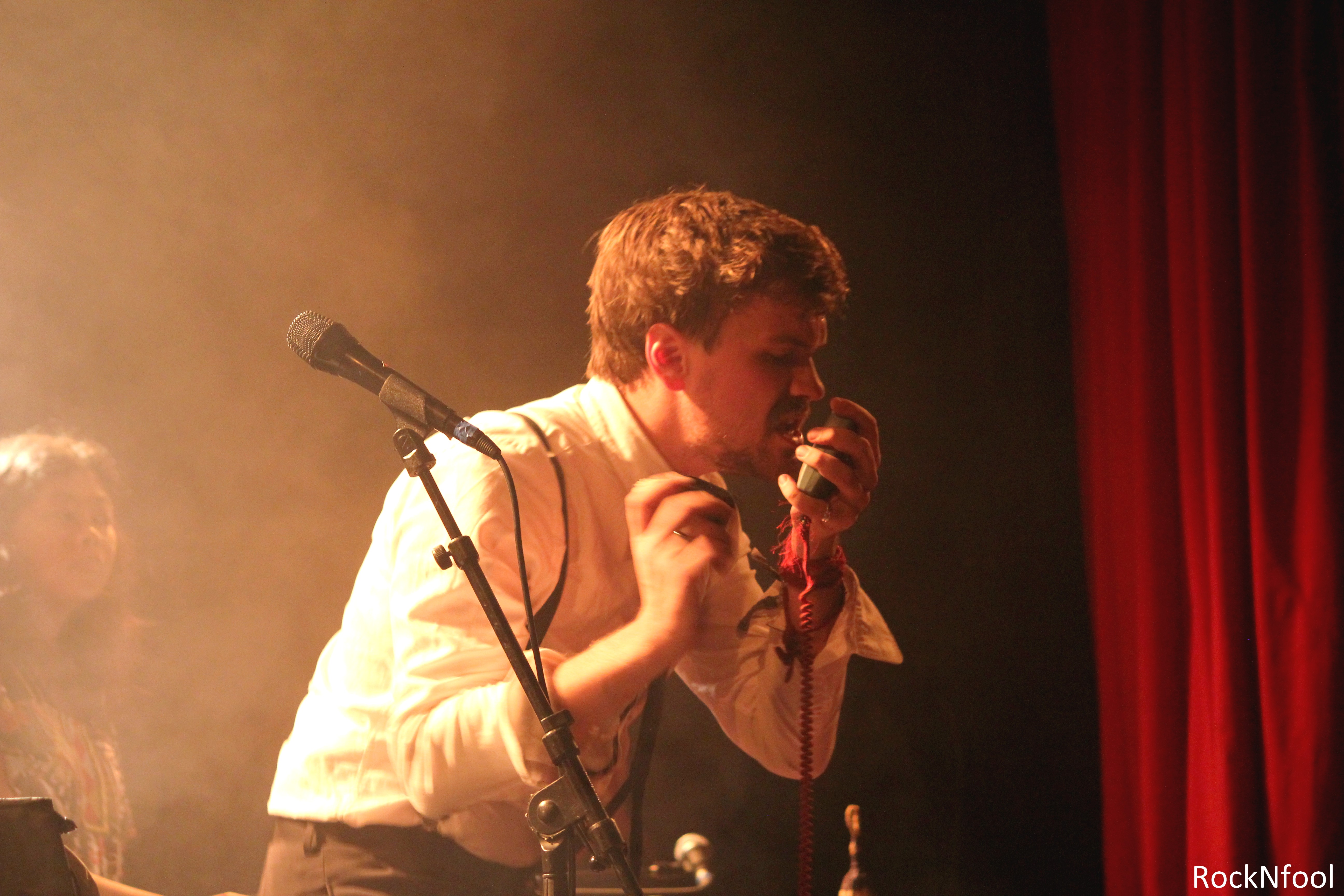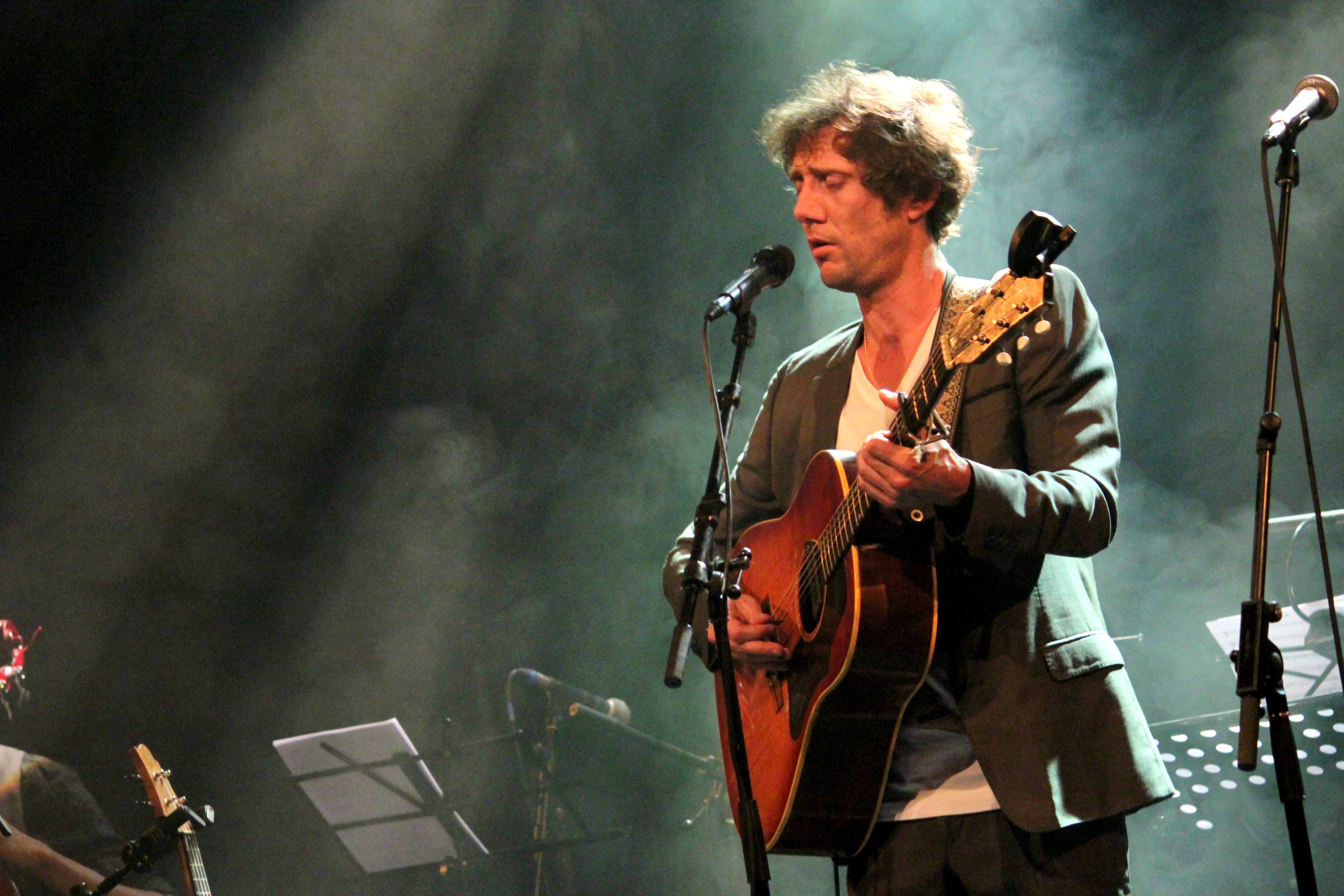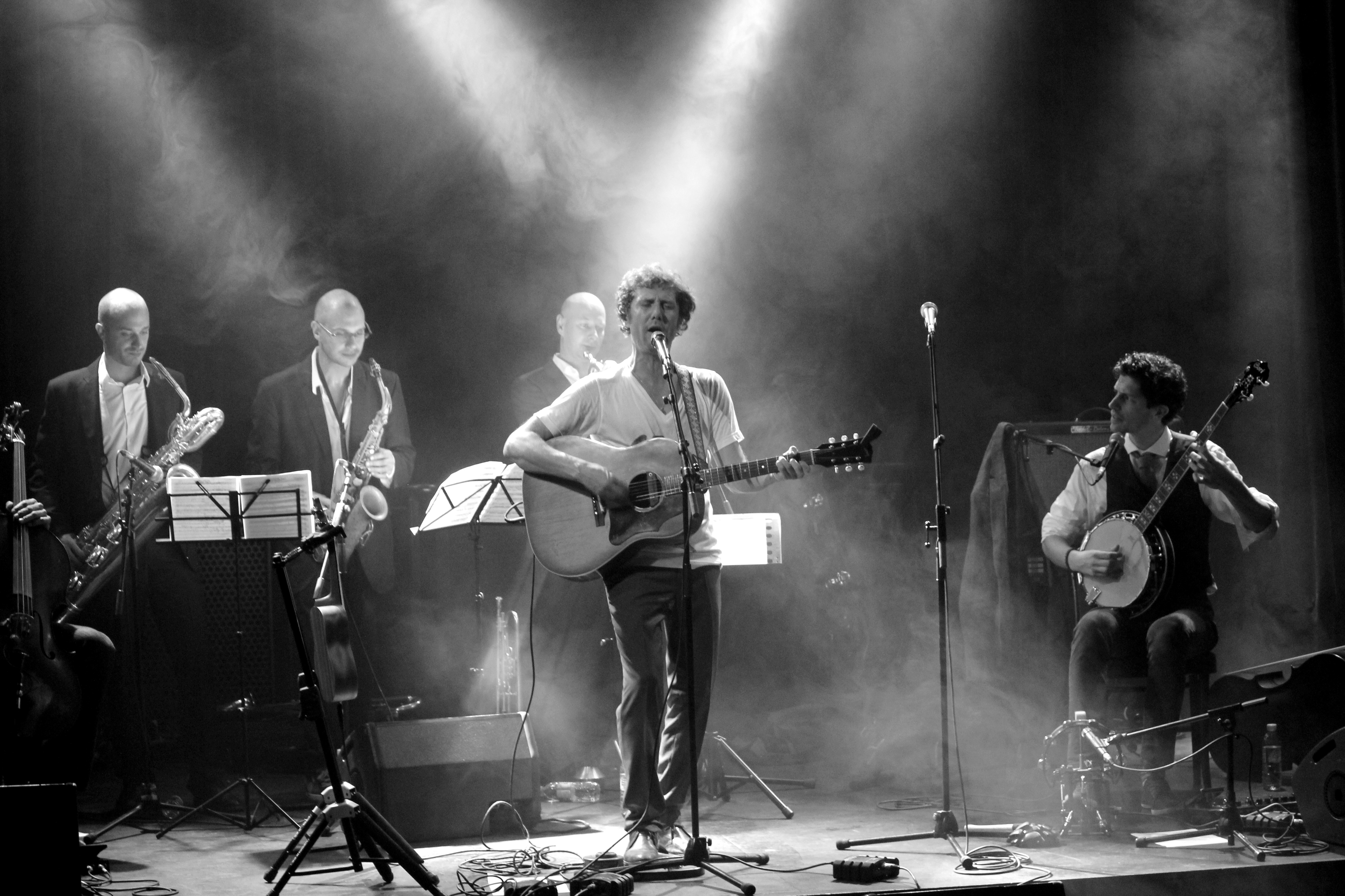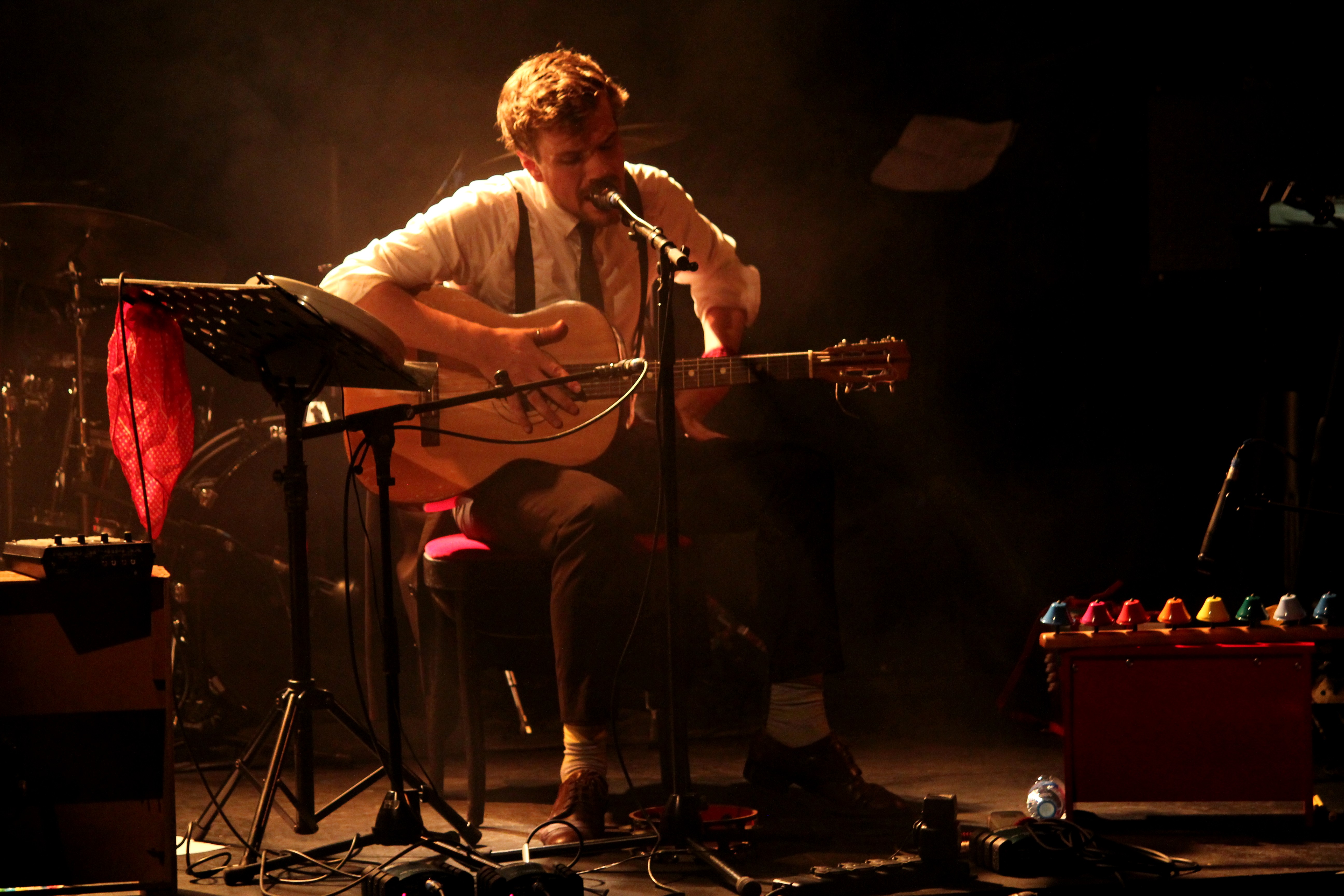 En première partie, c’est un curieux personnage qui foule la scène des Trois Baudets. Un anglais du nom de Michael Wookey, installé à Paris. L’accent totally British nous fait déjà fondre, et lorsqu’il entonne ses chansons, d’abord en guitare-voix, ce sont des cavalcades de frissons qui nous parcourent le corps. Une voix fragile et puissante à la fois, des arpèges tout en délicatesse et… des titres qui se terminent en éclats de rire. L’Anglais a quelque chose de désarmant, il fait rire et pleurer à la fois et il nous en met plein les oreilles lorsque sa troupe le rejoint sur scène. Un gros bordel musical s’installe, mais un bordel comme on entend que très rarement et comme on aimerait en entendre plus souvent.