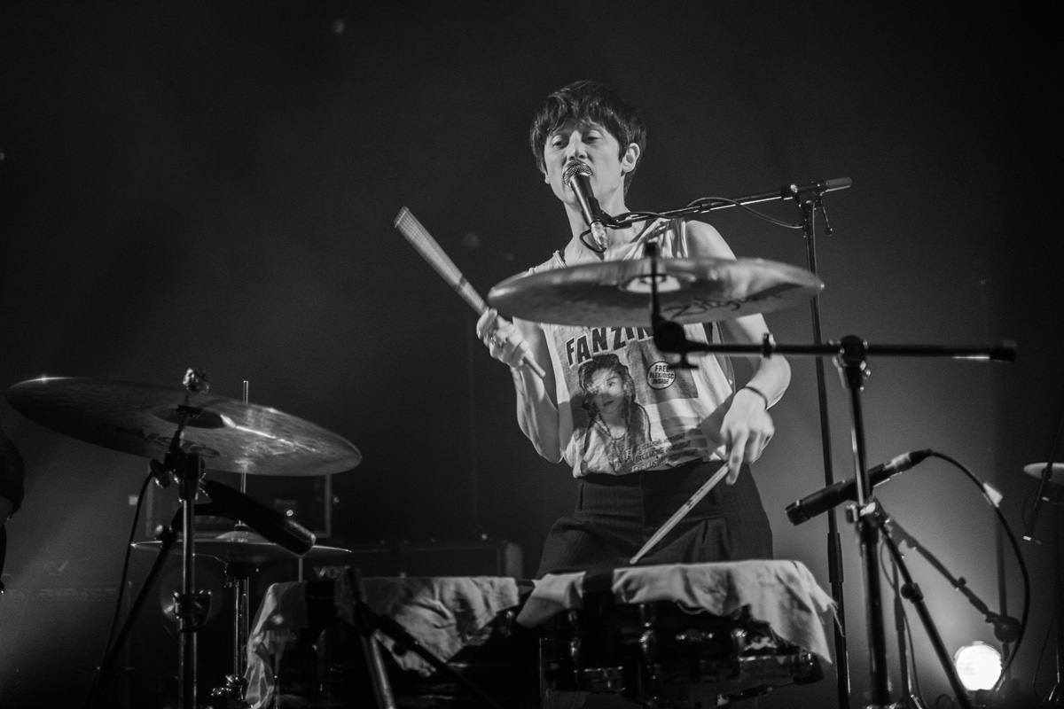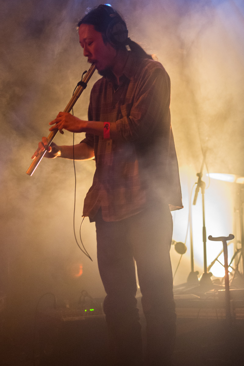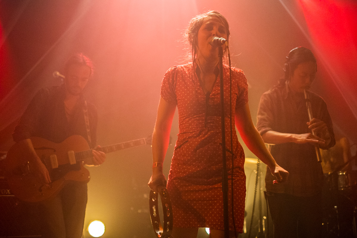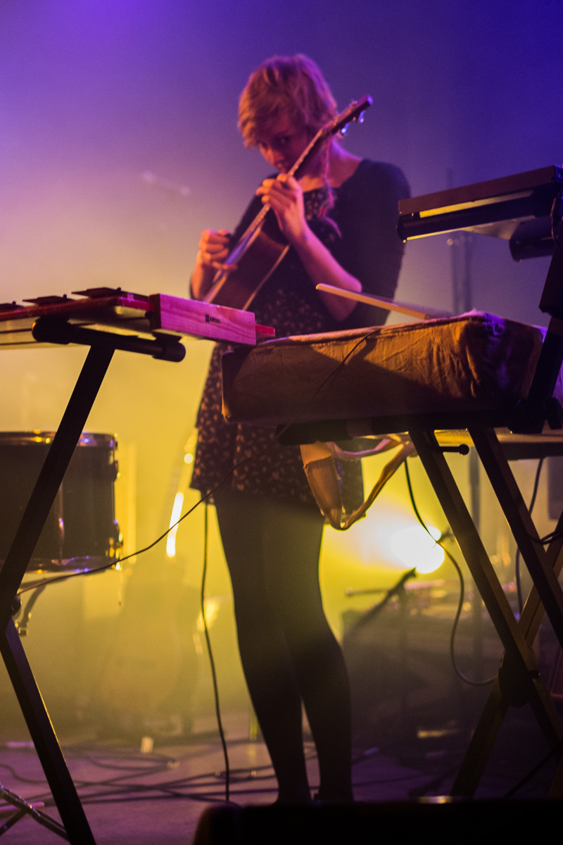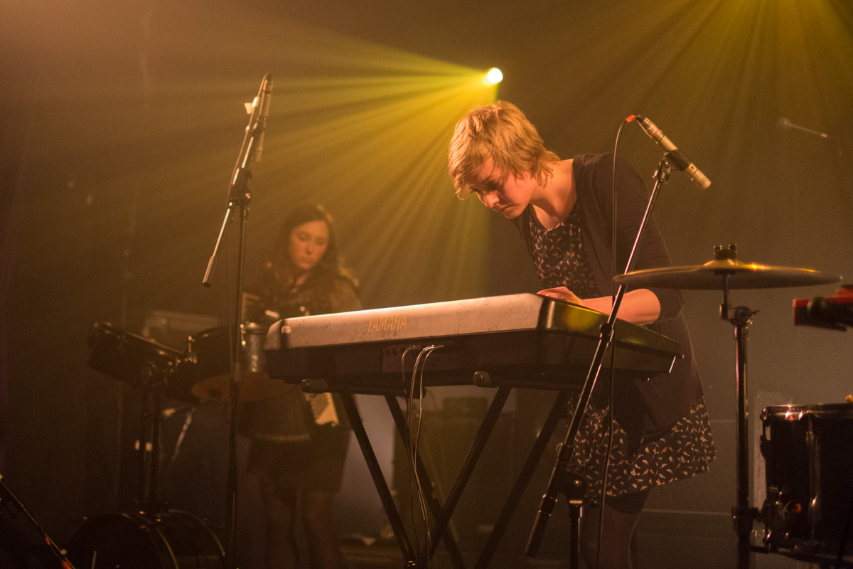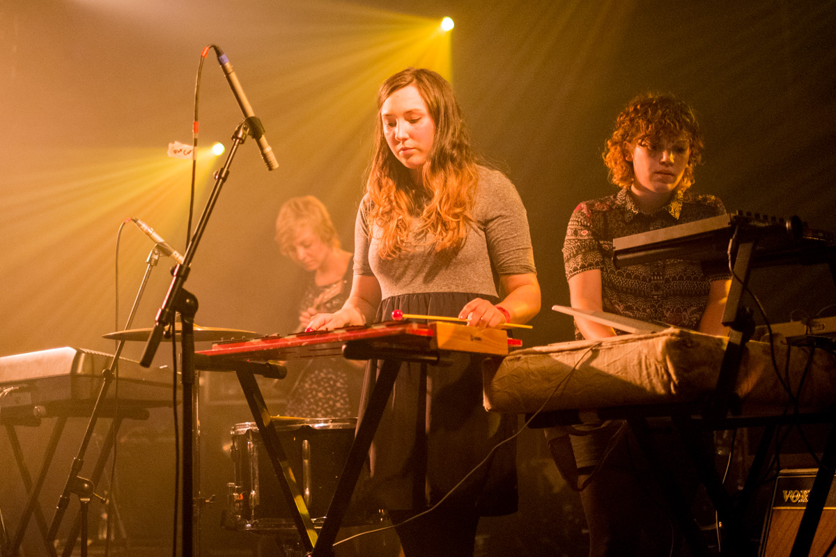 J’arrive dans la salle alors que les anglaises d’Haiku Salut viennent d’entamer leur set. Trois filles en mode autiste avec une flopée d’instruments (ukulélé, clavier, xylophone, accordéon…), quelques boucles, quelques beats et c’est parti pour mélanger tout ce qui leur tombe sous la main. Un peu de folk, des pièces à la Yann Tiersen, voir bruitiste par moment (“C’est n’importe quoi, c’est génial“), assez sympathique.