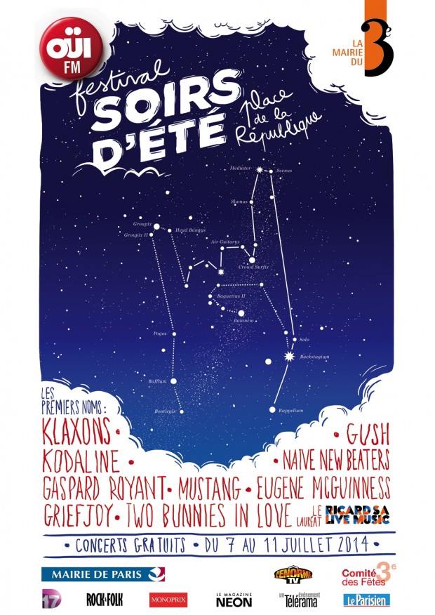 Triple saut périlleux. Danse de la joie, de la pluie, du ventre. Tout. Quand on a vu les premiers noms du festival Soirs d’été, on a oublié qu’on était lundi, qu’il faisait tout gris et qu’au bureau, C’EST. LA. MORT. On avait déjà noté dans notre agenda les jours de l’édition 2014. Soirs d’été, cette année c’est du 7 au 11 juillet, toujours sur la place de la République à Paris et on sait déjà qui on y trouvera : Klaxons, Kodaline, Gush, Naive New Beaters, Gaspard Royant, Mustang, Eugene McGuinness, Griefjoy et Two bunnies in love ! C’est qu’un début mais c’est déjà une petite tuerie. La suite de la programmation arrive bientôt.