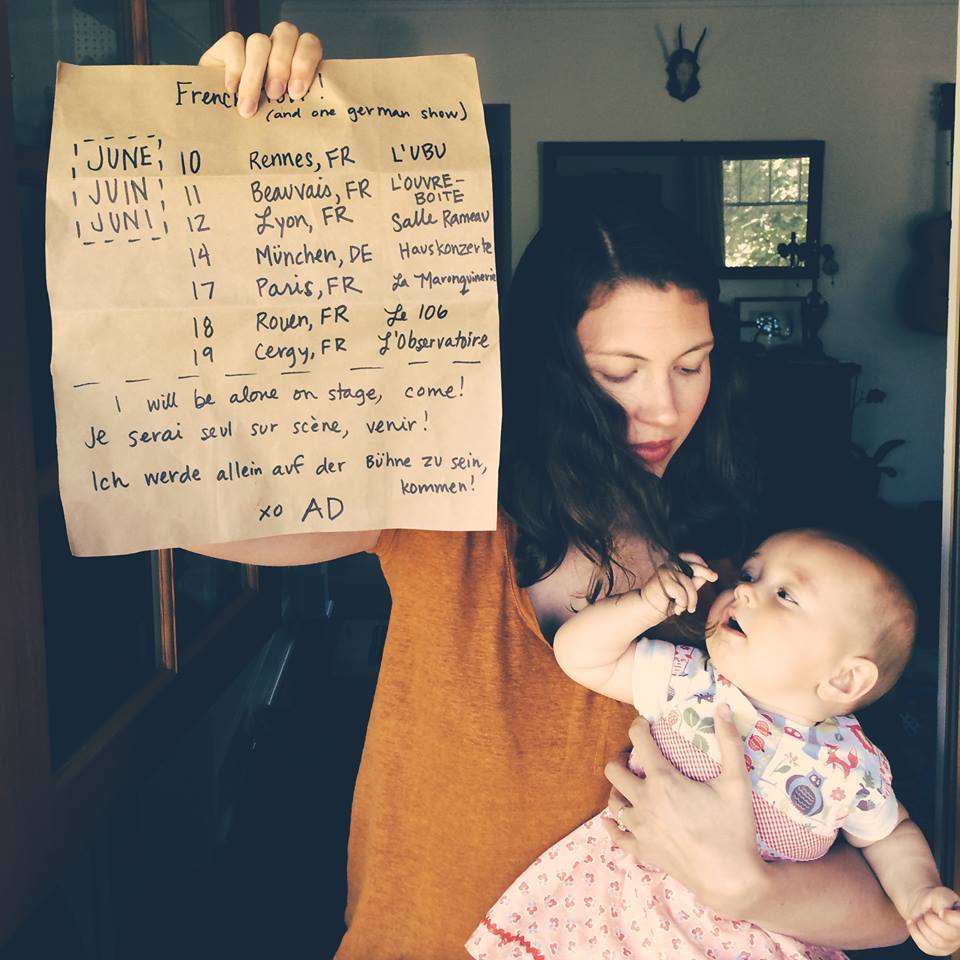 A: Et bien nous n’écoutons pas beaucoup de musique dernièrement… Je n’ai écouté que le son de mon bébé en train de pleurer depuis le début de la tournée ! Je n’ai même pas emmené d’écouteurs étant donné que je trouve important de rester disponible pour Vera. Mais à la maison nous avons beaucoup écouté le dernier Damien Jurado qui est vraiment magnifique, surtout la version avec le LP qui contient les titres en version acoustique avec une chorale. Et sinon il y a toujours de vieux disques qui tournent chez nous…
