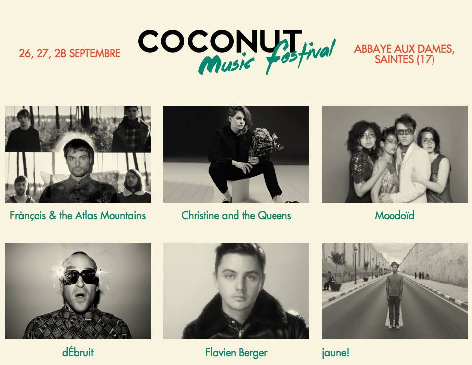 Parce qu’un festival de musique ce n’est pas forcément dans les champs et la boue. Parce que t’as pas besoin d’aller à Honolulu pour déconnecter et chercher de l’exotisme. Tu peux aller en Charente-Maritime pour le Coconut Music Festival. Un festival étonnant qui se déroule à Saintes, dans l’Abbaye aux Dames et qui se tient du 26 au 28 septembre. Côté programmation, c’est excellent : François and the Atlas Mountains, Christine and The Queens, Tuff Love, Moodoïd, JC Satan, Sean Nicholas Savage, Petit Fantôme, Tahiti Boy & The Palmtree Family etc…