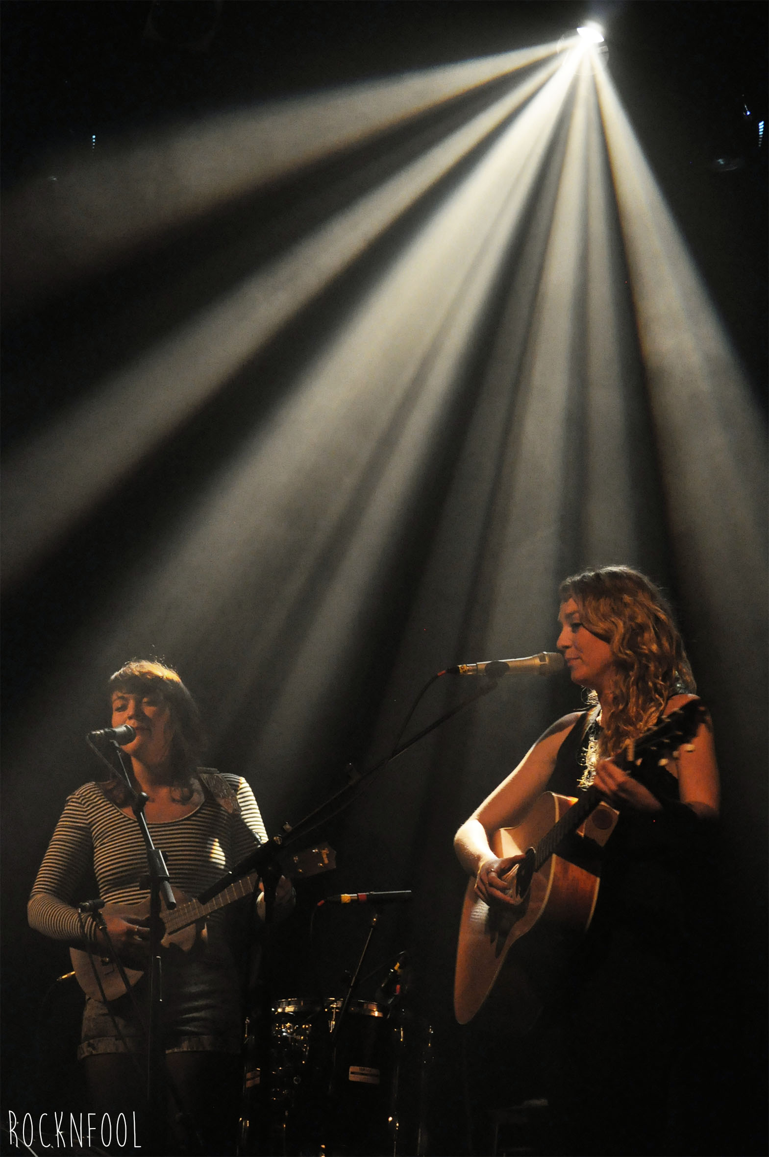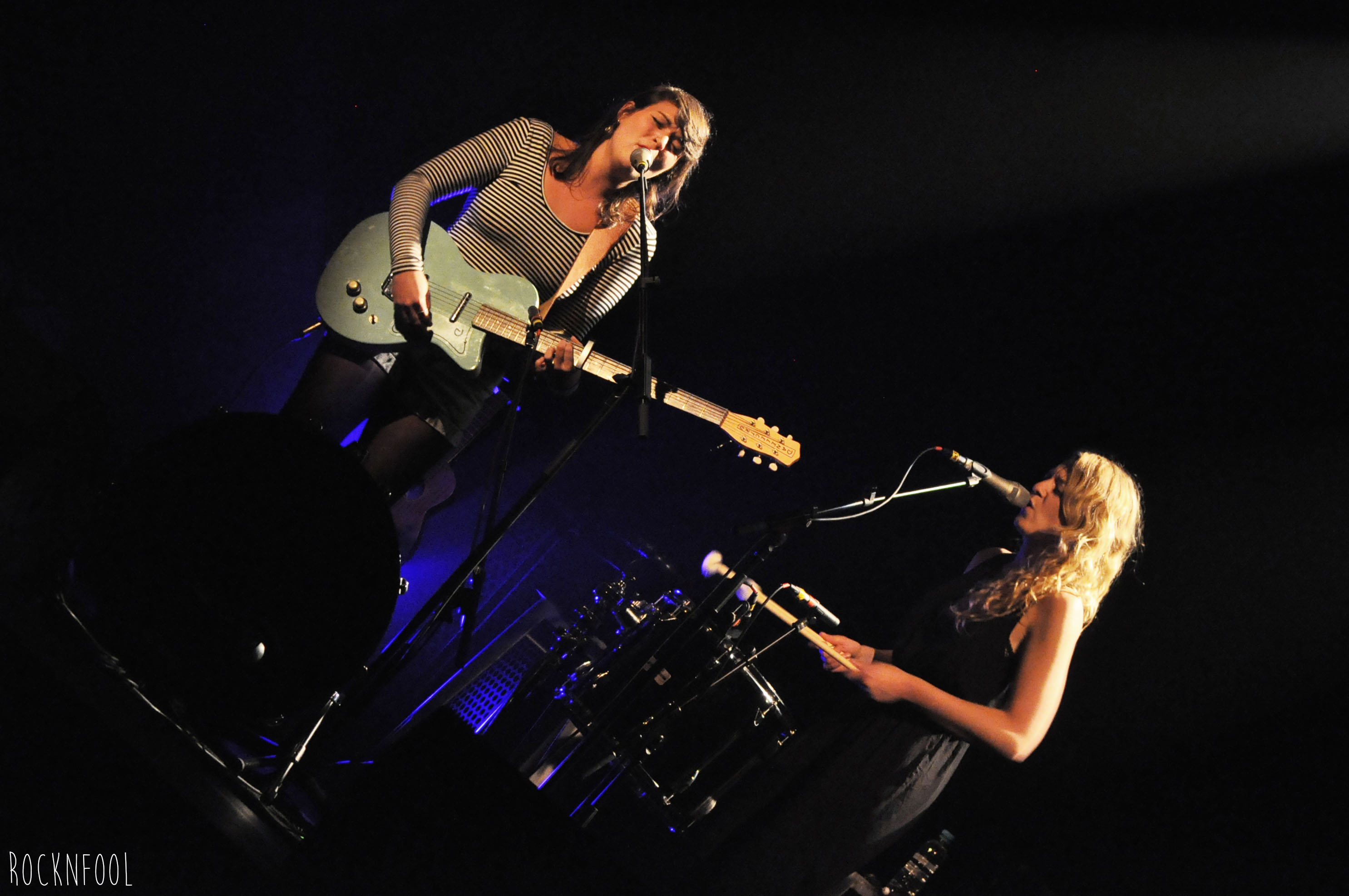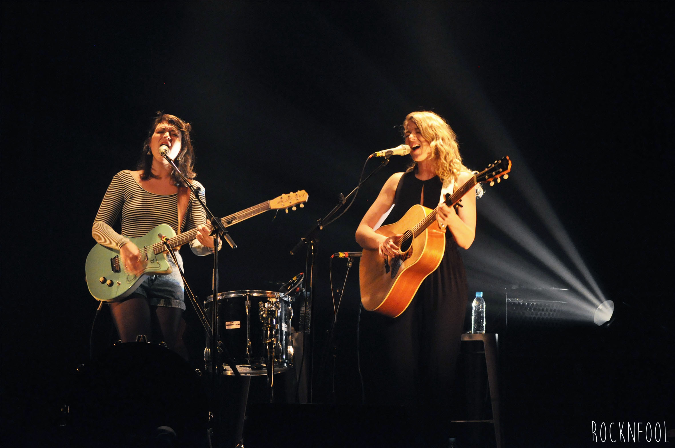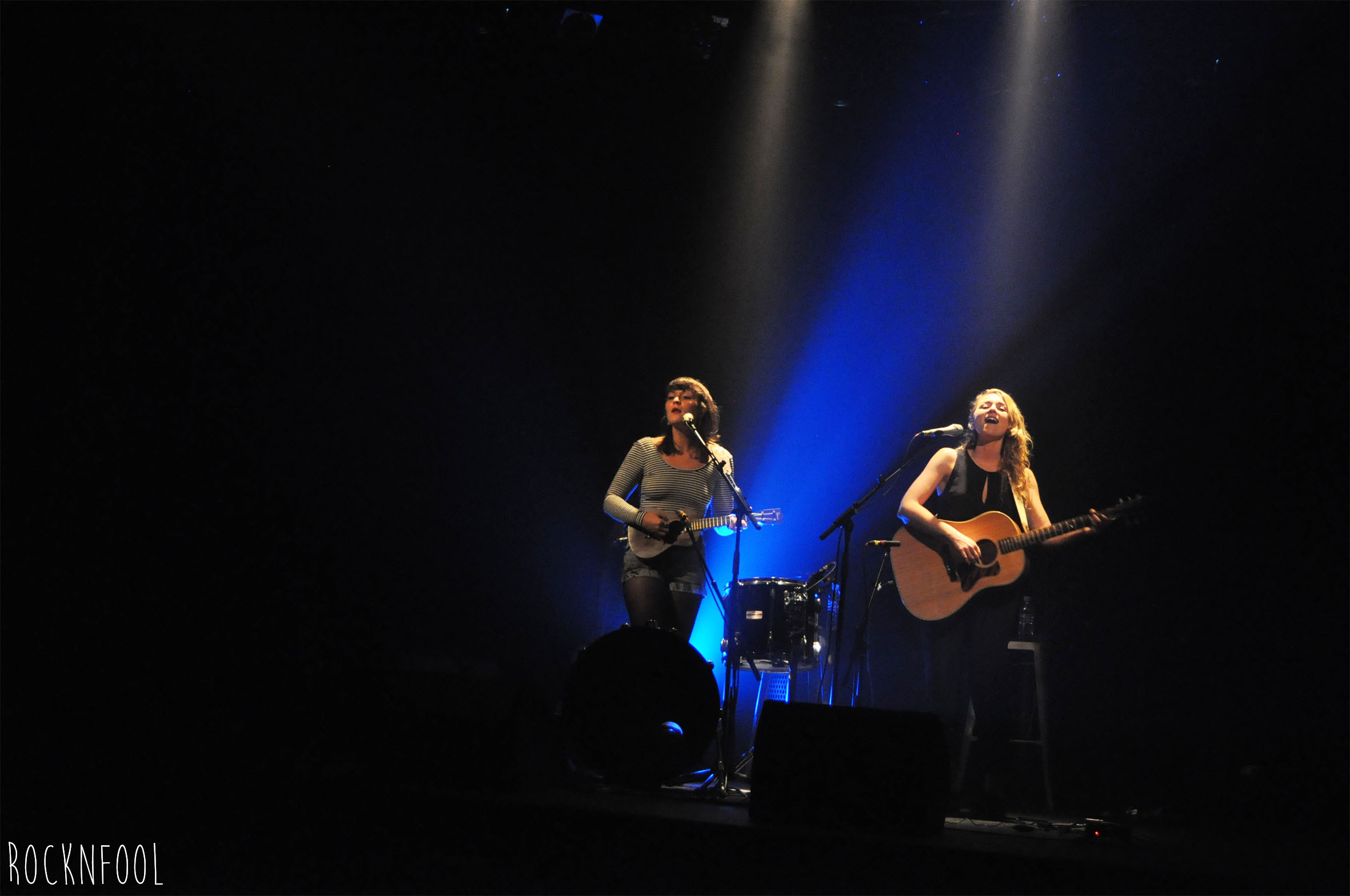 Hier soir aux Trois Baudets, je me sentais un peu comme la guest-star du public parce que missionnée spécialement par RockNFool. Lorsque le rideau s’est ouvert sur les guitares, les tomes/grosse caisse et le large sourire des Sœurs Boulay, j’étais déjà conquise. Elles ont été magiques. Tout commence par la très poétique chanson Cul-de-sac et après seulement quelques mesures, la sangle d’une des sœurs qui lâche et – sans mauvais jeu de mot – ça tombe plutôt bien. Oui, merci de réduire la reverb’ de la guitare. Elles font une petite blague et hop c’est reparti ! Je me demande presque si cette histoire de sangle ne serait pas un coup monté pour rendre l’ambiance familiale, détendue et du style on-joue-dans-ton-salon-juste-pour-toi. D’ailleurs en fin de concert elles descendent au milieu du public pour chanter en acoustique – et jouer du kazoo !