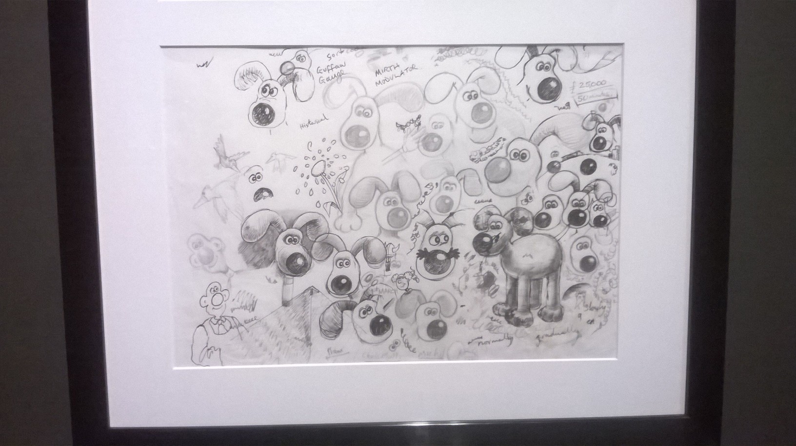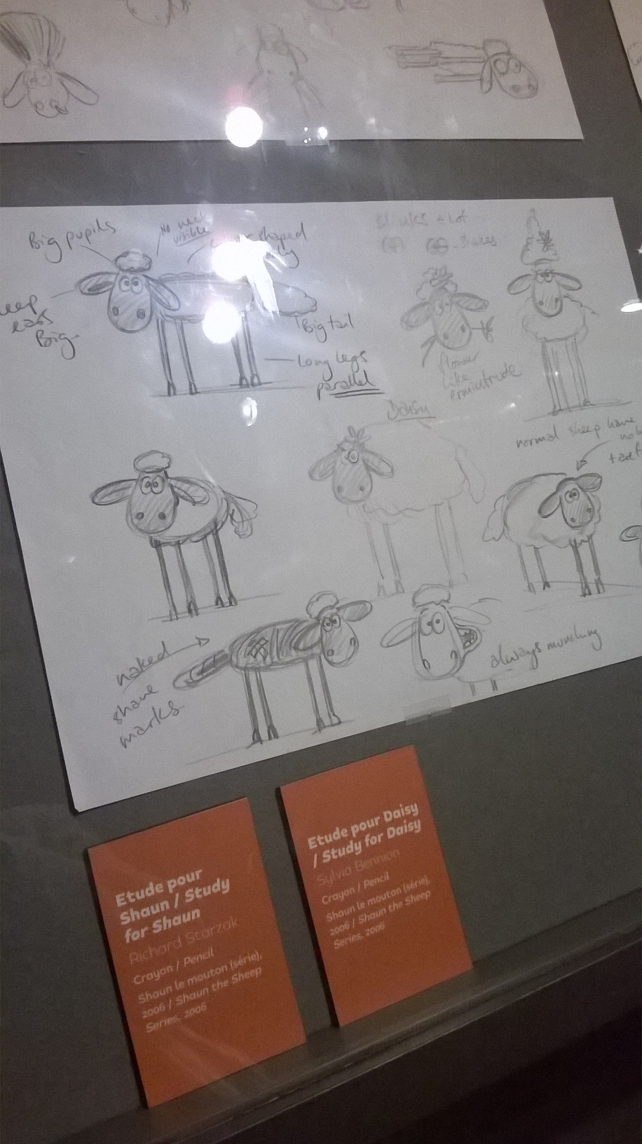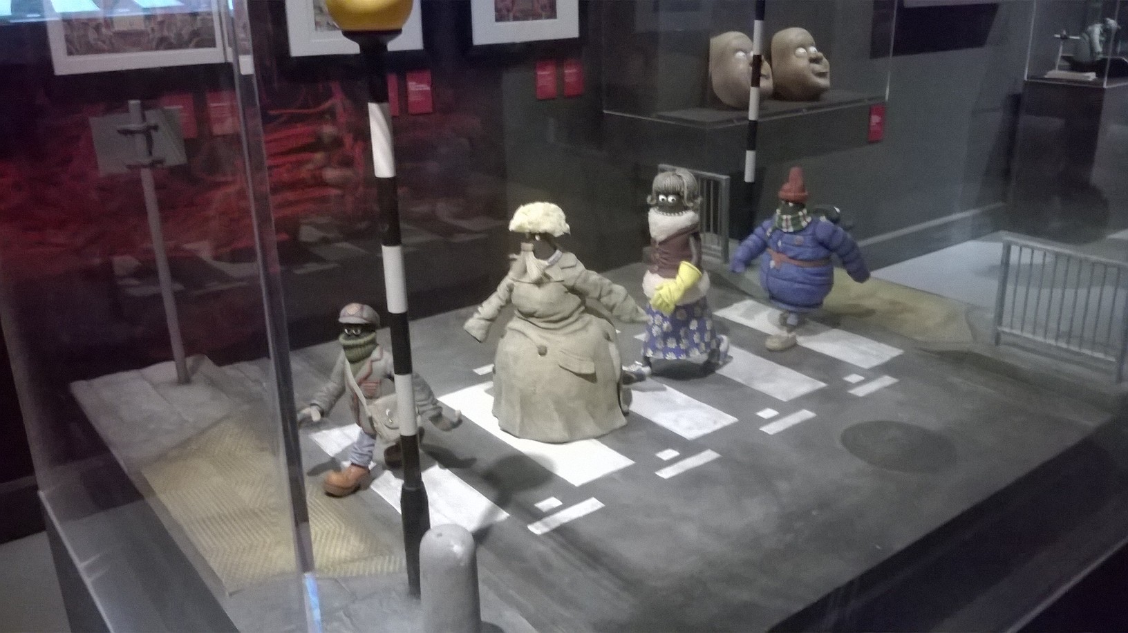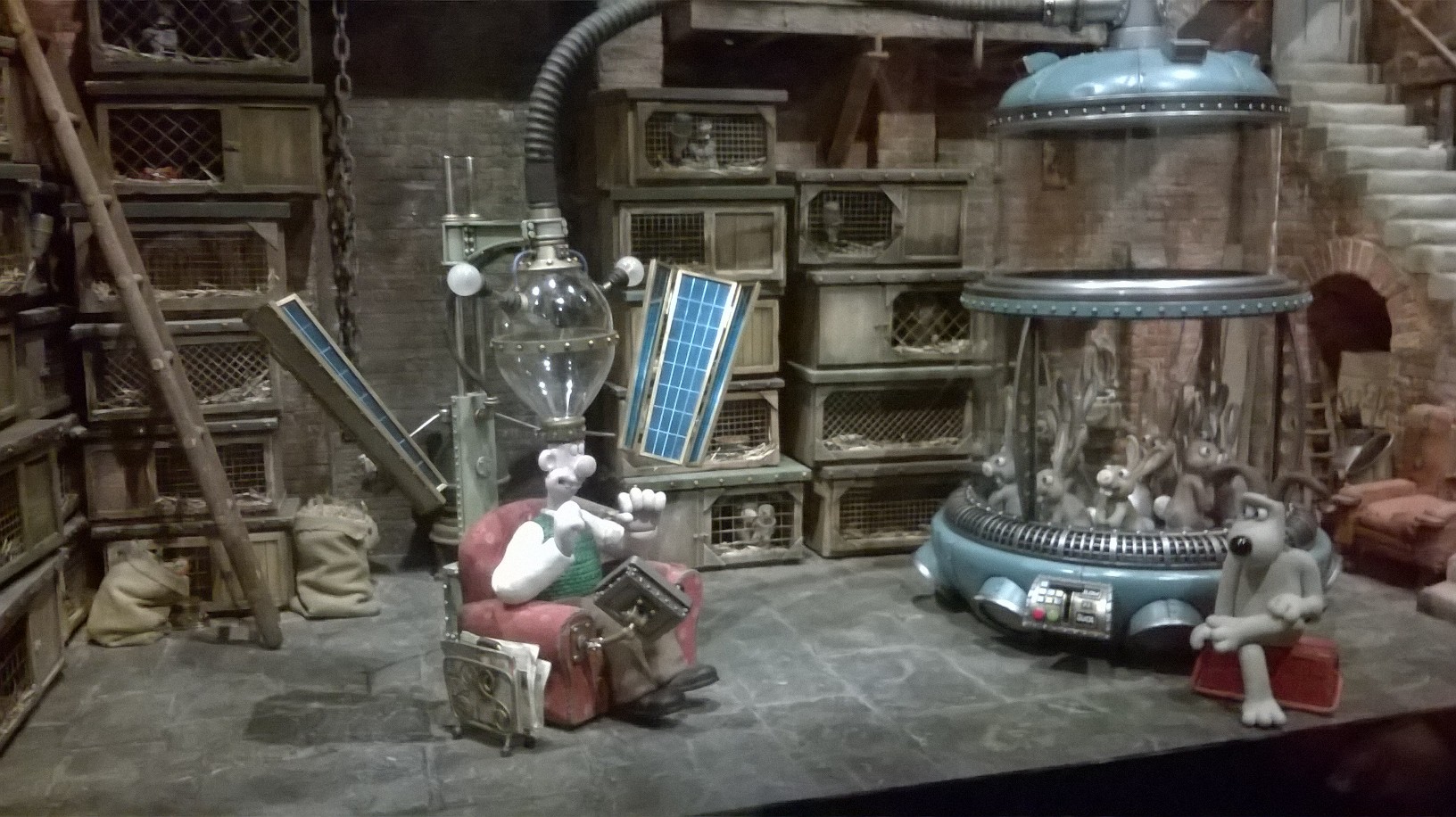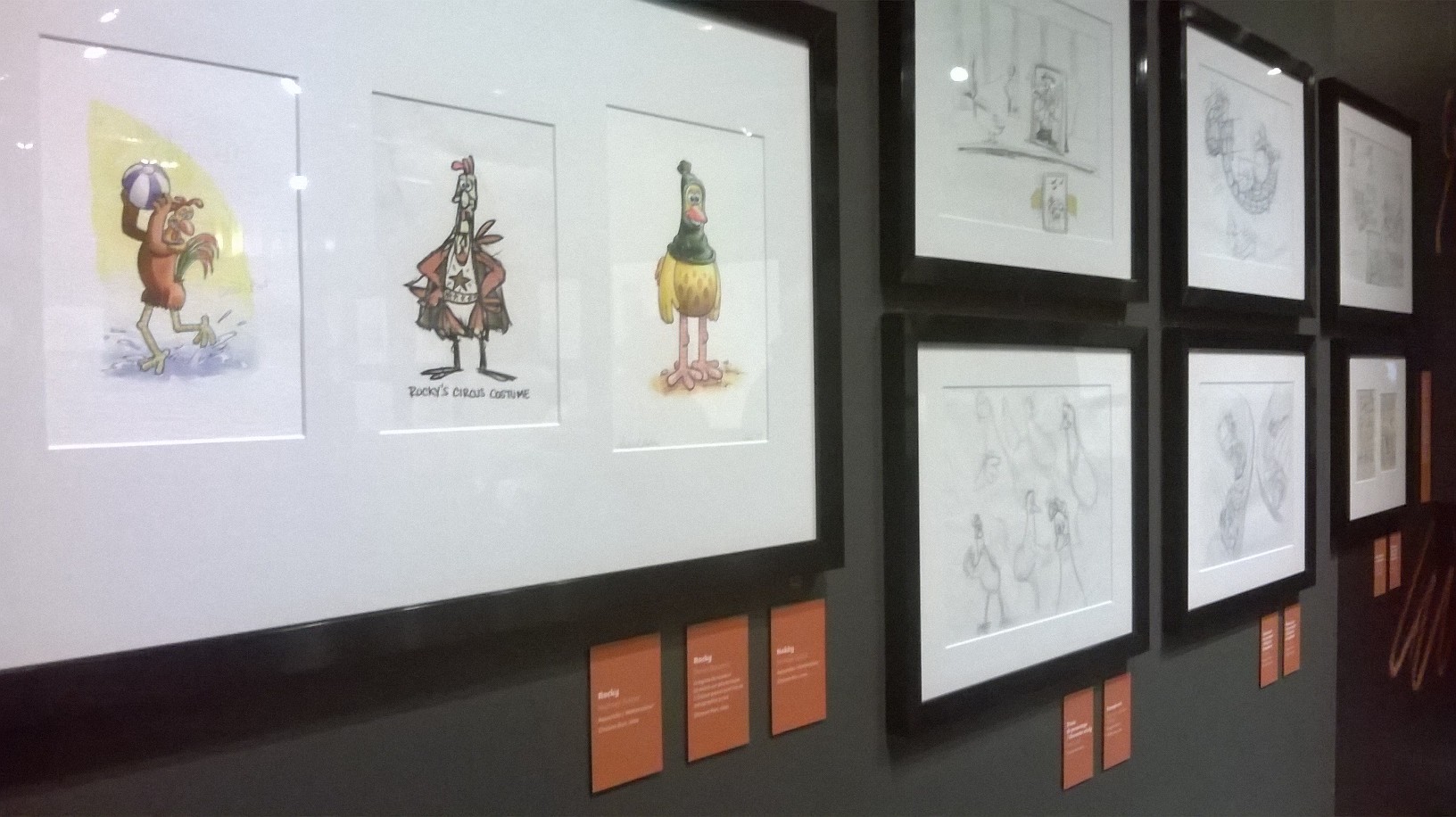 L’exposition est organisée sobrement dans les salles (un peu glauques) de l’Art Ludique, avec tuyaux et cables apparents. Tout le parcours se fait dans des salles aux murs noirs-gris, ornés de quelques esquisses unicolores de dessins des héros d’Aardman. Quelques encarts au début de chaque salle présentent gauchement quelques explications (les plus courageux prendront un audioguide qui finit par atterrir dans la poche à mi-parcours). C’est sobre, la muséographie tend plutôt à mettre en valeur, par de jolies lumières, les objets exposés.