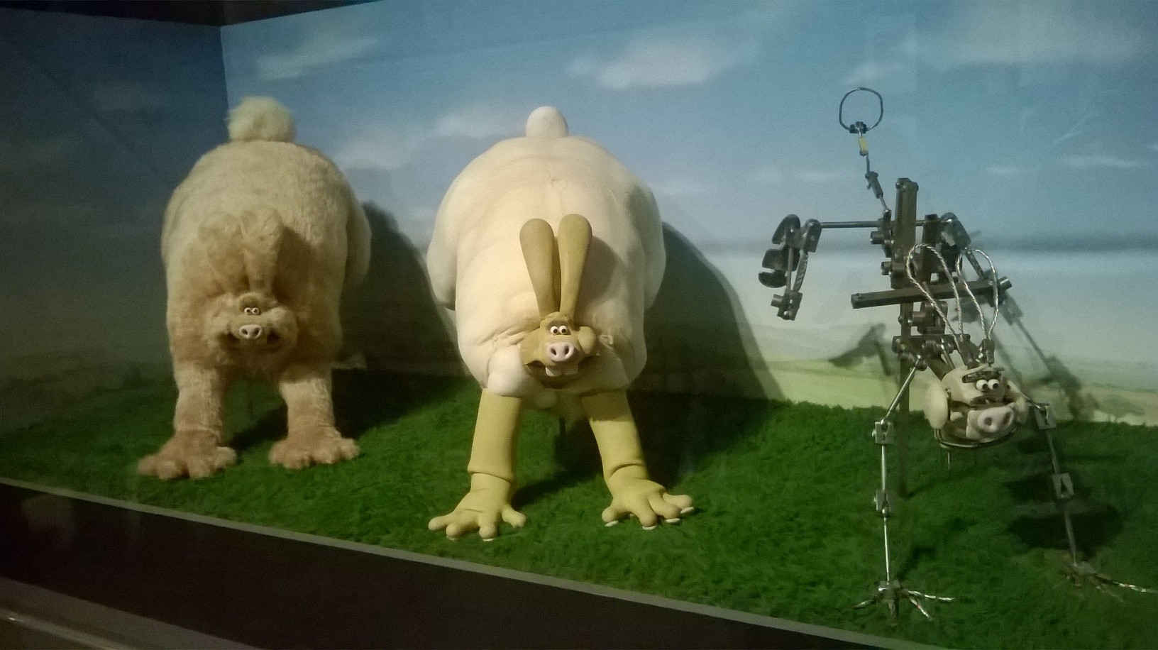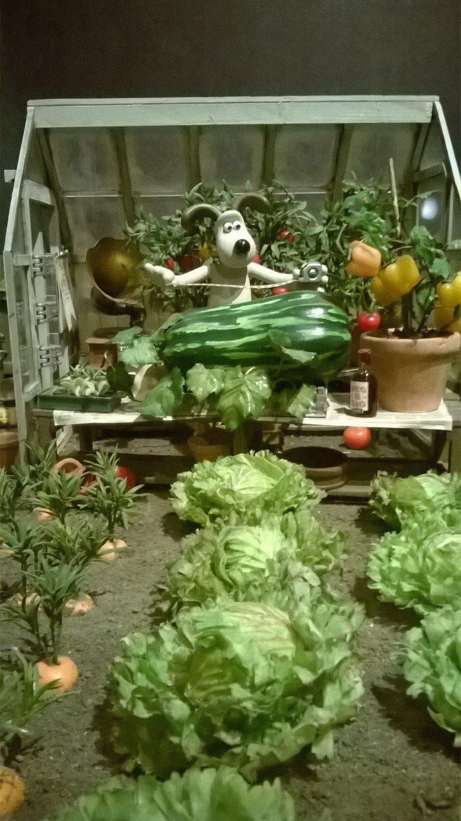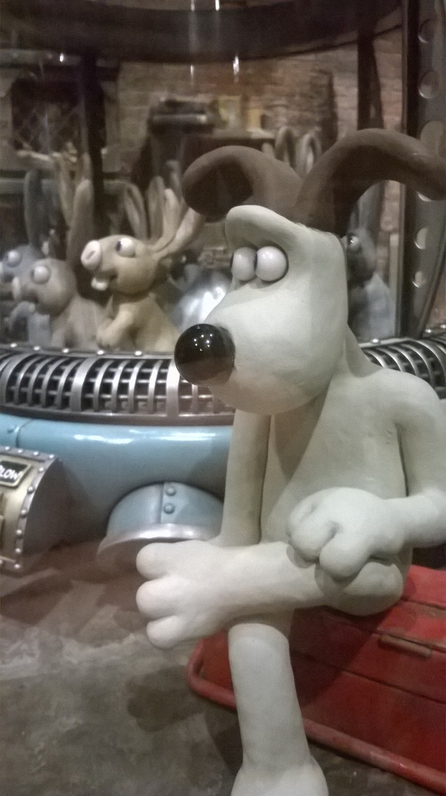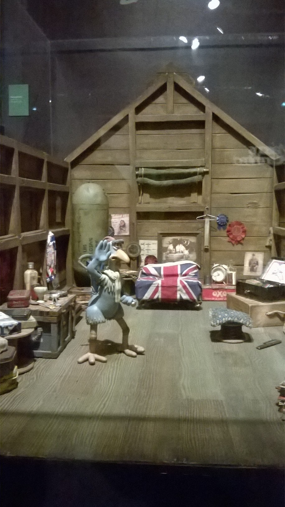 L’exposition est organisée sobrement dans les salles (un peu glauques) de l’Art Ludique, avec tuyaux et cables apparents. Tout le parcours se fait dans des salles aux murs noirs-gris, ornés de quelques esquisses unicolores de dessins des héros d’Aardman. Quelques encarts au début de chaque salle présentent gauchement quelques explications (les plus courageux prendront un audioguide qui finit par atterrir dans la poche à mi-parcours). C’est sobre, la muséographie tend plutôt à mettre en valeur, par de jolies lumières, les objets exposés.