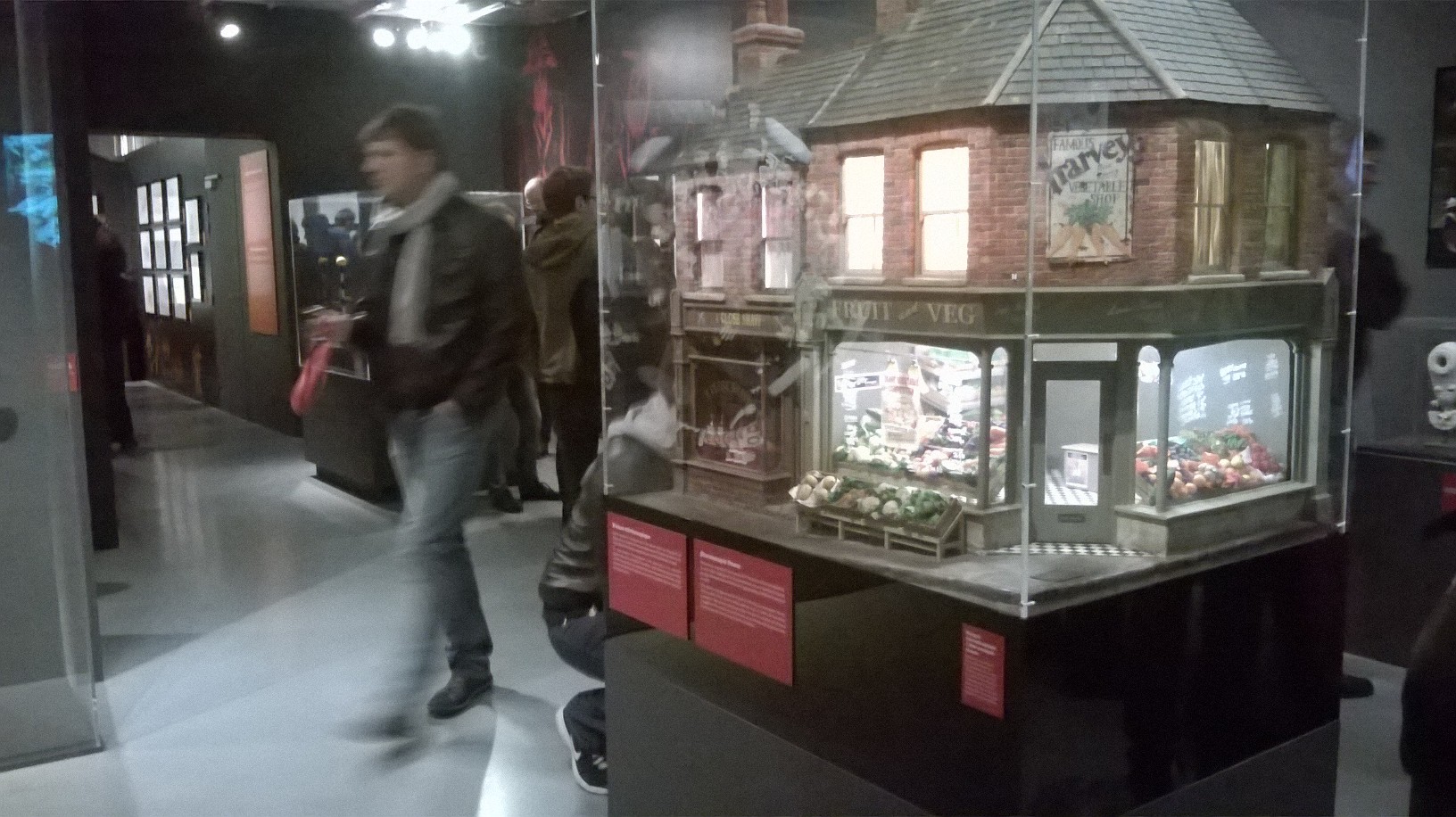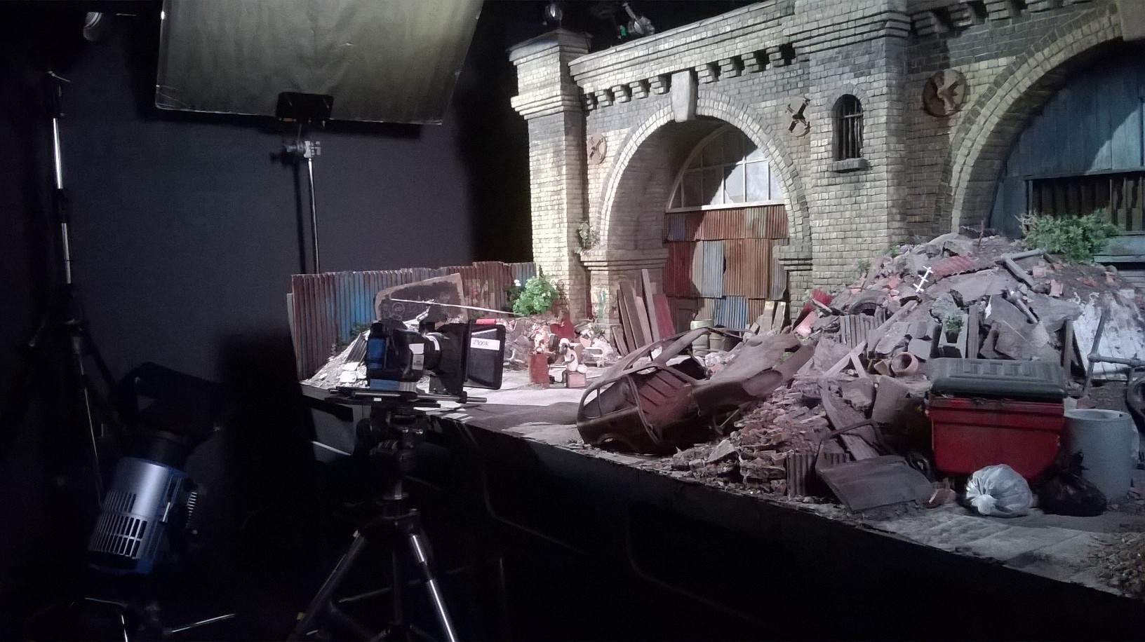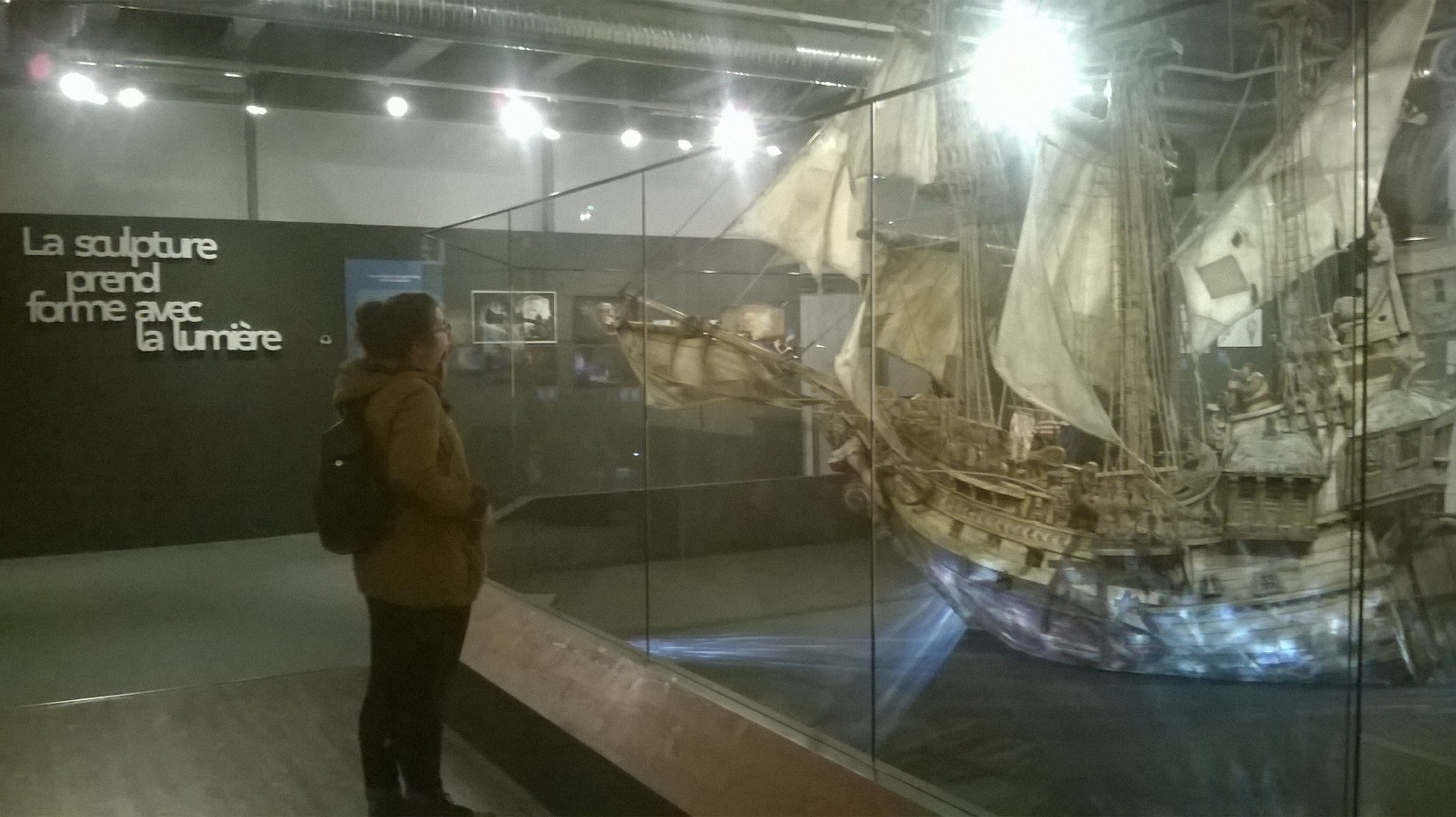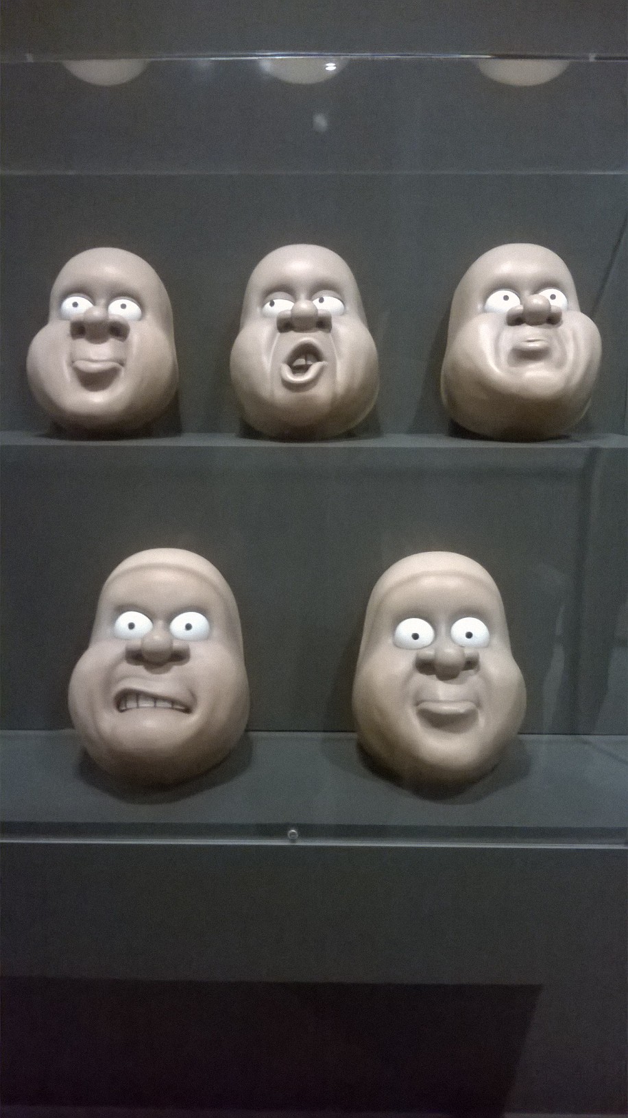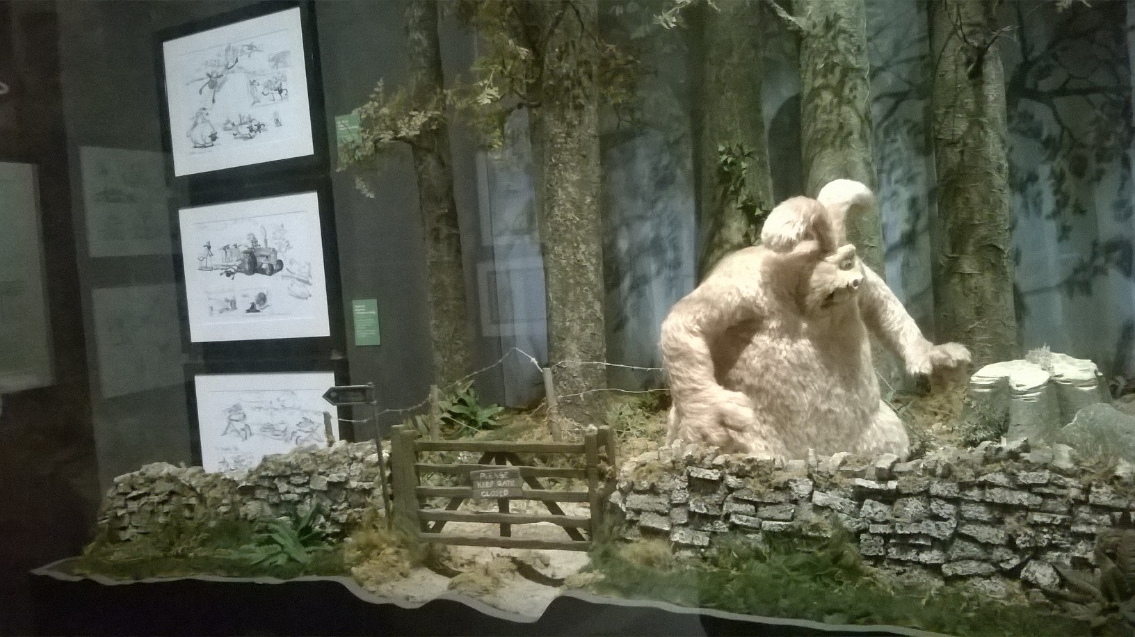 L’exposition est organisée sobrement dans les salles (un peu glauques) de l’Art Ludique, avec tuyaux et cables apparents. Tout le parcours se fait dans des salles aux murs noirs-gris, ornés de quelques esquisses unicolores de dessins des héros d’Aardman. Quelques encarts au début de chaque salle présentent gauchement quelques explications (les plus courageux prendront un audioguide qui finit par atterrir dans la poche à mi-parcours). C’est sobre, la muséographie tend plutôt à mettre en valeur, par de jolies lumières, les objets exposés.