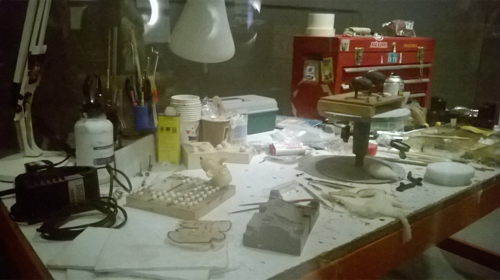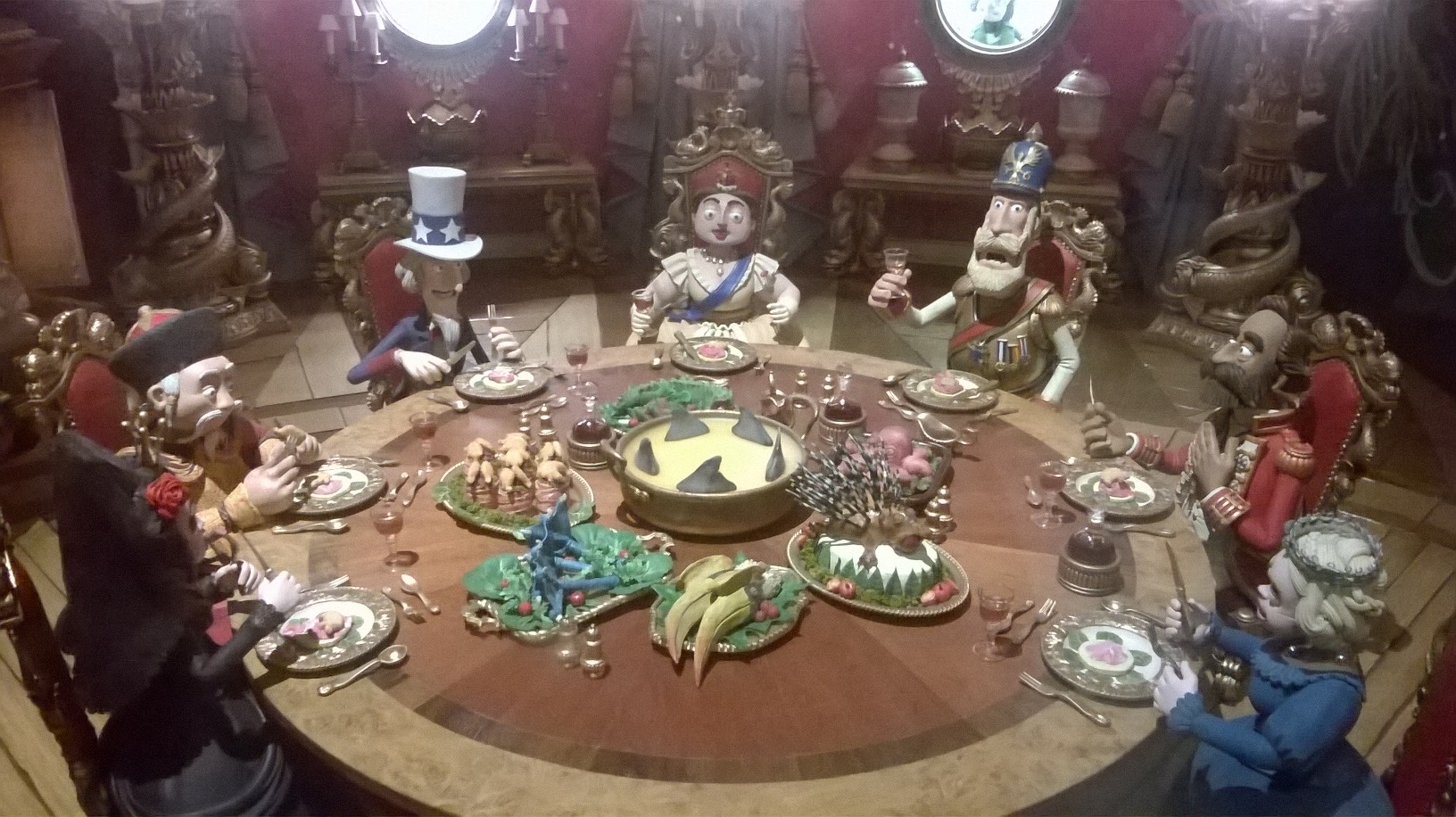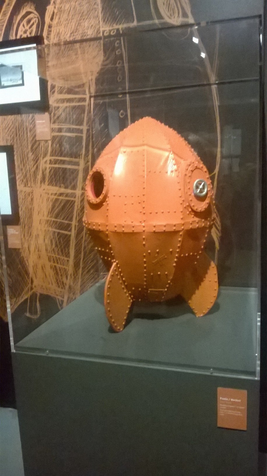 On commence par un historique des studios, qui, quoi, où, comment. Puis on entre dans le feu de l’action, en suivant progressivement le cheminement d’une idée, à un film, d’un croquis à la fabrication méticuleuse d’une maquette modelée dans ses moindres spécificités. Vidéos explicatives, dessins parsemés d’indications croustillantes, vitrines de modelages, carnet de croquis… le visiteur ne sait plus où donner de la tête. On a particulièrement bien aimé les extraits de vidéos recontextualisant l’utilisation des objets exposés dans les longs-métrages, leur redonnant vie ; les superbes dessins techniques de coques de bateau et d’inventions folles ; les étapes de la fabrication du lapin-garou ; mais surtout, on doit l’admettre, les maquettes sculptées fournies de détails des personnages modelés dans leur environnement.