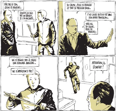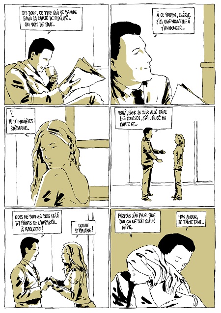Ce récit-choral apporte à chaque planche son lot de surprises et de situations loufoques. Tout le monde y va de son commentaire sur la terrible affaire de celui-qui-n’avait-pas-sa-carte-de-fidélité : la boulangère, les vieux, le présentateur du J.T., la mère de famille, le couple… Et tous leurs propos semblent à la fois si inconcevables et si réels qu’on ne sait plus où donner de la tête. Le récit semble être le fruit d’une improvisation délirante, Fabcaro n’a aucune limite. Et pourtant, tout semble si banal.