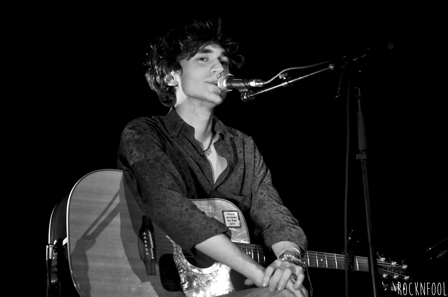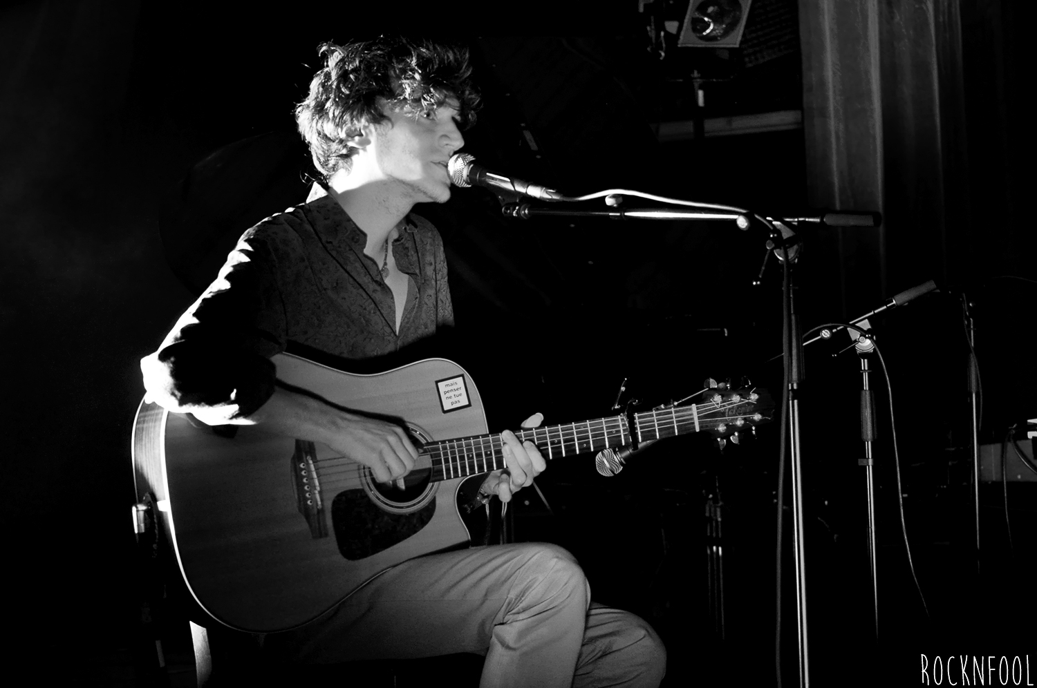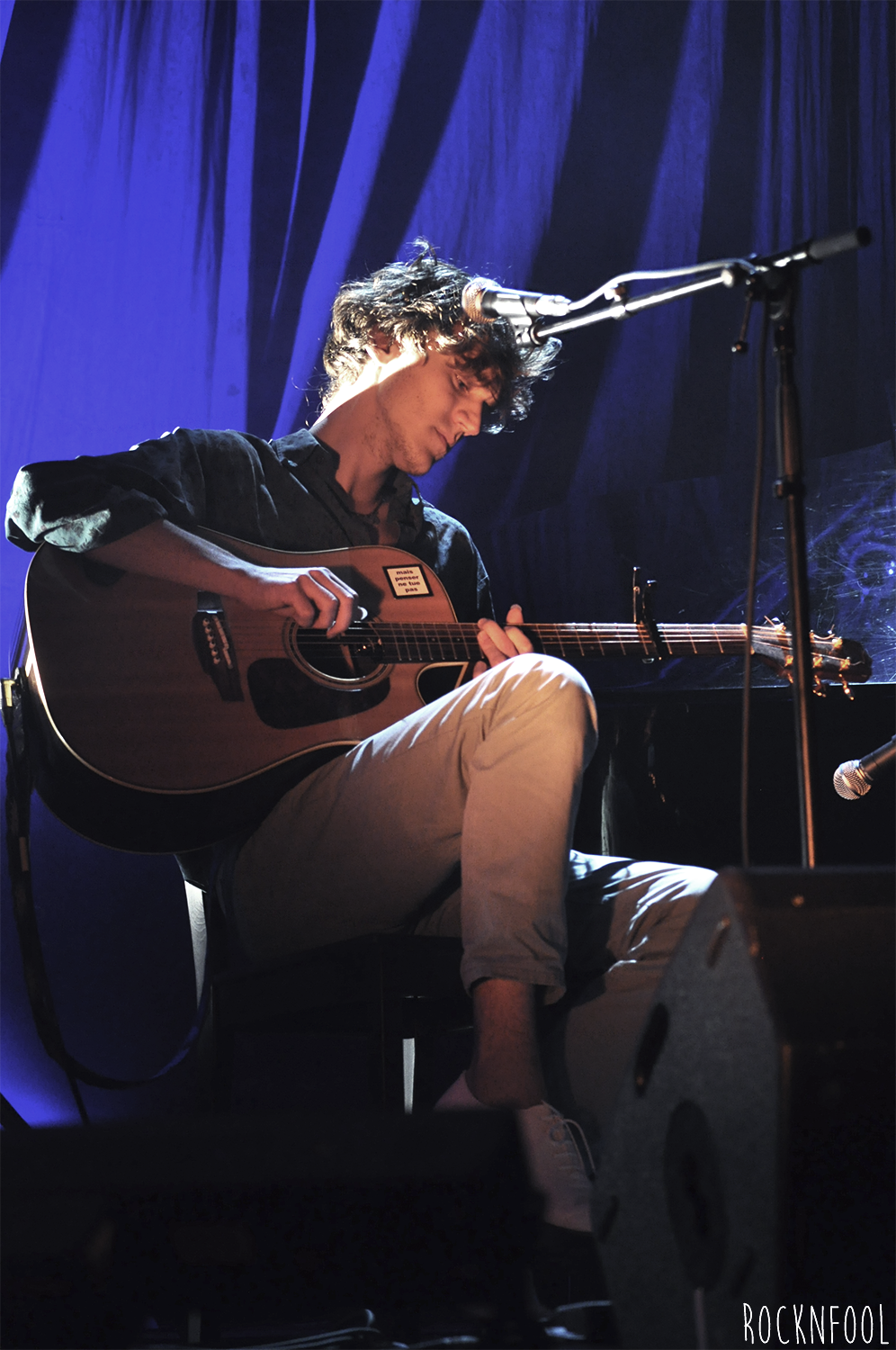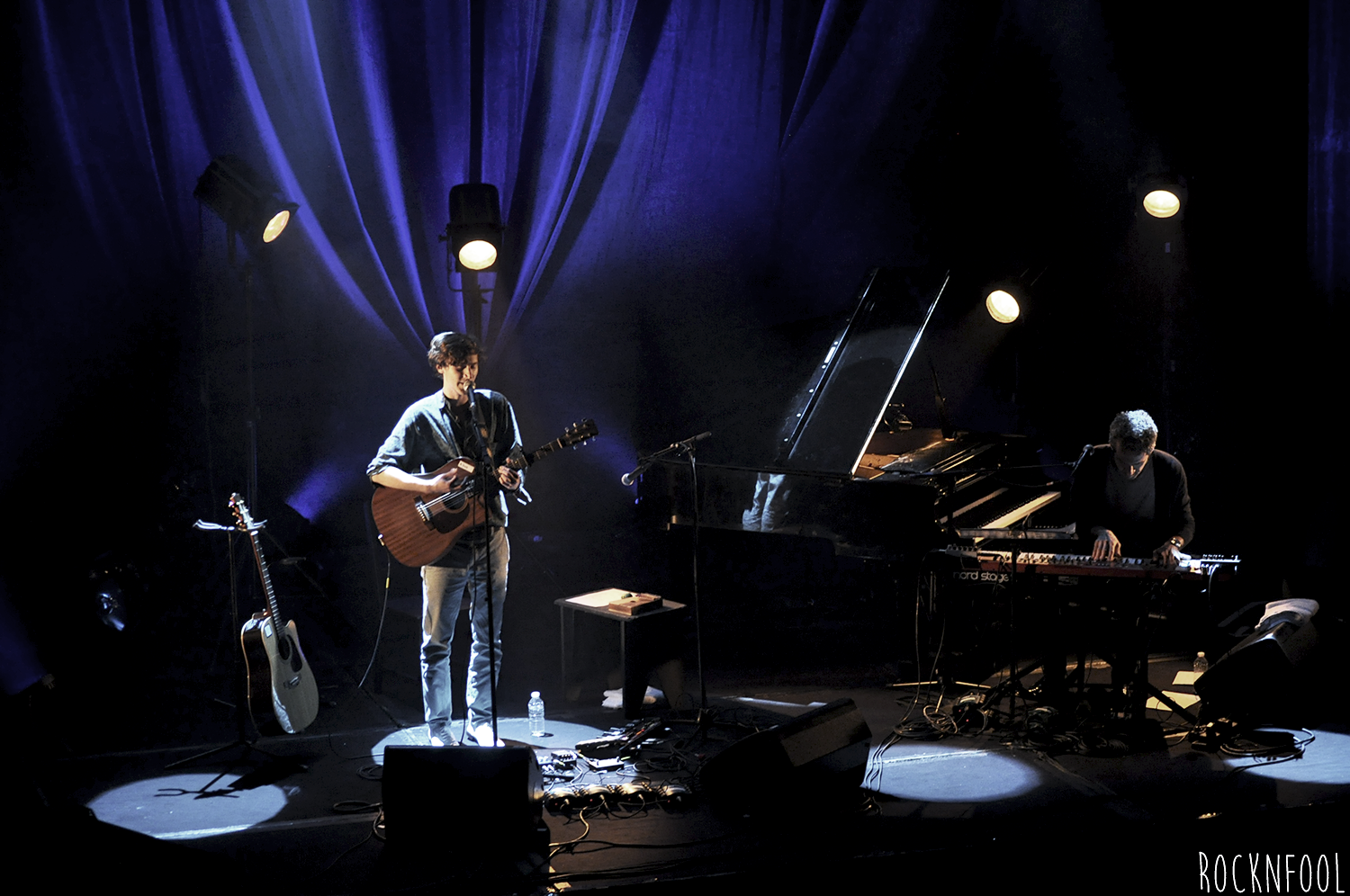 Le chanteur longiligne est installé sur une chaise, sur une scène à peine éclairée, accompagné par moment par un claviériste. Entre nous, on estime que le piano et le clavier sont superflus tant la guitare de Mathieu se suffit à elle-même. Pendant un peu plus d’une heure, le jeune homme va parcourir l’ensemble de son album, il navigue entre des textes en anglais et en français (un peu plus laborieux, le chanteur n’est pas encore à l’aise avec la langue de Molière et a encore un peu de mal à lâcher les chevaux, mais c’est une question d’habitude). Stressé au début du set, Mathieu Saïkaly va se détendre au fur et à mesure, déliant sa langue bien pendue. Il est bavard et meuble parfaitement quand les problèmes techniques s’invitent à la fête. Comme aux Étoiles, le jeune homme a une guest : Pauline, ex-candidate de Nouvelle Star (cette Pauline). Elle poussera la chansonnette sur deux titres absolument ravissants, très Gainsbourg/Birkin.