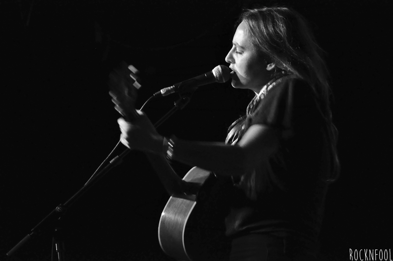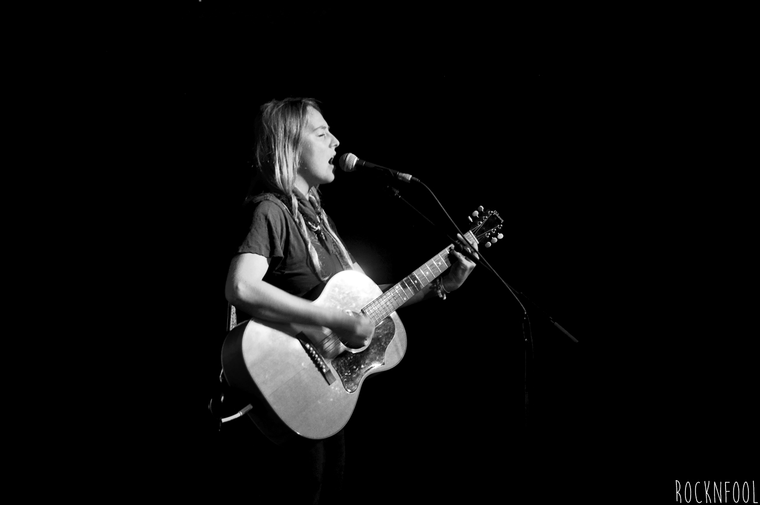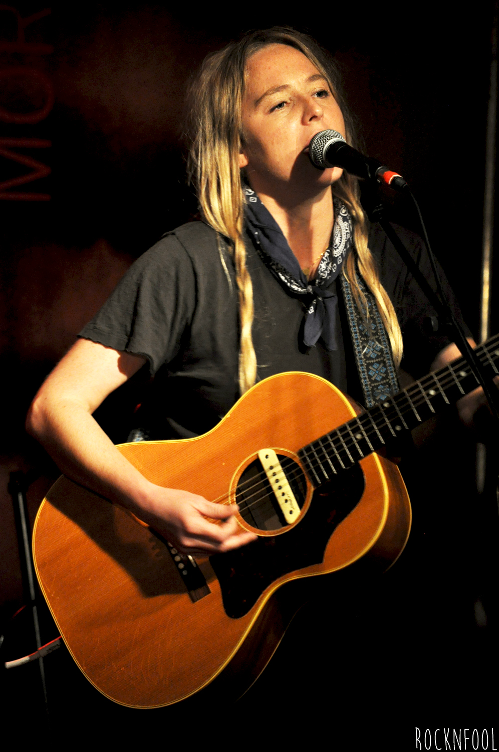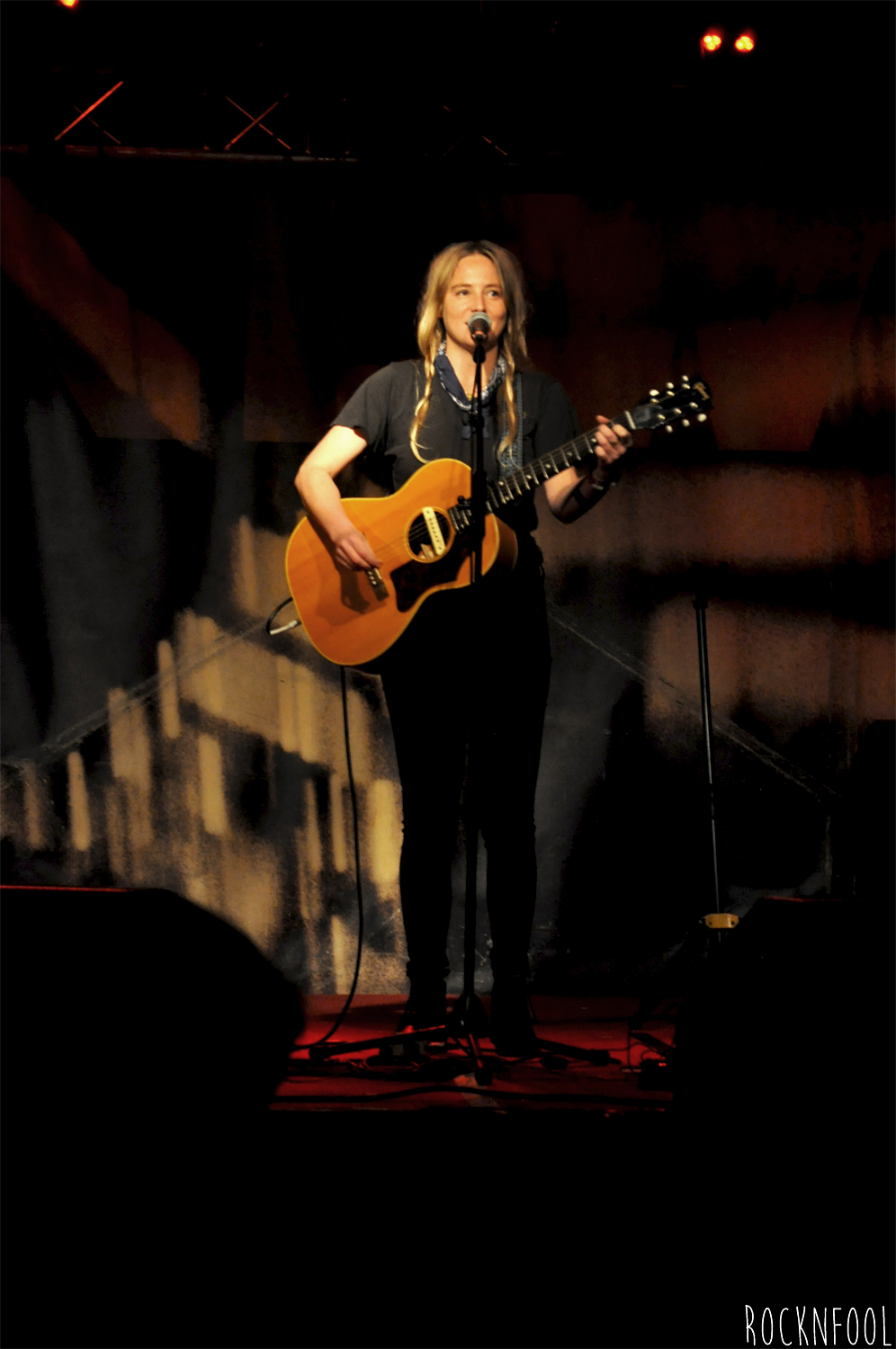 De longs cheveux négligemment tressés, un tee-shirt noir troué, un jean qui tombe et son bandana bleu roulé autour du cou, l’américaine n’accorde guère d’importance à sa tenue de scène. Ça tombe bien, car elle n’est pas là pour s’afficher, mais pour nous interpréter en acoustique, une compilation de titres extraits de ses derniers albums. De Bully à When I’m Alone, en passant par Everywhere I Go, Mississippi, In Sleep, Further Away et Shameless, elle reprend sans fioritures et extravagance ses classiques, chantonnés par moment avec la salle, acquise à sa cause, sans pour autant oublier de nous présenter ses nouvelles chansons, tirées de My Wild West : Hero, Don’t You Give Up On Me, Ojai… Mais surtout The Sun Keeps Rising, une chanson absolument bouleversante à propos de sa tante, décédée d’une sclérose (ALS), plus que touchante pour quiconque a perdu un proche et se reconnaît tristement dans ce texte brut. À côté de ça, Lissie rayonne, si solaire quand elle parle, elle se confie comme à une bande d’amis : elle est heureuse de revenir au basique guitare-voix, même si son groupe lui manque quand elle se retrouve seule en tournée, elle tente quelques phrases en français, alterne entre vin rouge et eau, nous fait l’éloge de Ryan O’Reilly qui lui apporte son capo oublié en coulisse, rigole en se remémorant l’époque où elle vendait son miel et de la tequila sur son stand de merch’, et nous parle de son Midwest… son déménagement de la Californie à Iowa – que l’on confond trop souvent avec l’Ohio et l’Idaho – pour se rapprocher de ses terres natales de l’Illinois où elle a acheté une ferme et se sent heureuse. Si elle savait combien elle, elle nous rend tellement heureux.