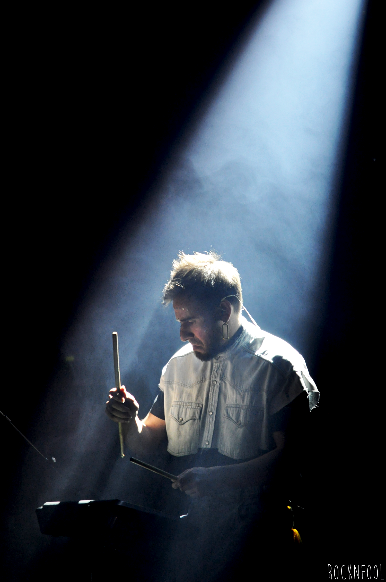 Clément Bazin est le second sur scène. Entouré par son pad, son ordi, et un spacedrum, le garçon propose de l’électro aux touches world. On a, on l’avoue, un peu de mal à entrer dans ce projet, ce qui n’est pas le cas des dizaines de collégiens venus se défouler dans la fosse.