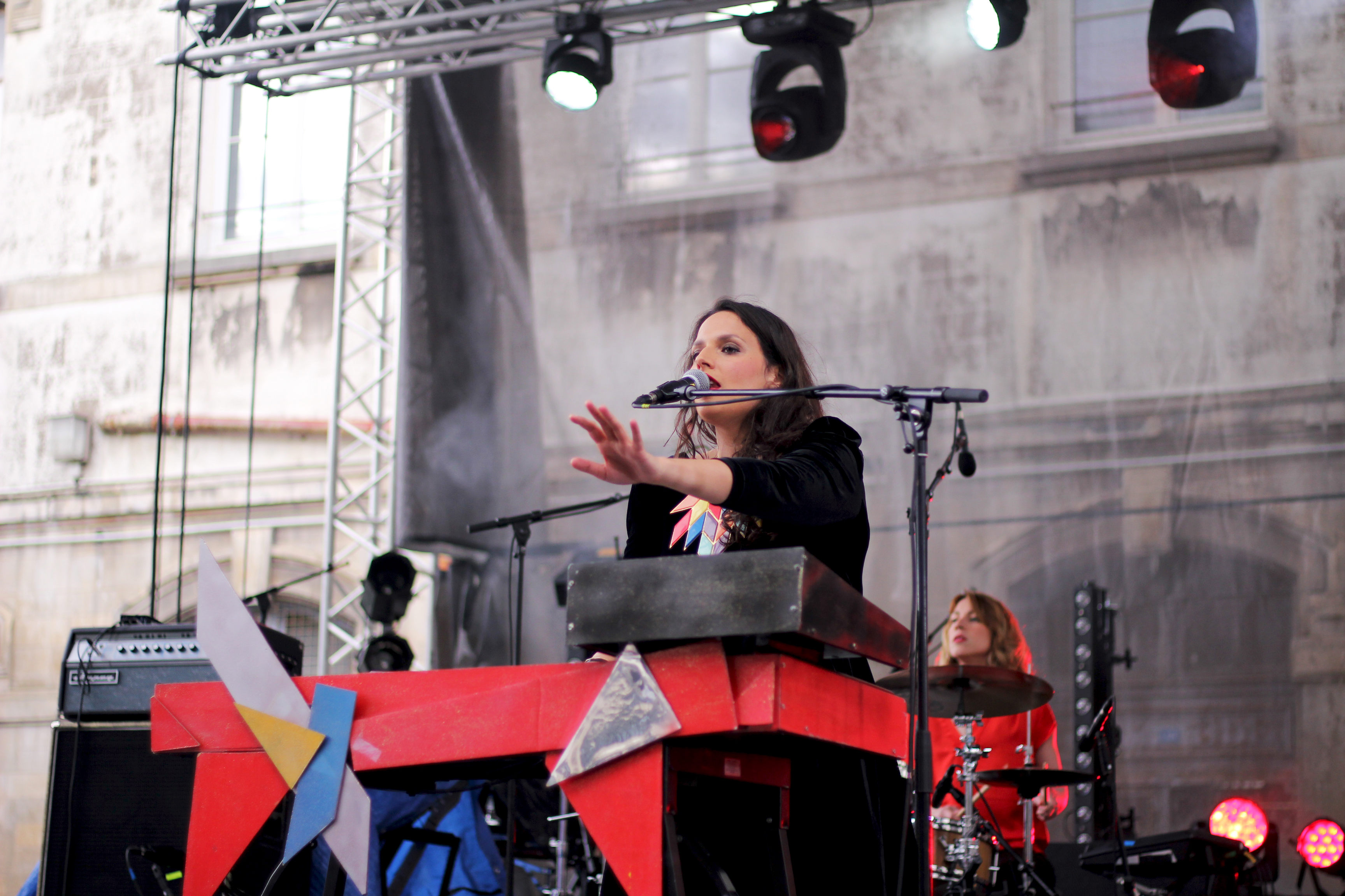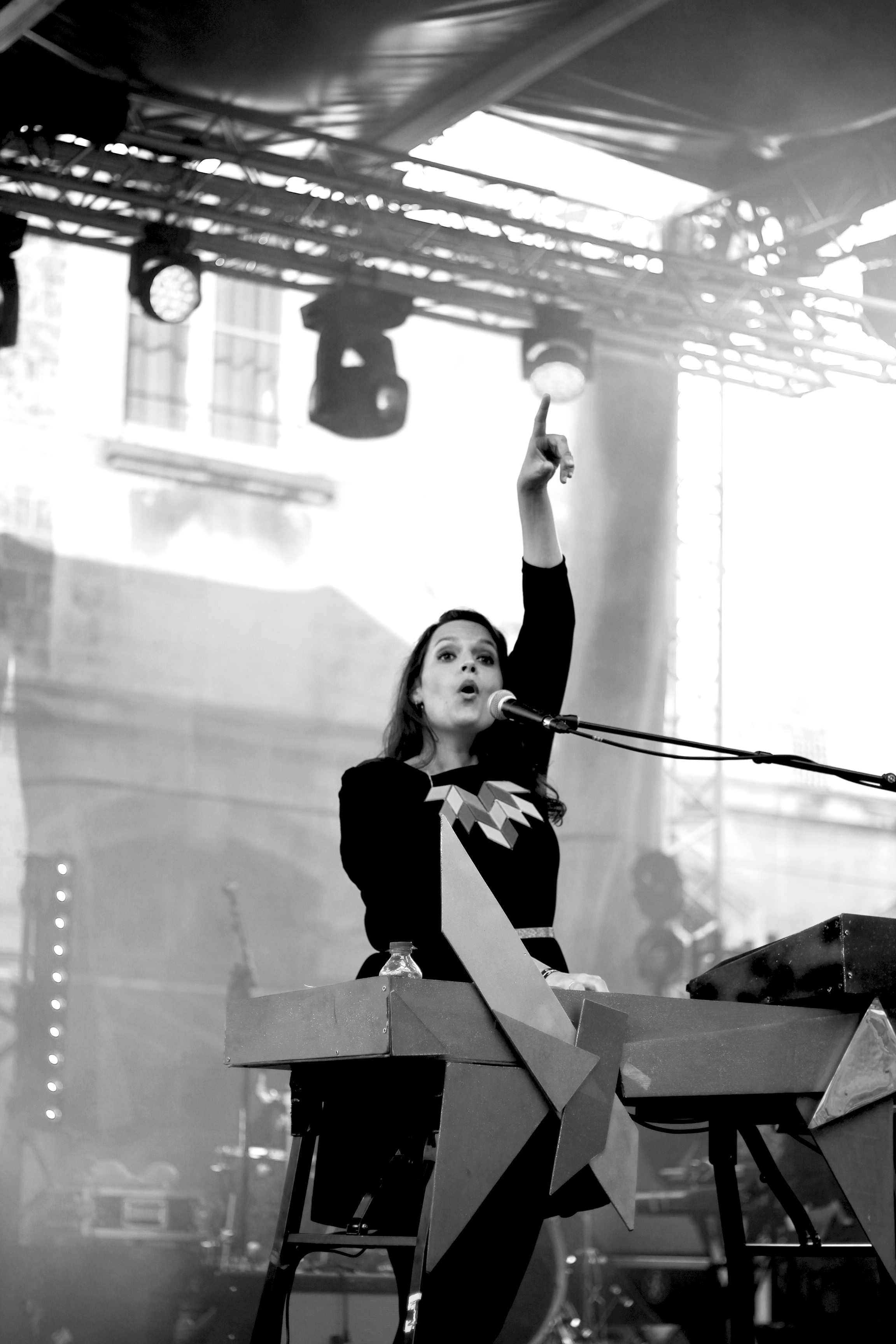 La reine Nach entourée de ses trois dames d’honneur prend place sur scène alors qu’une violente averse sévit toujours. Qu’à cela ne tienne le public – venu en nombre spécialement pour elle -, d’abord réfugié sous le grand arbre de la cour, ose braver les trombes d’eau pour s’approcher de la scène. La fantastique Nach parvient en quelques notes à chasser les nuages et faire revenir le soleil. On n’en attendait pas moins d’elle. Souriante, pleine d’énergie, drôle et riche d’une harmonie à en faire fondre tous les cœurs, elle nous conquiert sans effort en solo, en groupe ou accompagnée de sa chère “machine” à sons magiques sur “Lève-toi”. Un baume au cœur.