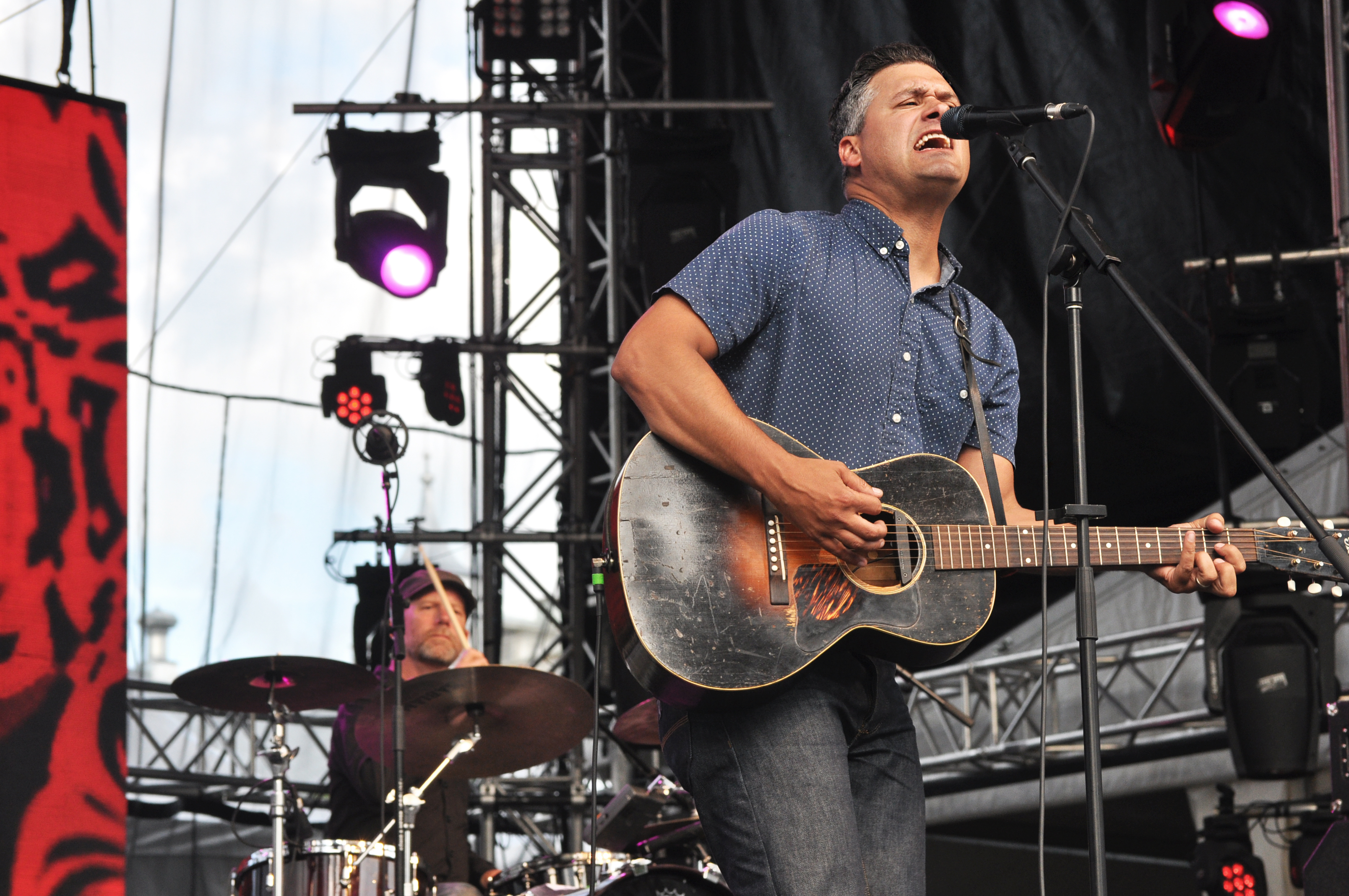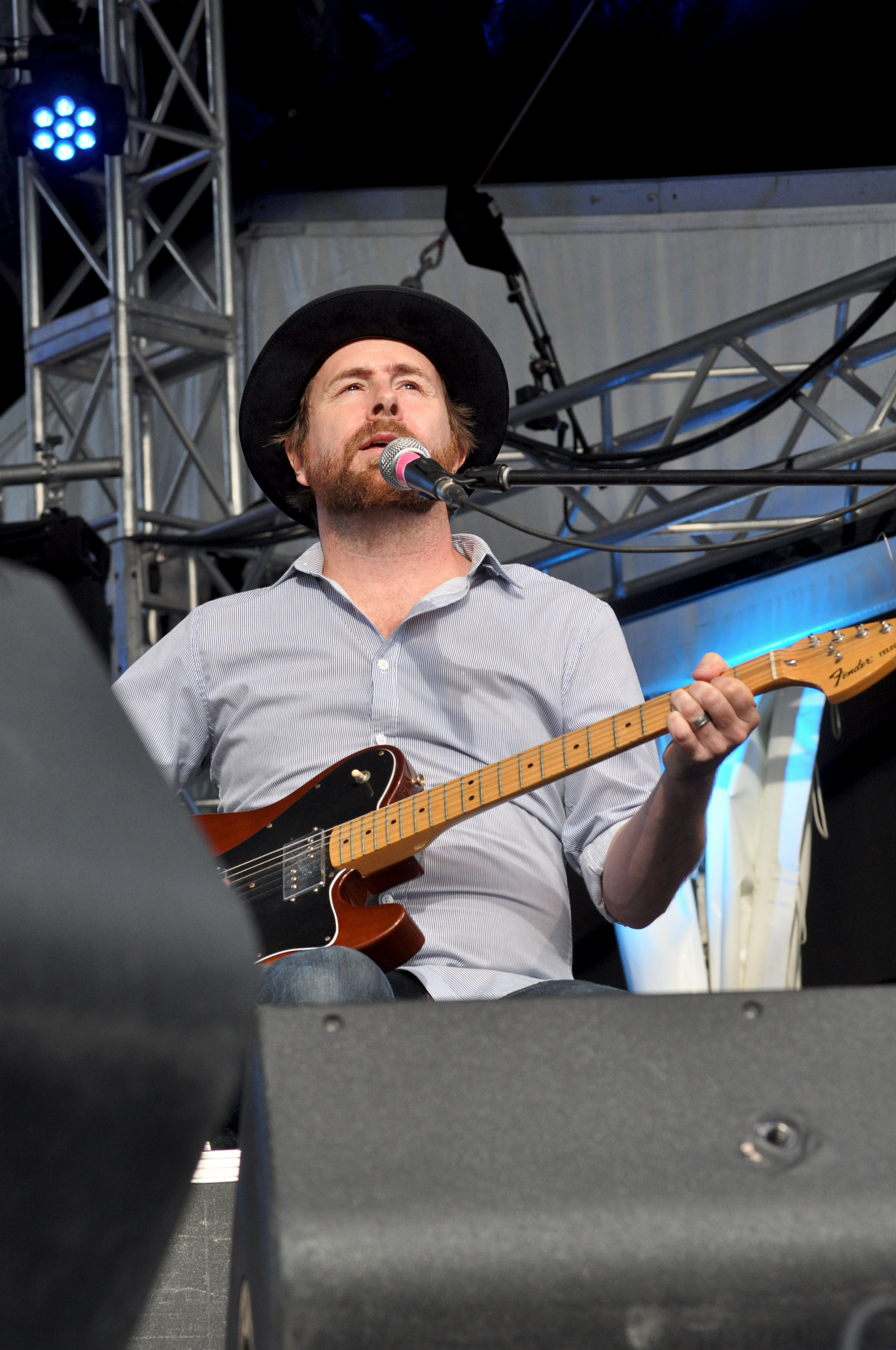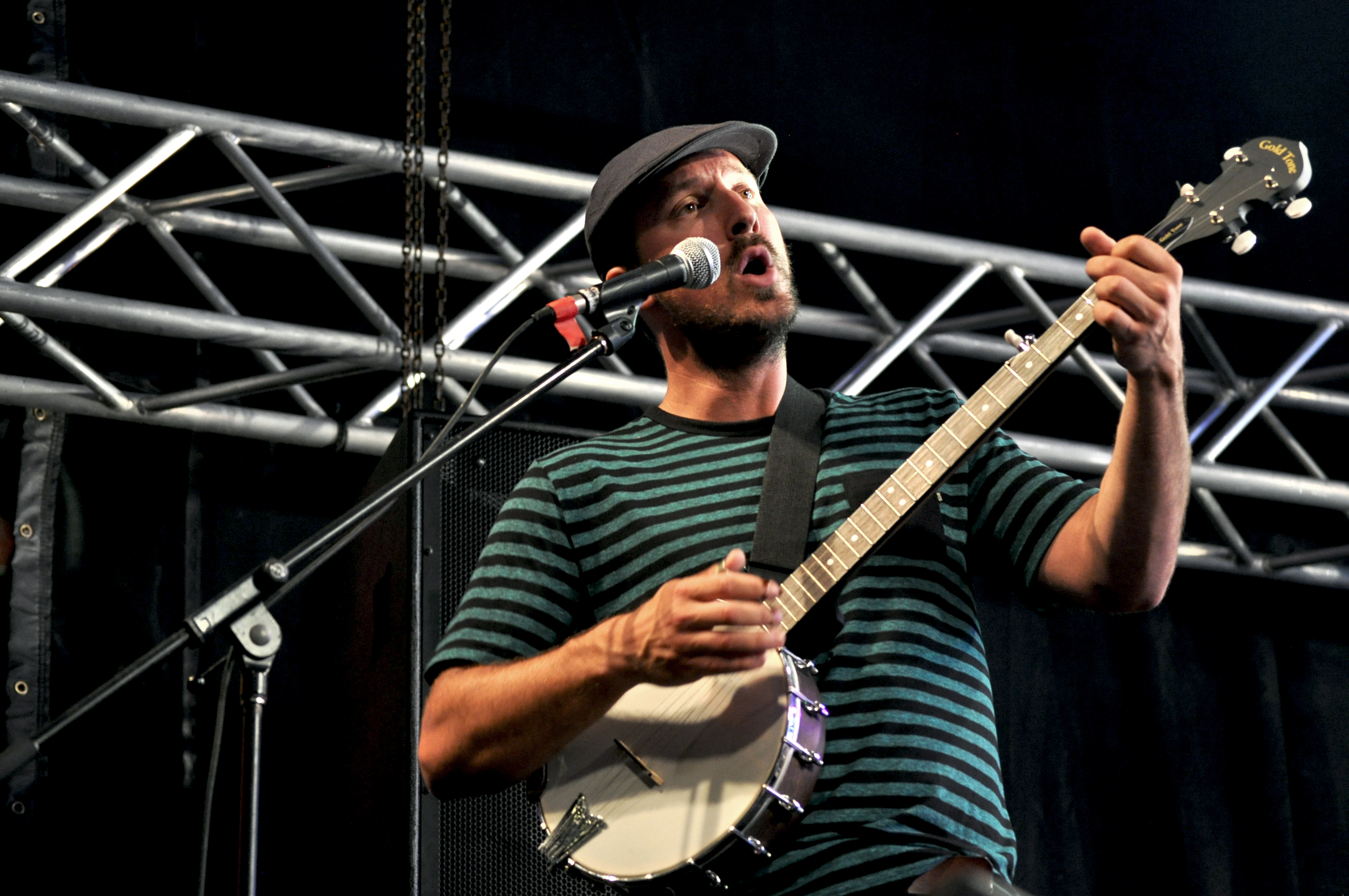 Un vent rétro souffle sur la place d’Youville ce lundi 11 juillet. Le beau temps est revenu au galop, rendant notre 1er concert de la journée fort agréable. C’est le trio folk-rock ELLIOTT BROOD d’Ontario qui a la tâche d’ameuter les festivaliers et les touristes flânant, en ce bel après-midi de juillet. Deux guitares acoustiques, ou guitare électrique et acoustique, ou l’efficace combo banjo-guitare forme le nœud principal de leur formation, plus une batterie rock (parfois jouée aux fagots !). Ils parsèment par-dessus tout cela, quelques lignes d’harmonica, et marchent droit dans les plates bandes de Dylan et autres confrères plus contemporains de Bon Jovi à Aérosmith. Rien de nouveau sous les tropiques, la formule est classique, les techniques sont rodées et ça fonctionne puisque à la fin de leur set, le place est quasiment remplie.
