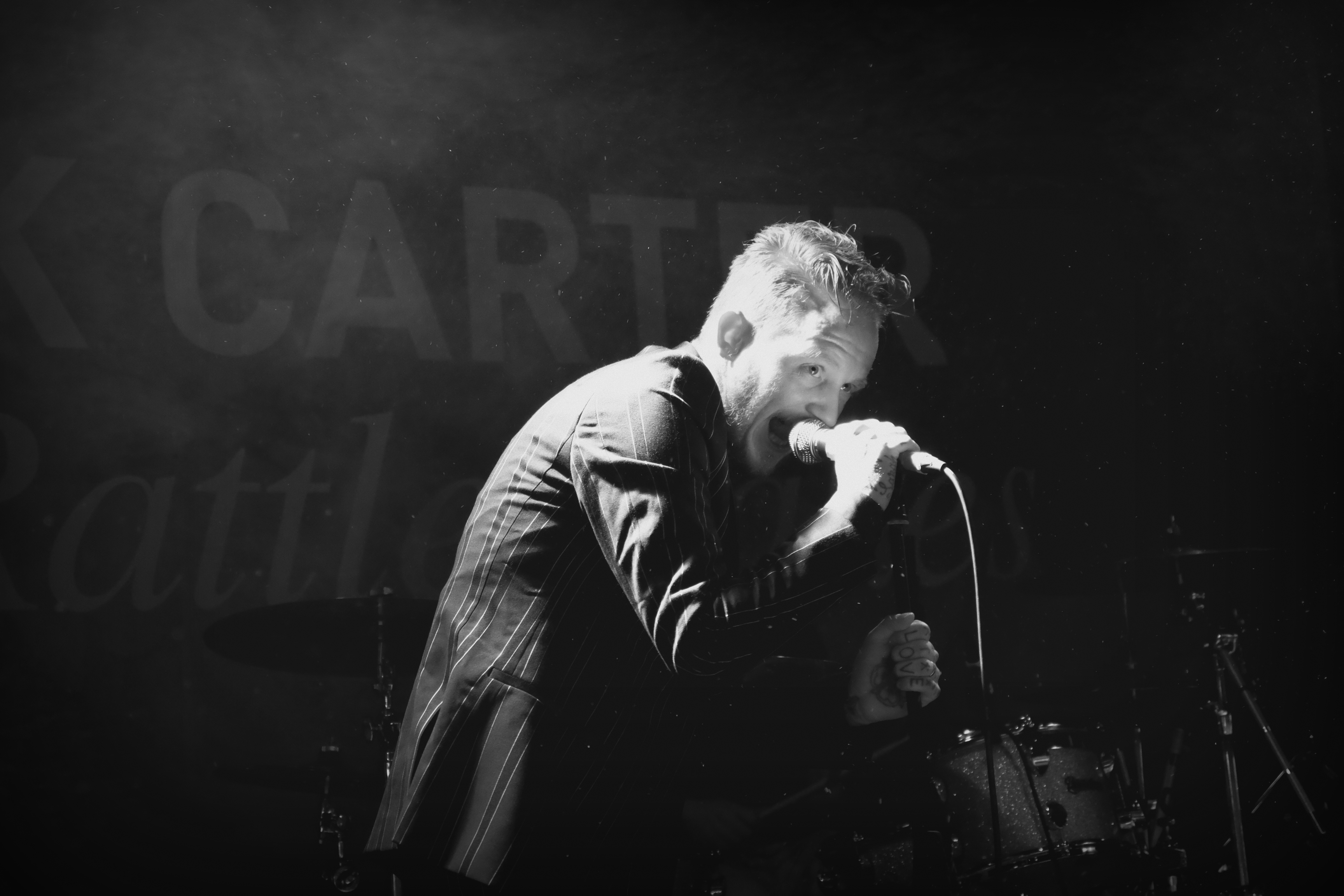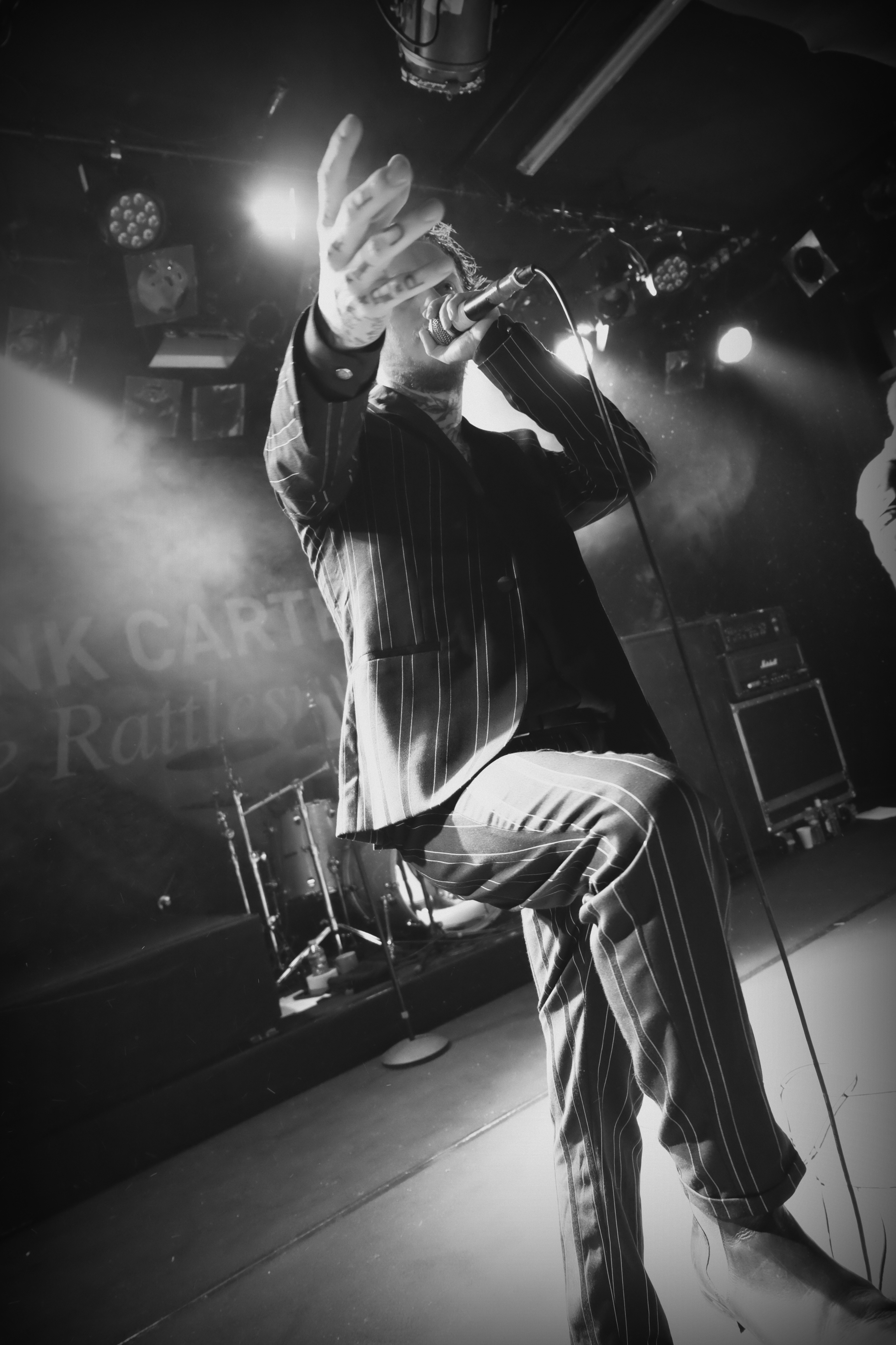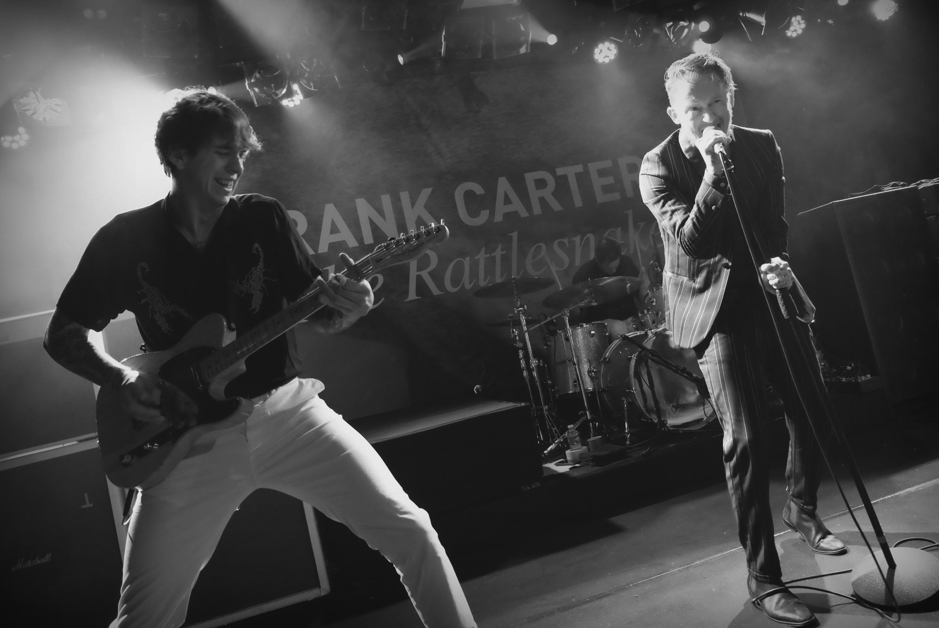 Dès les premières notes de guitare, on comprend que le concert va être un sérieux mélange de styles. Frank Carter se présente en costume rayé, parfait dandy crooner au milieu des Rattlesnakes, tous en pantalon blanc et chemise noire. Mais ses tatouages, sur les mains, le cou, le visage, l’intérieur de la paume, trahissent l’artiste. Il éructe, empoigne son micro, et transforme ce concert en pur moment de classe punk, aussi antinomique soit-il, en l’espace de quelques secondes.