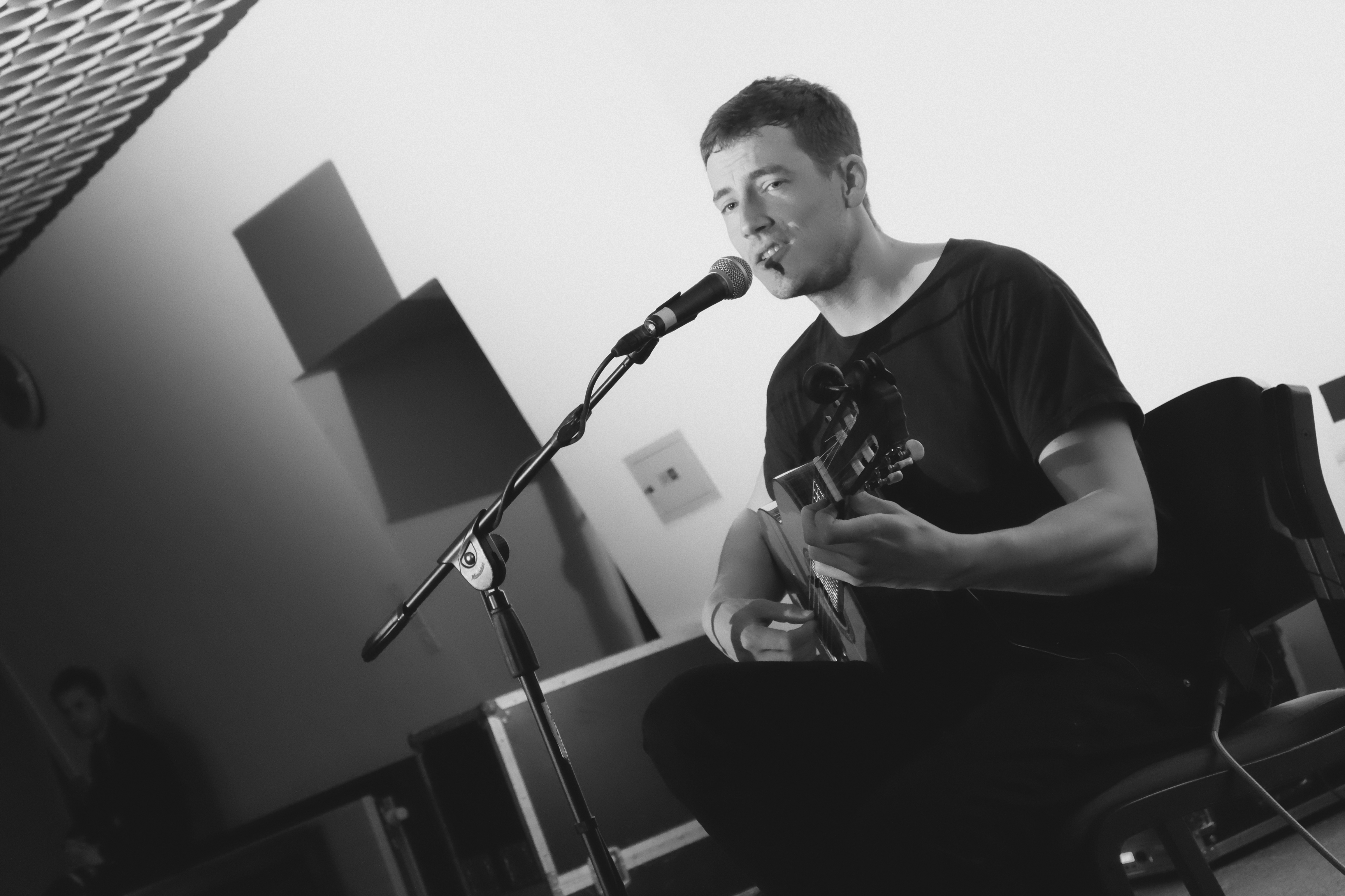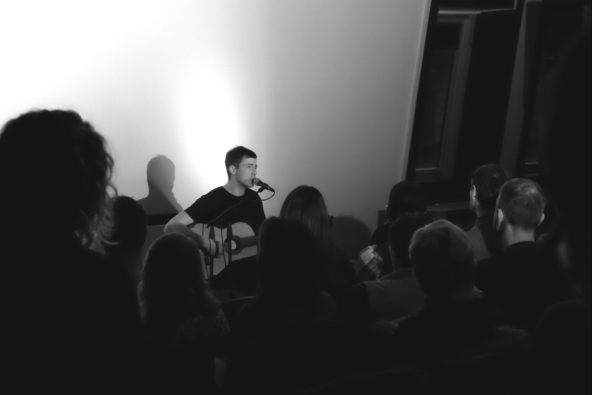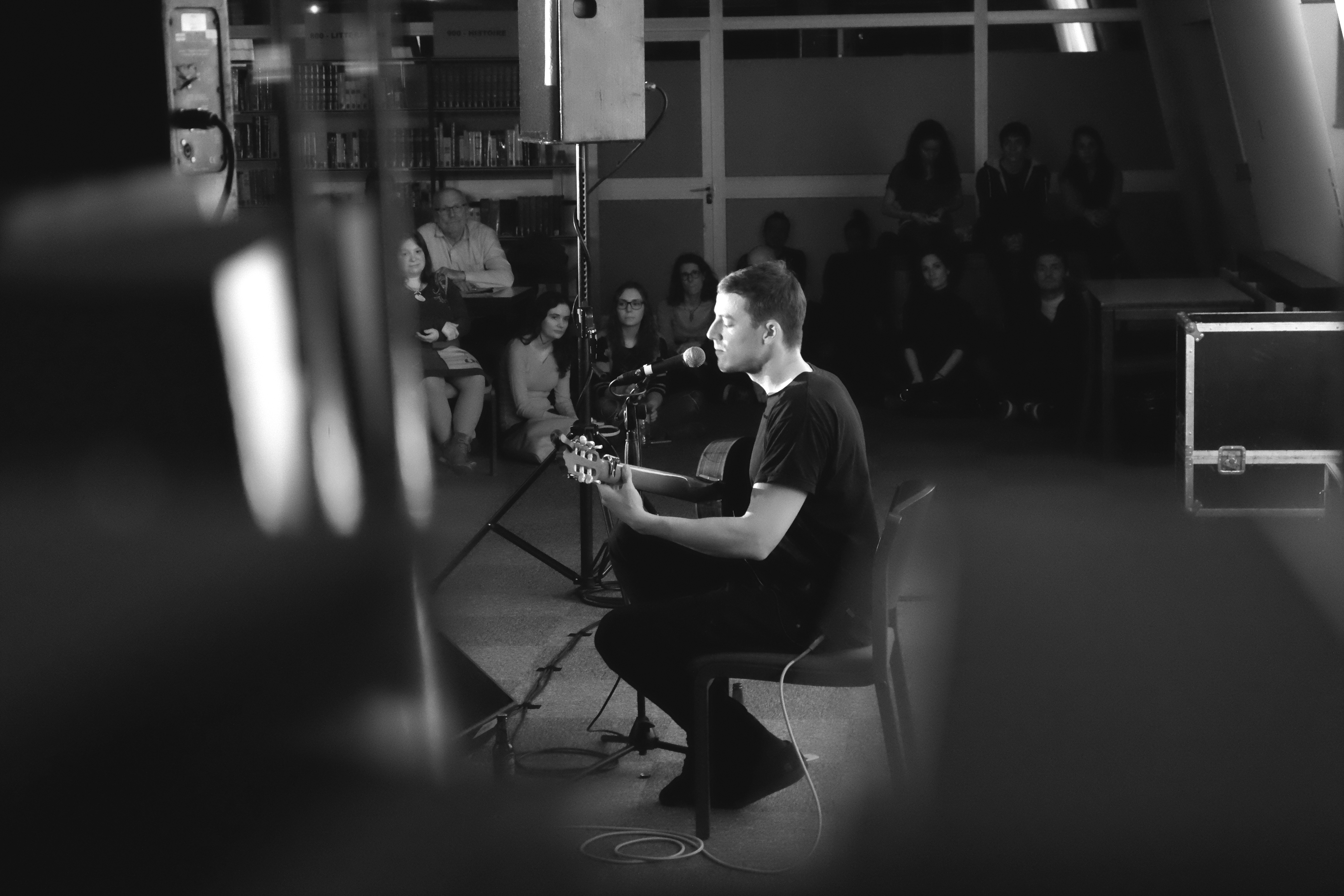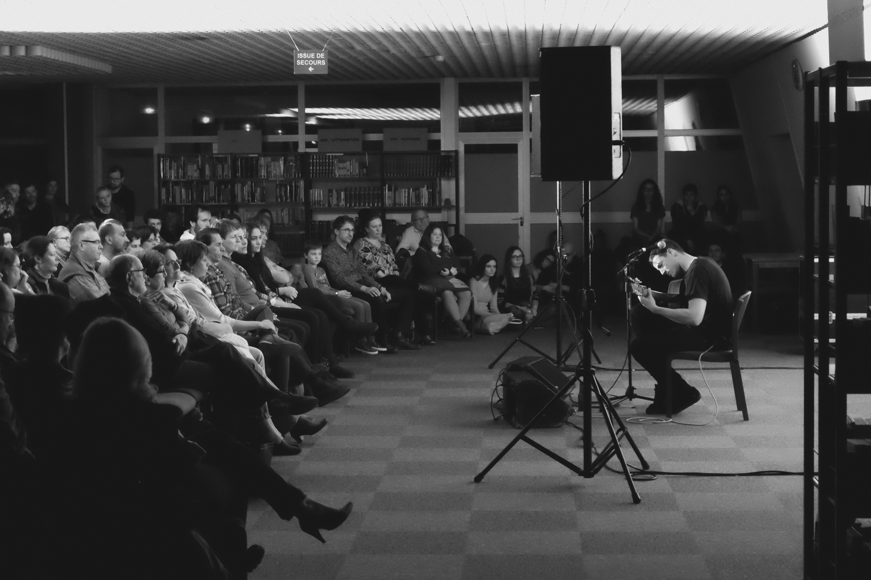 Le 2e étage était prêt. Au milieu d’étudiants concentrés et studieux s’alignaient quelques rangs de chaises vides. Très vite, il a fallu les doubler : le public est venu nombreux découvrir le folk de l’Anglais qui n’était jusqu’alors jamais passé dans la région. Des enfants aux retraités, tous s’assoient sagement et guettent la scène, placée tout à côté du rayon “romans en langue anglaise”. Joli clin d’œil.