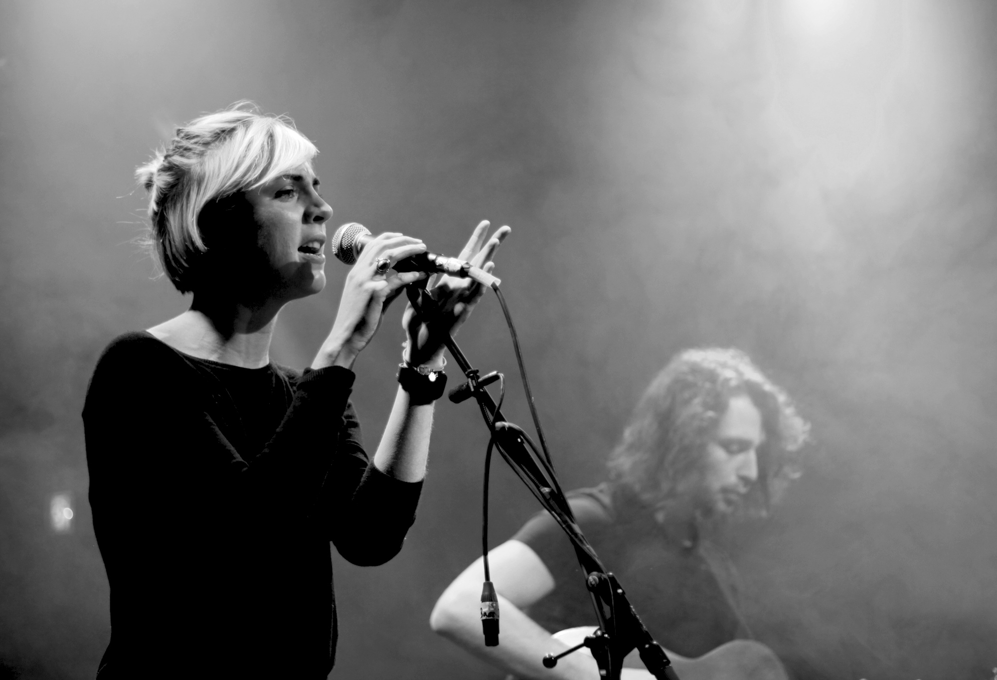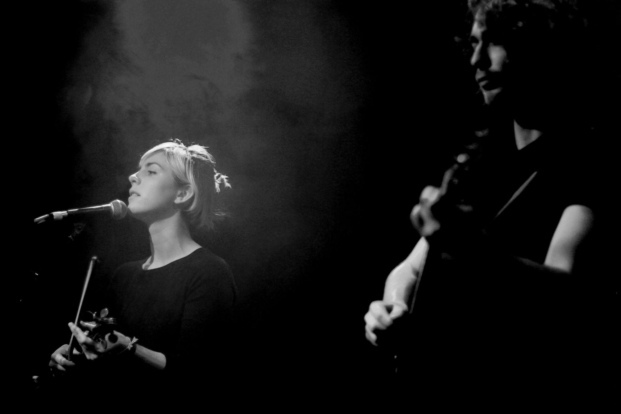 La présence d’une deuxième guitare ne modifie pas du tout l’émotion à la Barbara qui se dégage de la jeune femme et de sa voix toute-puissante, elle apporte une profondeur et une ouverture bien agréables. Le duo se connaît bien, les titres sont réarrangés avec subtilité.