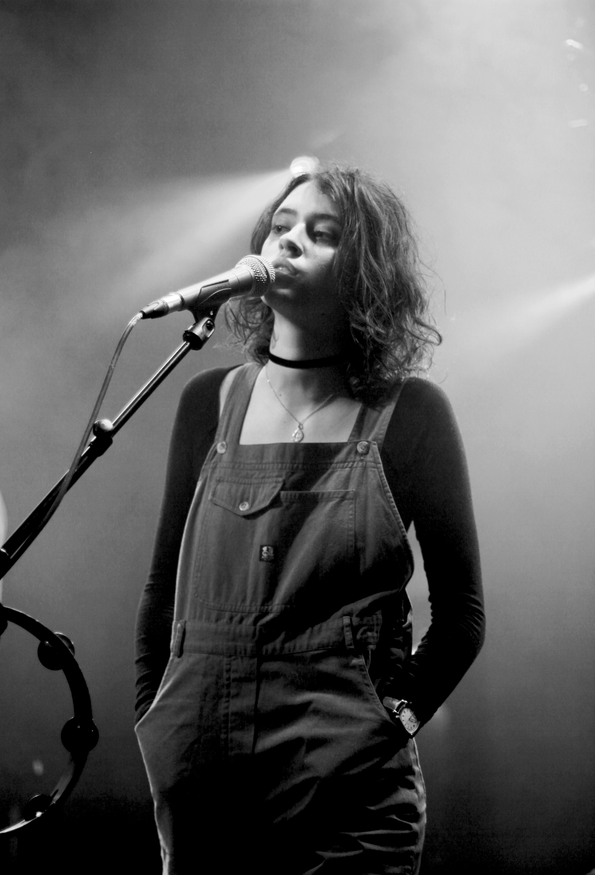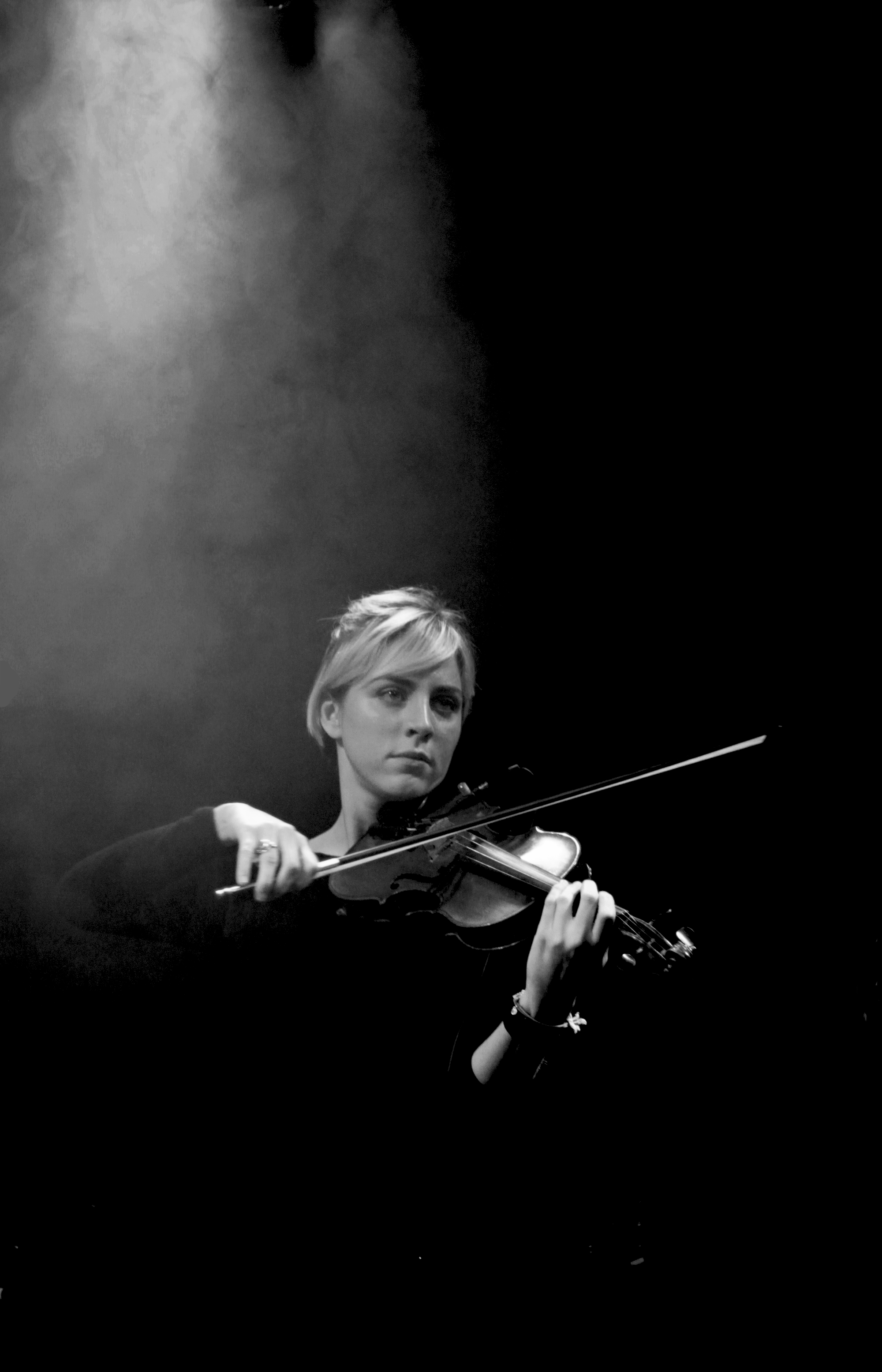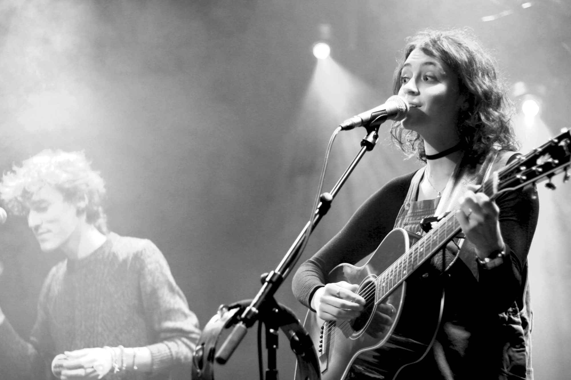 Pomme fait son apparition au milieu des spots rose et bleu, dans une douce fumée trouble. Son complice, Mathieu Saïkaly, toujours très souriant, semble apaiser ce qu’elle nous confie être du stress. Mais comme toujours la jeune femme est à la fois très concentrée et très généreuse. Son air grave esquisse parfois un large sourire lorsqu’elle balaie la salle du regard.
