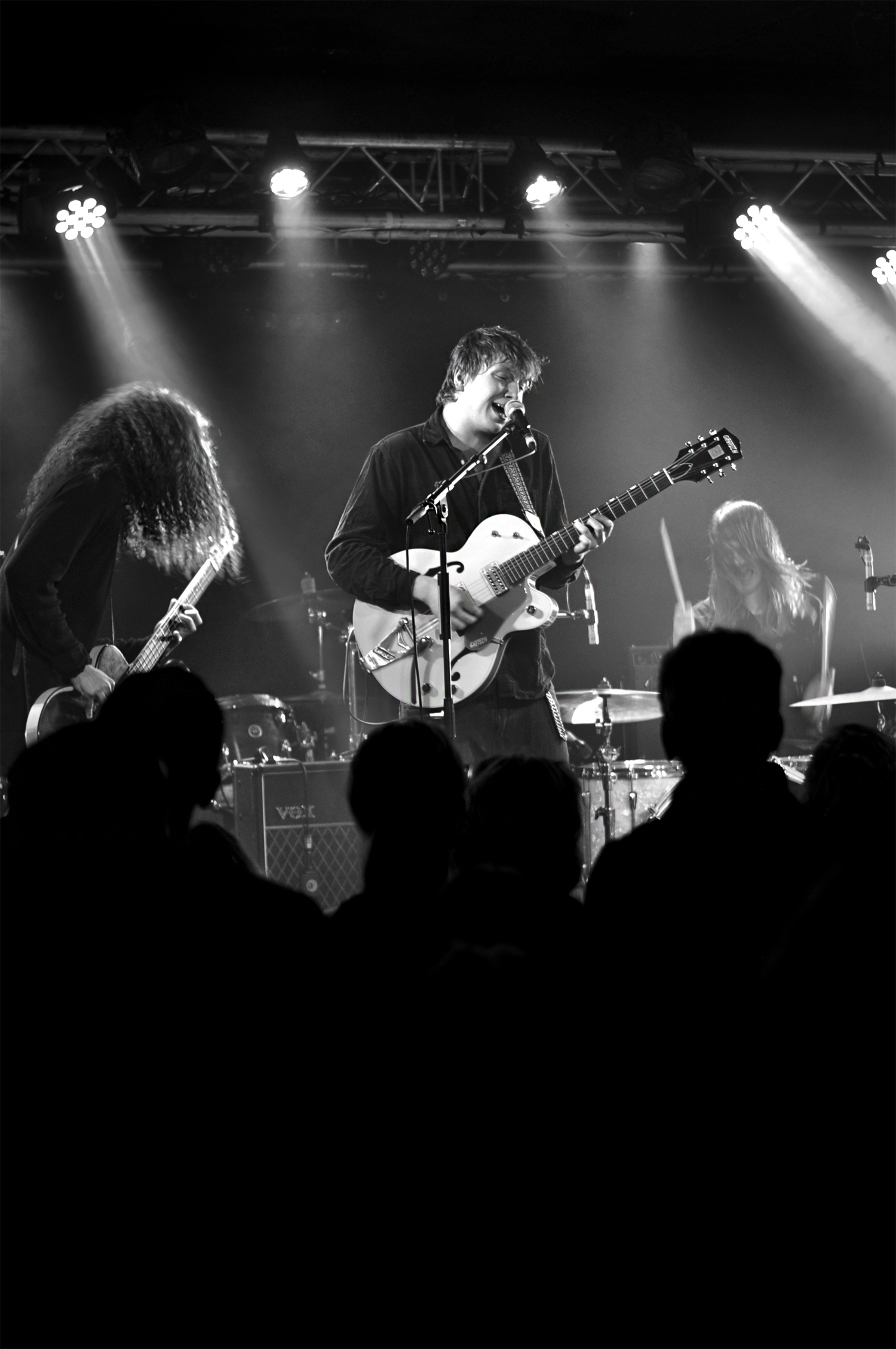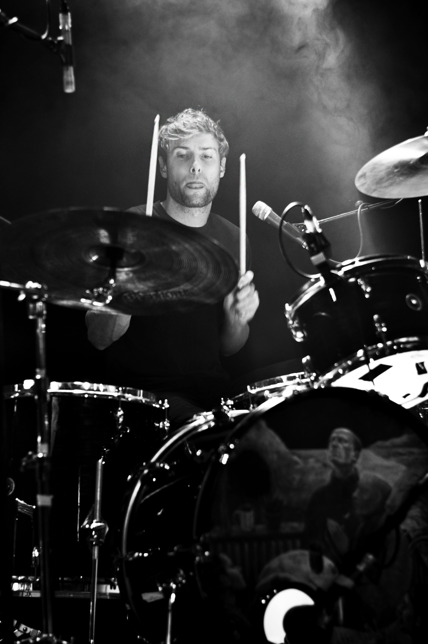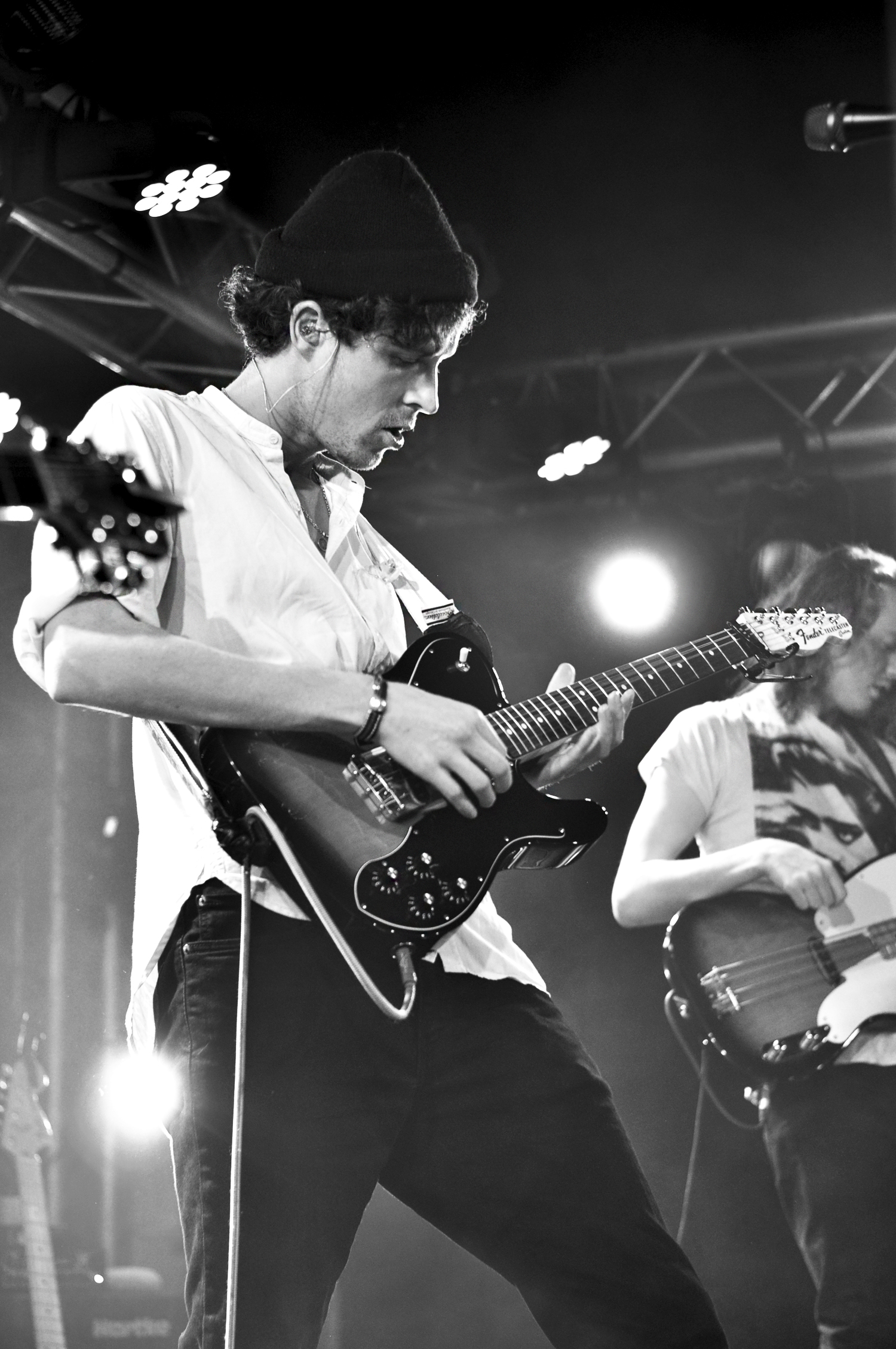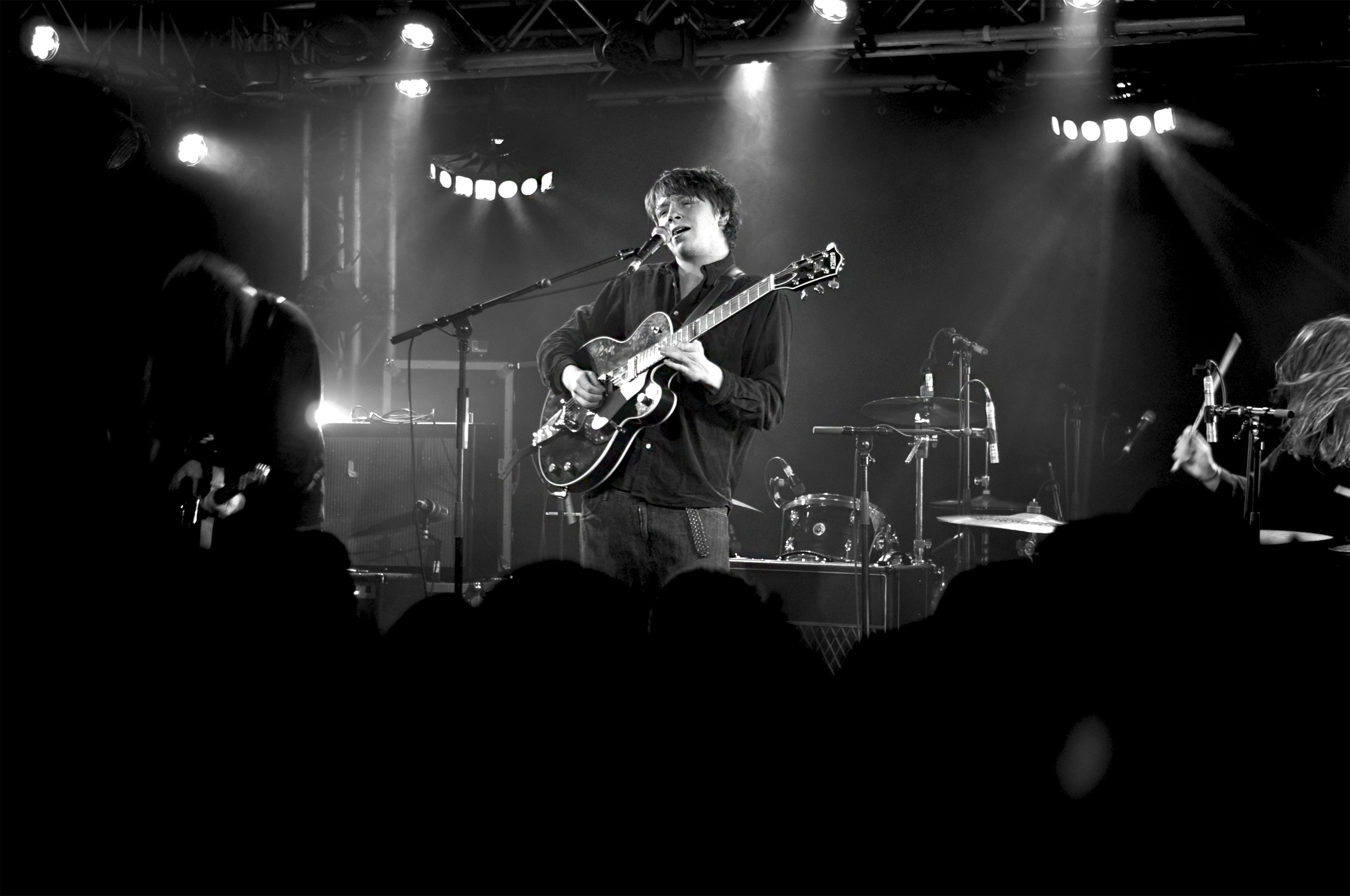 Enfin, Palace débarque. Léo Wyndham, fascinant lead singer et guitariste, bonnet vissé sur la tête dévisage les premiers rangs, le regard incandescent, bien planté dans celui du public captivé. Il se meut au centre de la scène, encadré par la basse et la guitare. La batterie est en arrière, classique, pêchue et béton. Il raconte avoir un souvenir mitigé de leur dernière venue à la Boule Noire pour le Festival des Inrocks, puisqu’une musicienne d’un des autres groupes présents ce soir-là avait vomi dans sa guitare. Ça ne peut être que mieux pour ce retour en terres parisiennes.