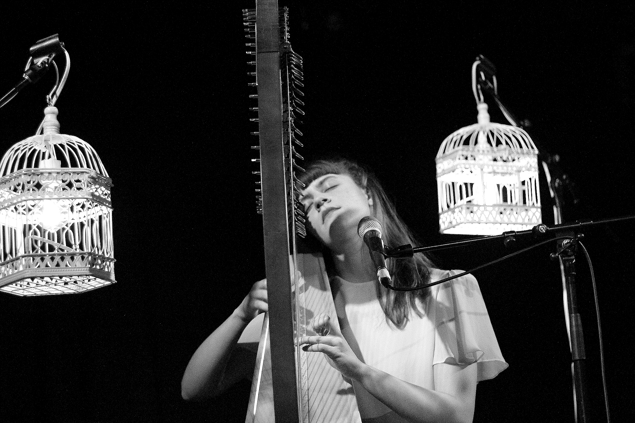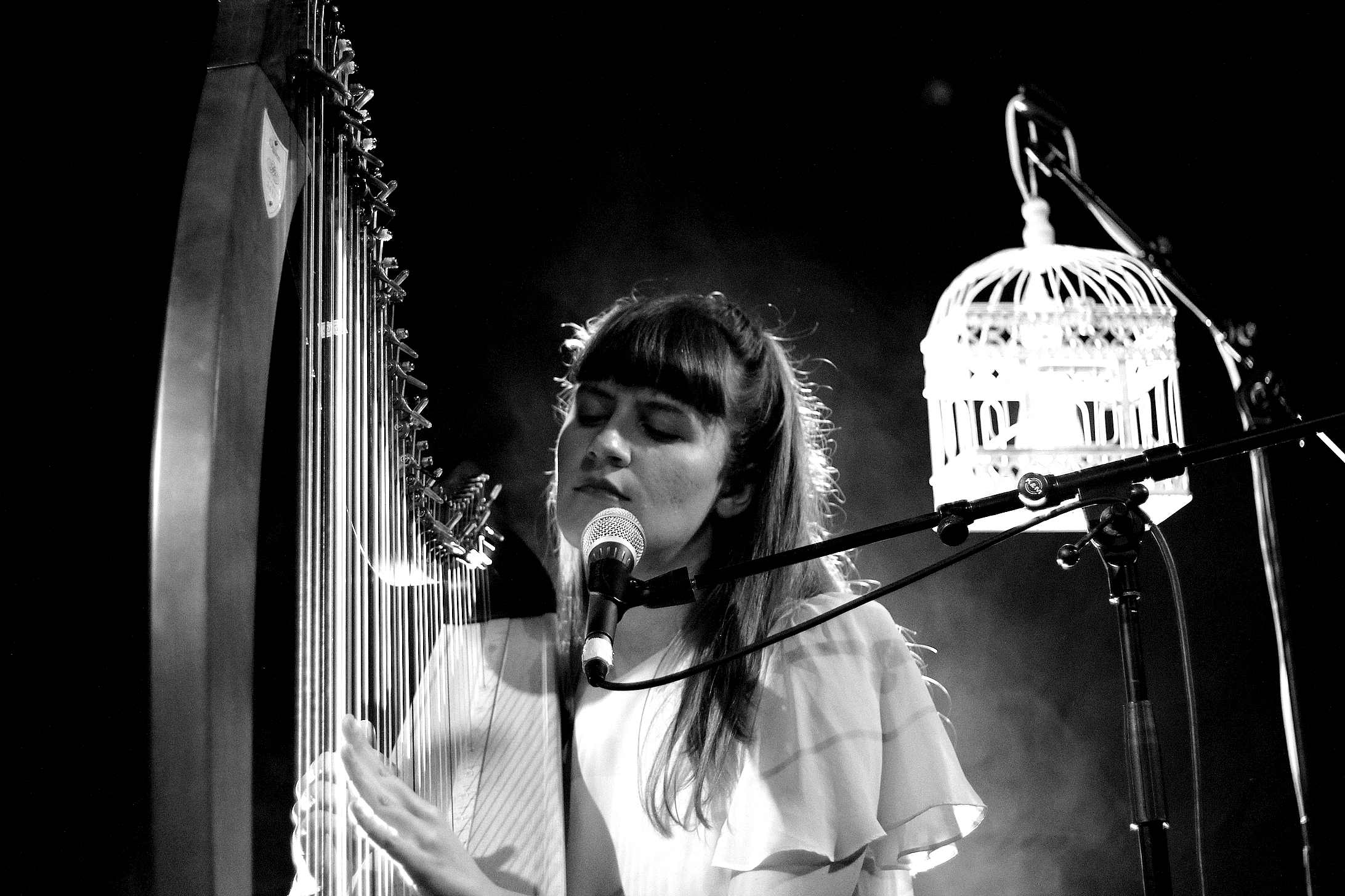 On les voit donc pour la première fois dans l’ambiance tamisée du Divan du Monde. Seule sur scène, la Québécoise d’adoption s’est entourée de deux petites cages à oiseaux qui l’éclairent. Les doigts d’Emilie courent sur la harpe, en nappe régulière, parfois multipliée et intensifiée par des loops. Son limpide timbre de voix de soprane nous fait songer à une prêtresse conteuse de légendes des temps anciens. Ses légendes à elle, celles de la vie de tous les jours, celles des années 2000, narrées à travers 10.000 émotions. 10.000 comme le nom de son premier album sorti en 2016 chez Secret City Records, produit notamment par Jesse Mac Cormack. On aurait aimé un peu plus de contrastes et d’intensité, car la magie n’a pas suffisamment fait d’effet sur nous.
