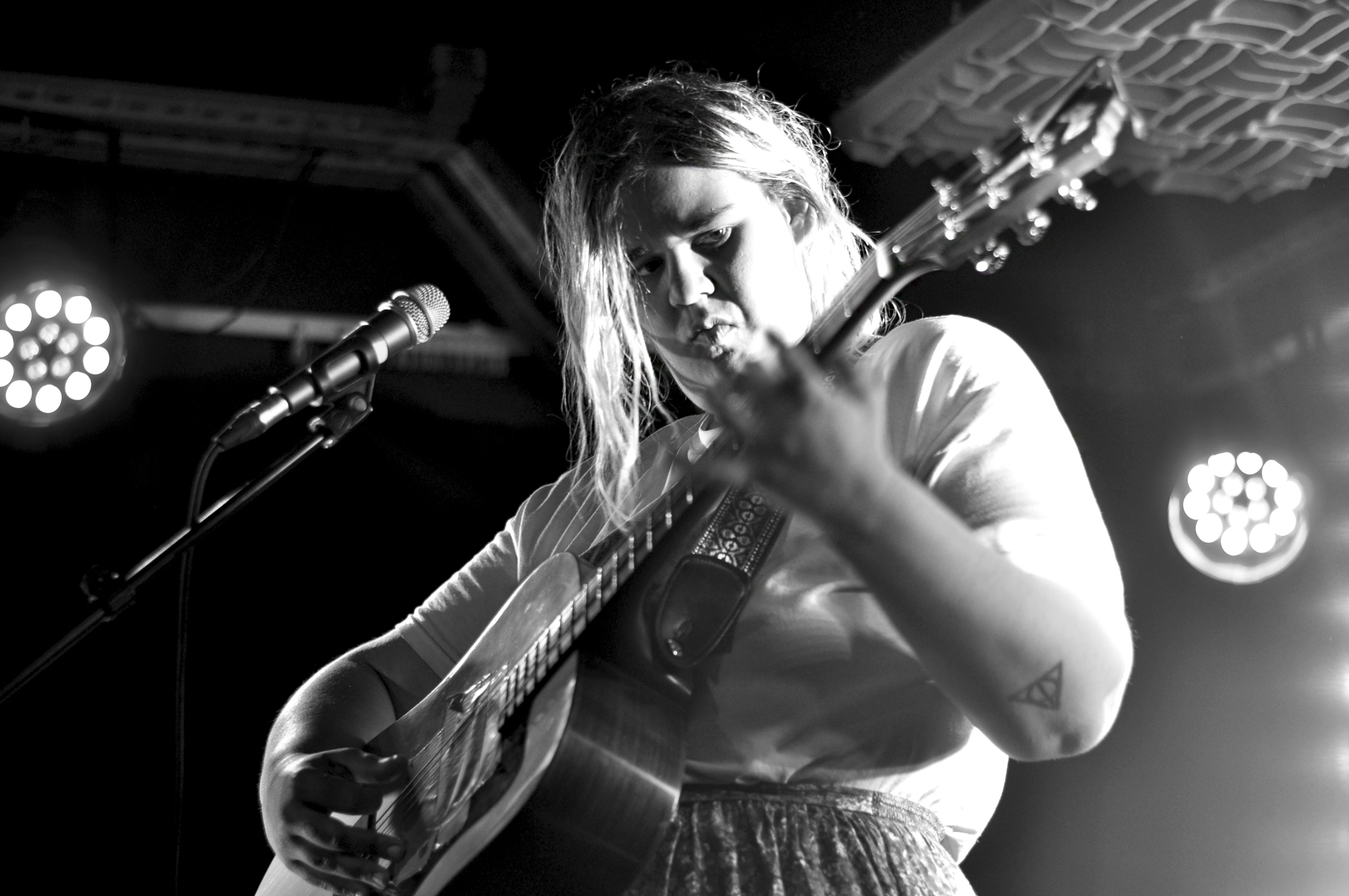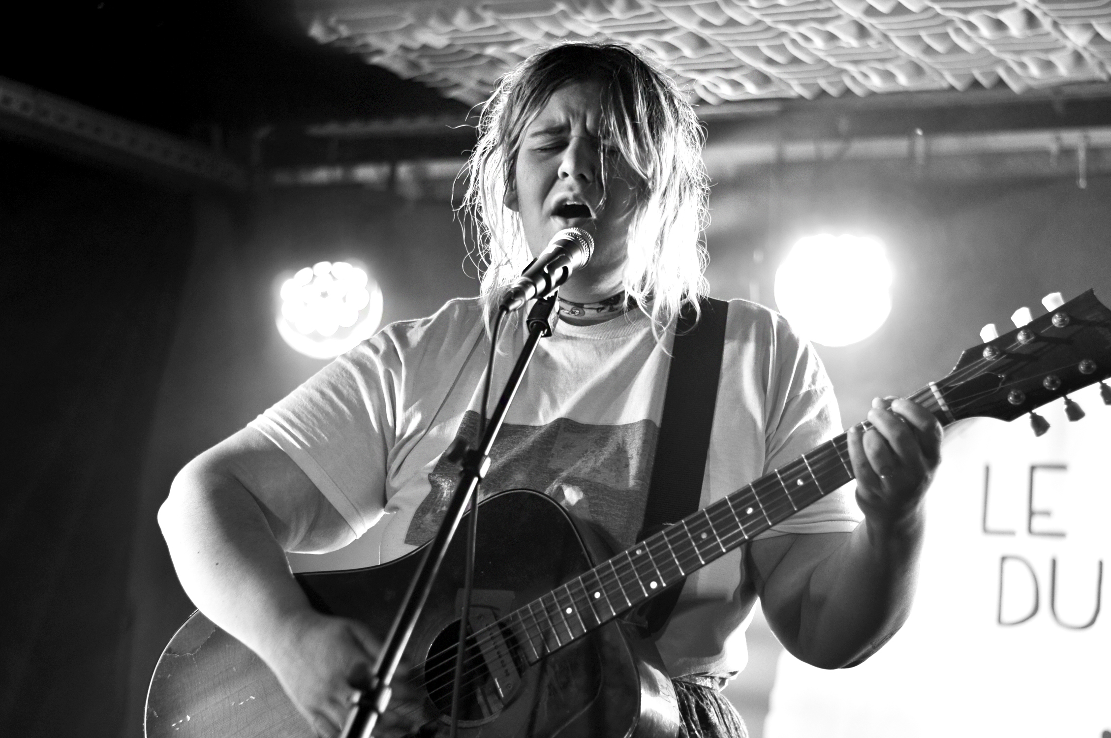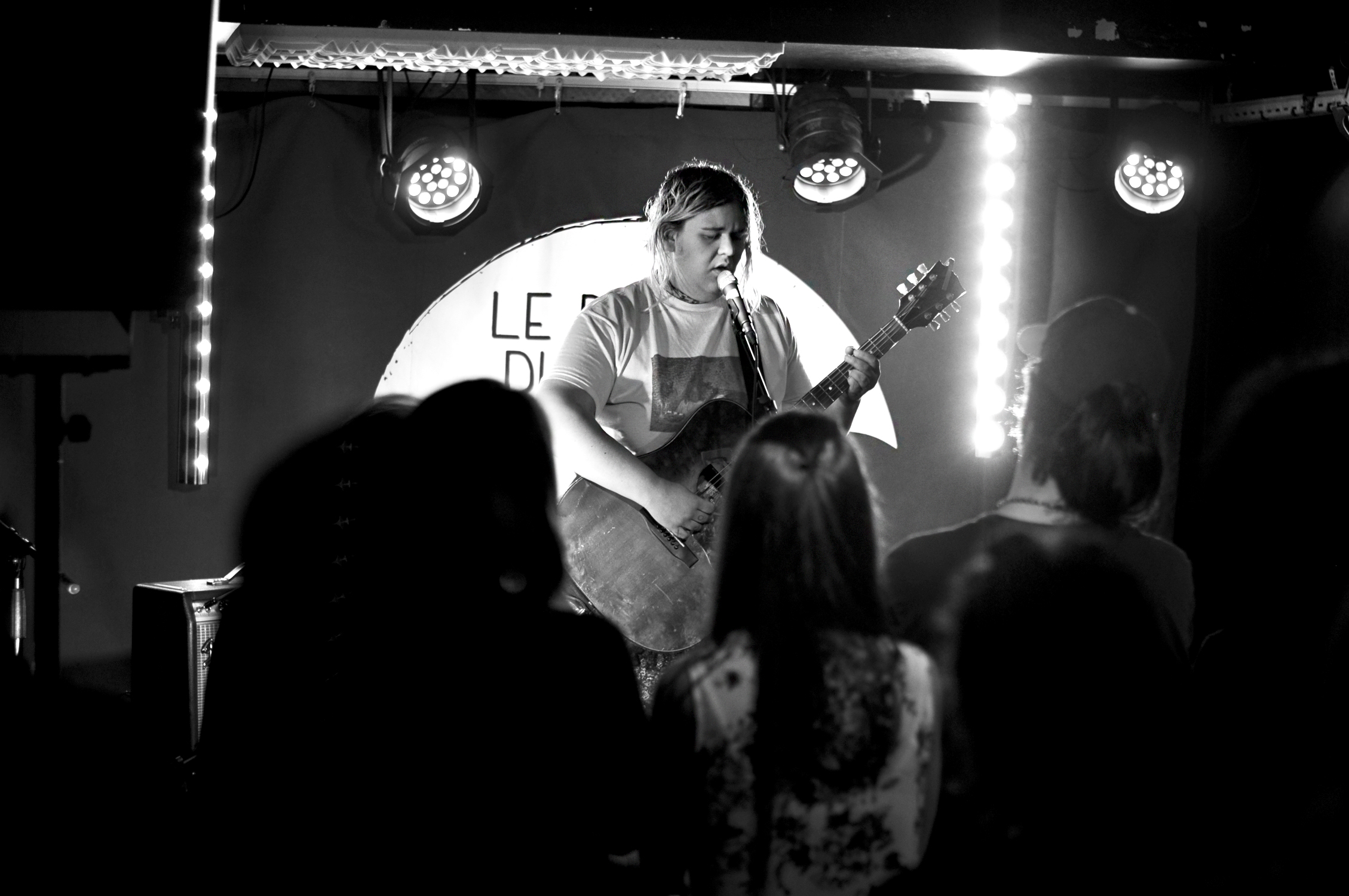 Lorsque l’on entre dans la salle, ce sont les mots de “La Laideur” qui nous accueillent. Le ton est donné. Safia Nolin, plus proche que jamais de son public comme elle nous le confie amusée et gênée, attire tous les regards. Le sien est baissé, ses yeux fermés, elle semble concentrée, elle vit sincèrement ce qu’elle chante. Et ce qu’elle chante n’est pas joyeux : l’abandon, la séparation, les amours impossibles…