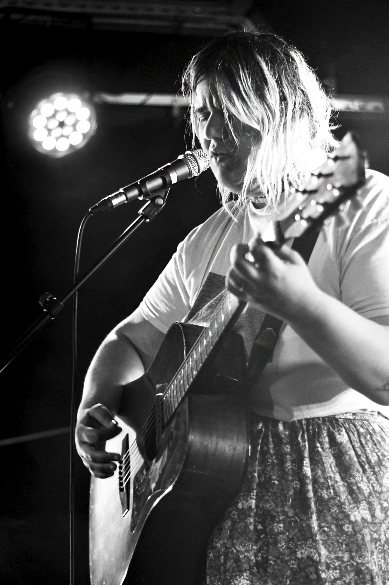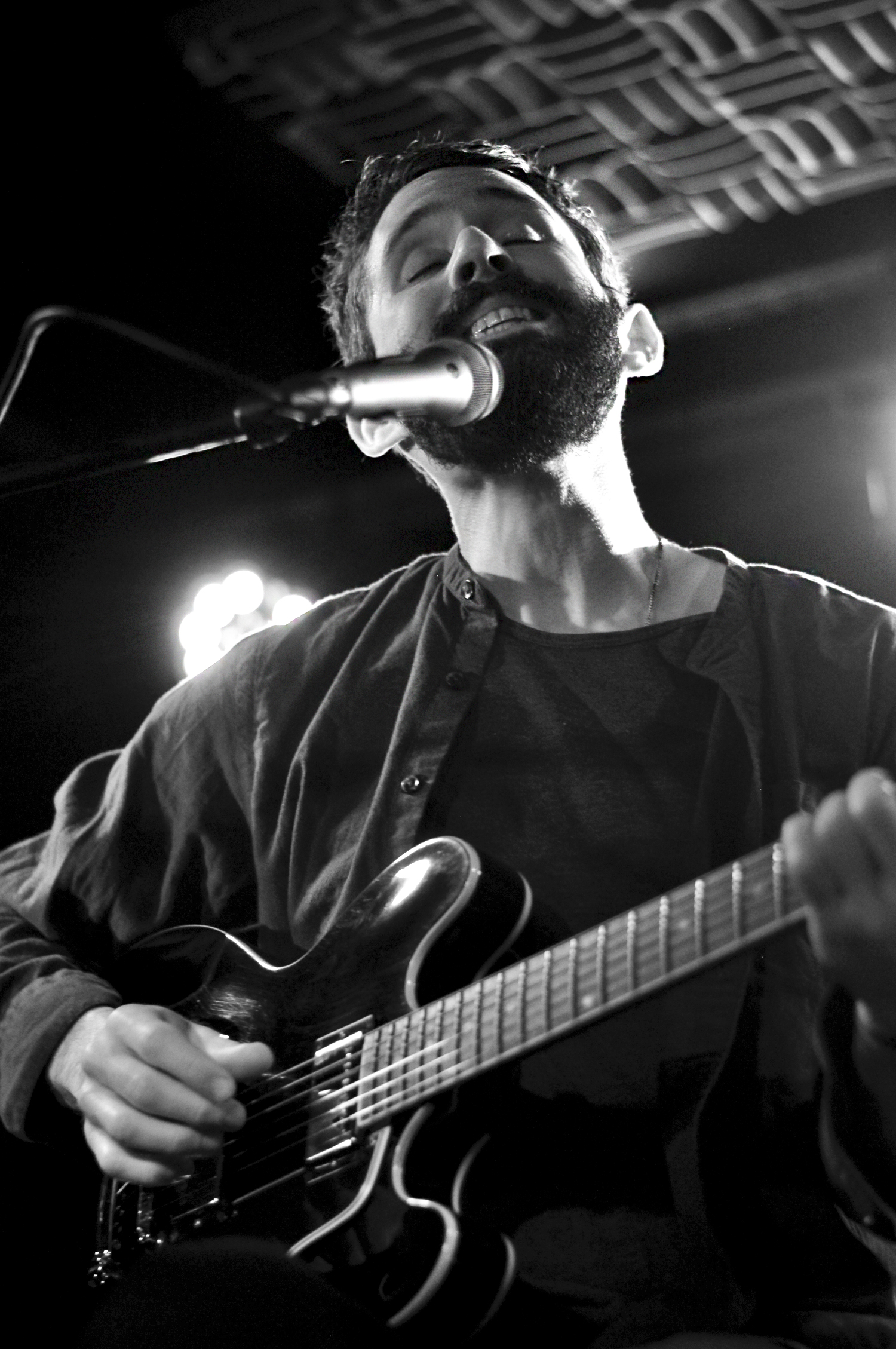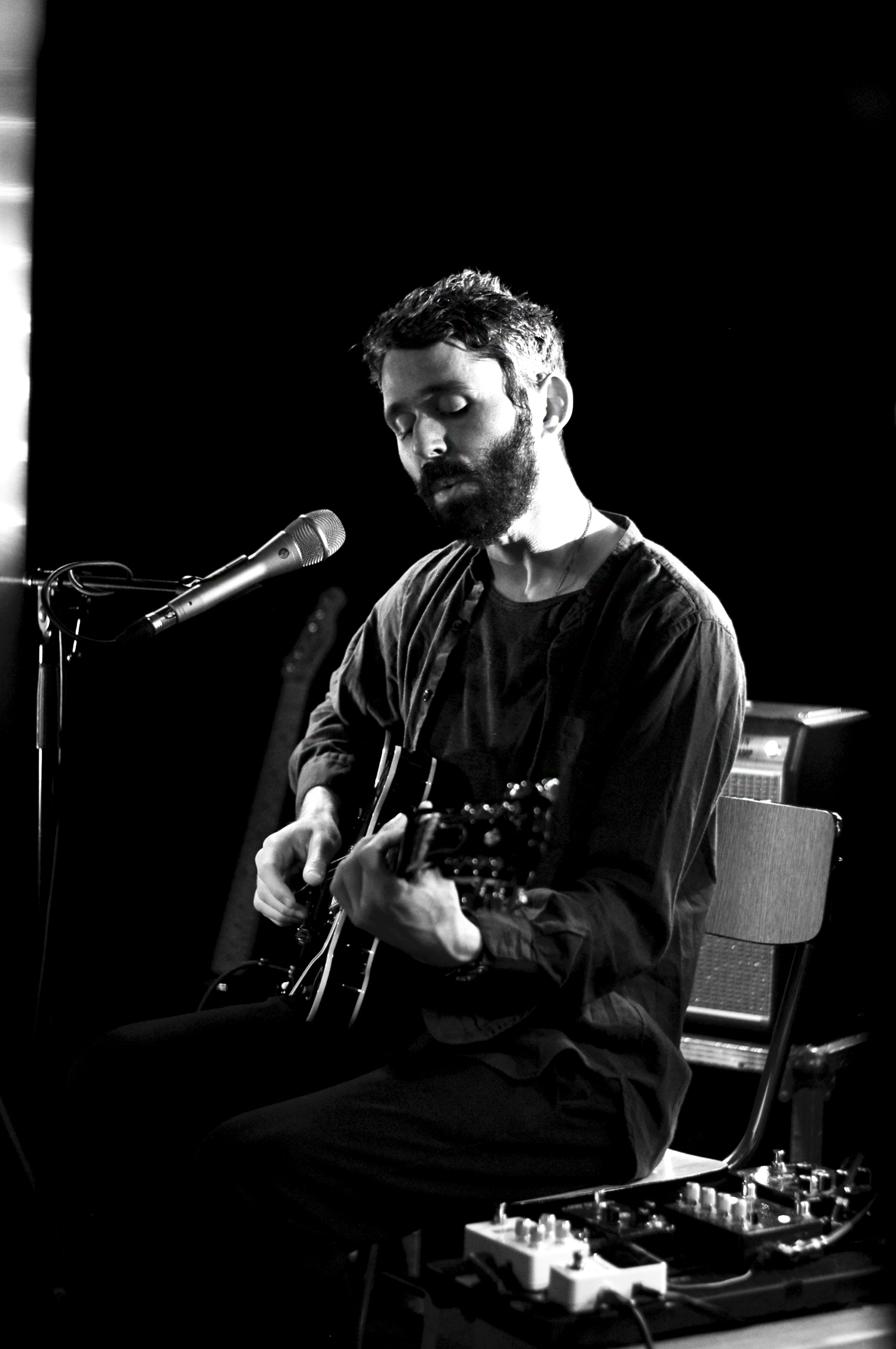Les mots sont poétiques et la voix intense. Tout en nuances, son jeu de guitare est délicat. Échangeant sa guitare folk pour une autre acoustique mais celle-ci semble avoir été bricolée pour l’électrifier. Le son est aérien, tantôt agressif, tantôt doux. La réverb’ est puissante ce qui participe à l’effet fantastique et envoûtant.