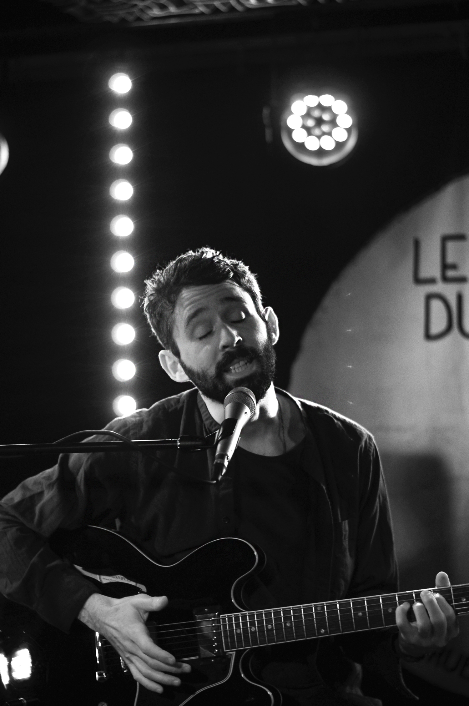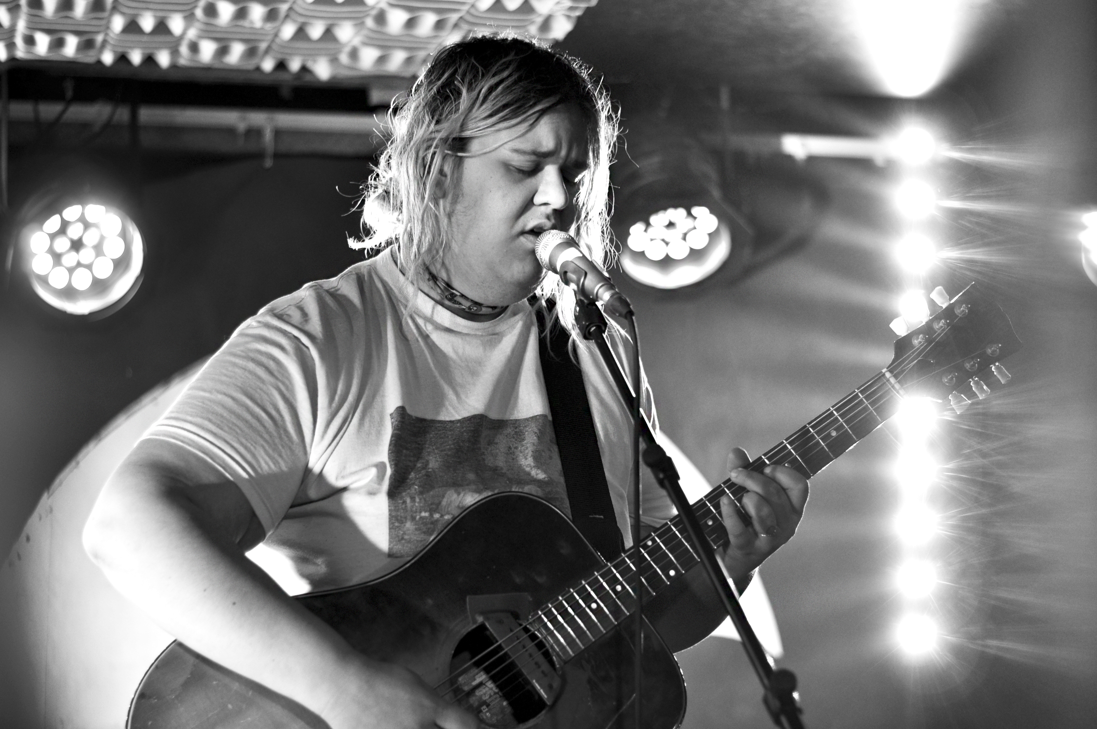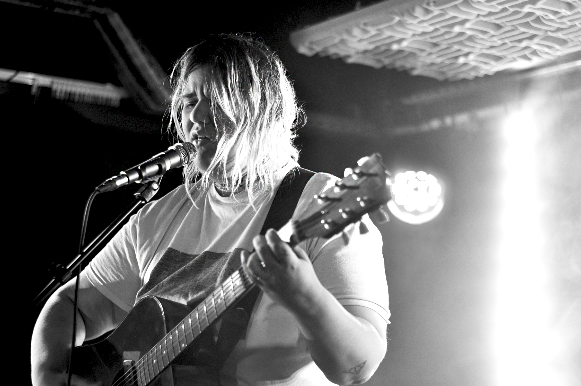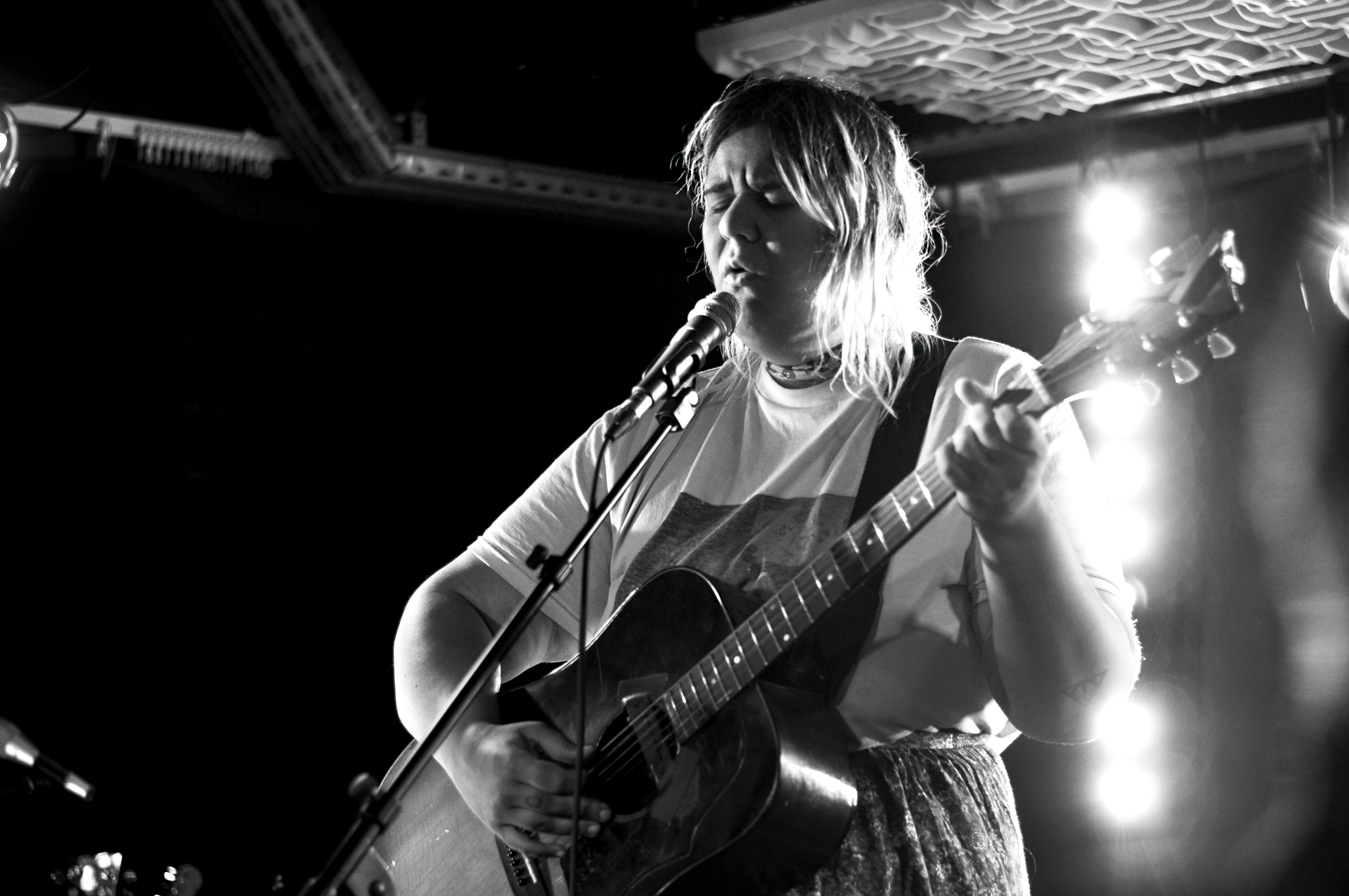 Les mots sont poétiques et la voix intense. Tout en nuances, son jeu de guitare est délicat. Échangeant sa guitare folk pour une autre acoustique mais celle-ci semble avoir été bricolée pour l’électrifier. Le son est aérien, tantôt agressif, tantôt doux. La réverb’ est puissante ce qui participe à l’effet fantastique et envoûtant.