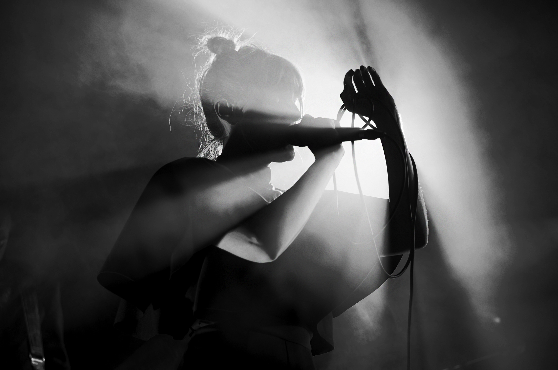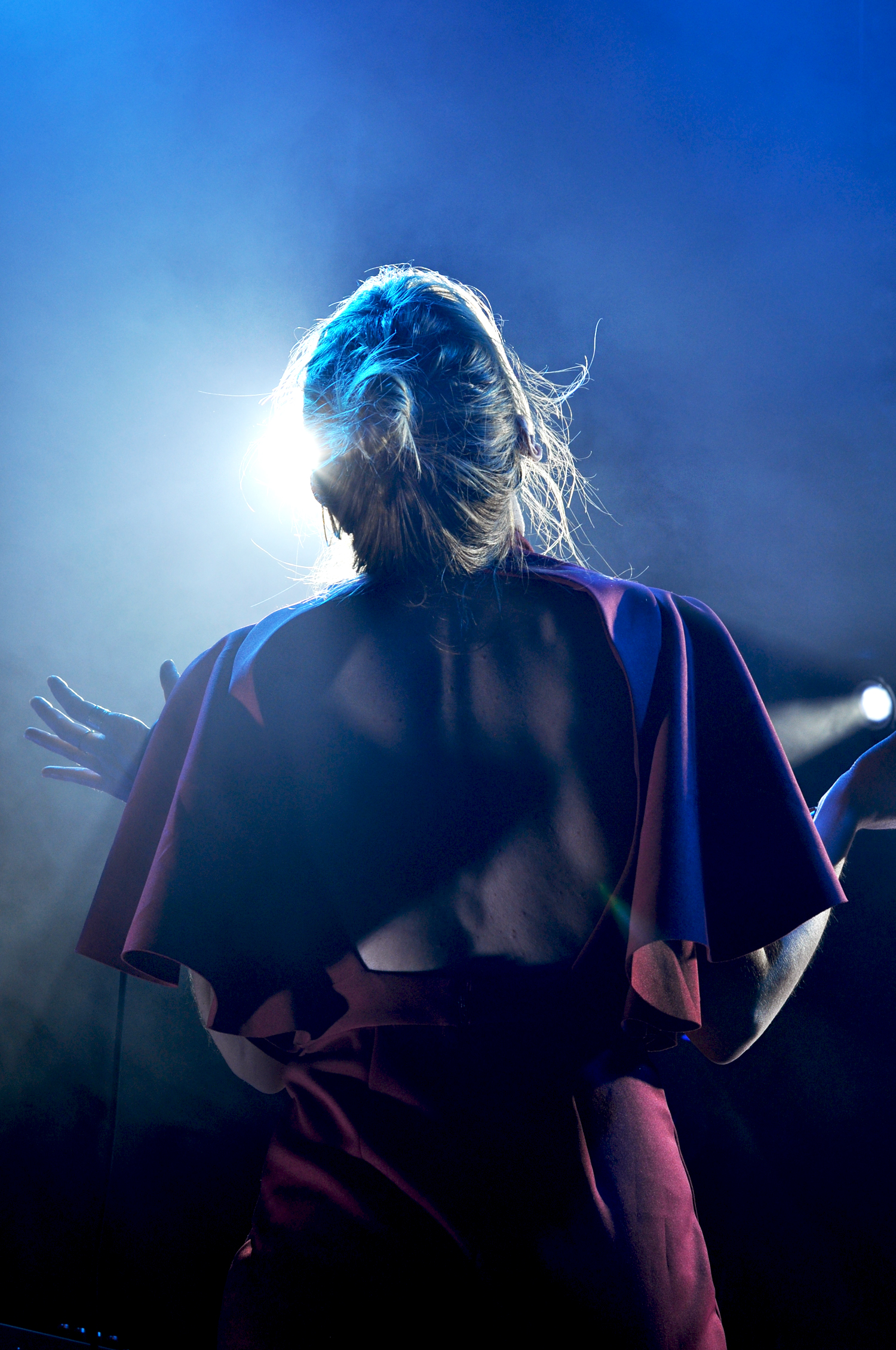 La scène est embrumée d’un brouillard de fumée lorsque Blondino fait son entrée. Dans une combinaison rouge passion, dos nu et dos au public elle commence son set très chorégraphié. Au moment de se retourner et de jouer les premières notes d’un deuxième titre, un problème de carte son, nous dira-t-on ensuite, survient. Quelques longues minutes d’hésitation/réparation s’ensuivent. Longues minutes qui permettent à Blondino d’exprimer sa joie d’être sur scène, et au public de crier que “l’album est magnifique”. Les présentations sont faites, le show peut reprendre.