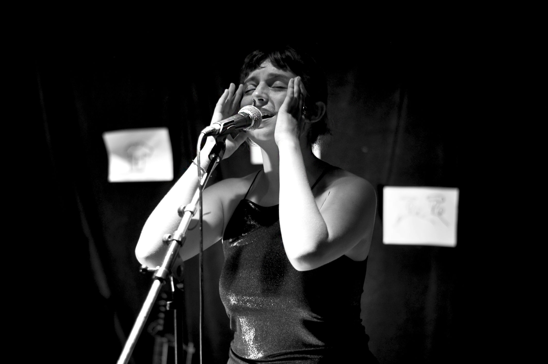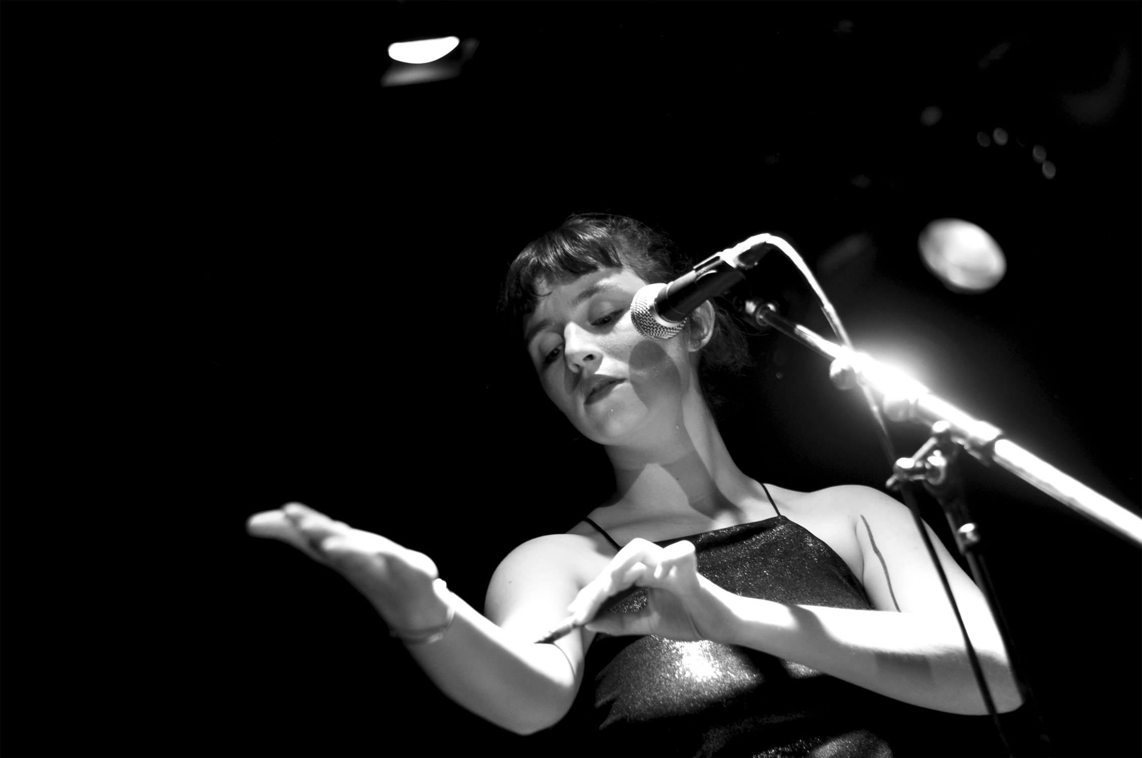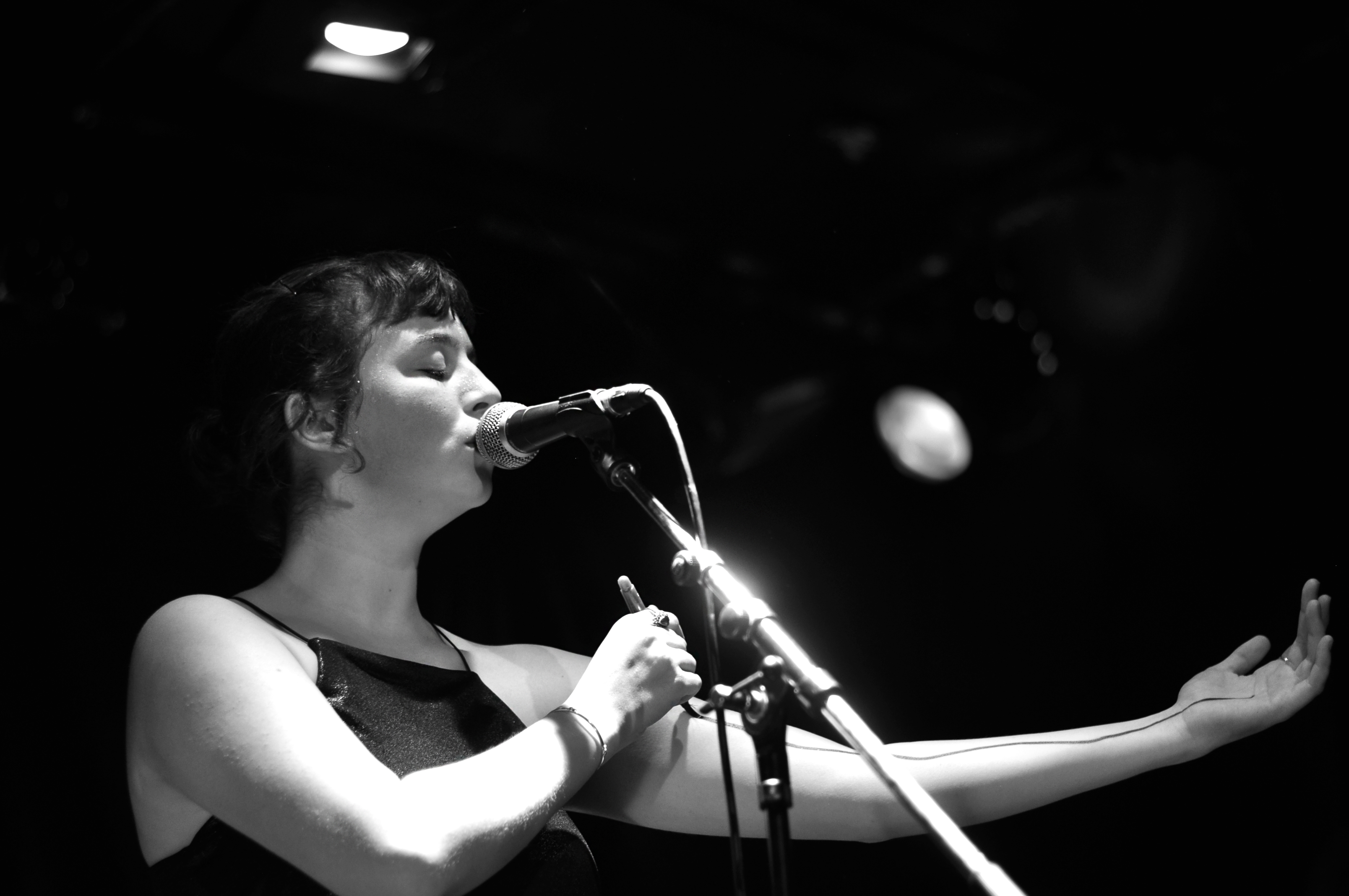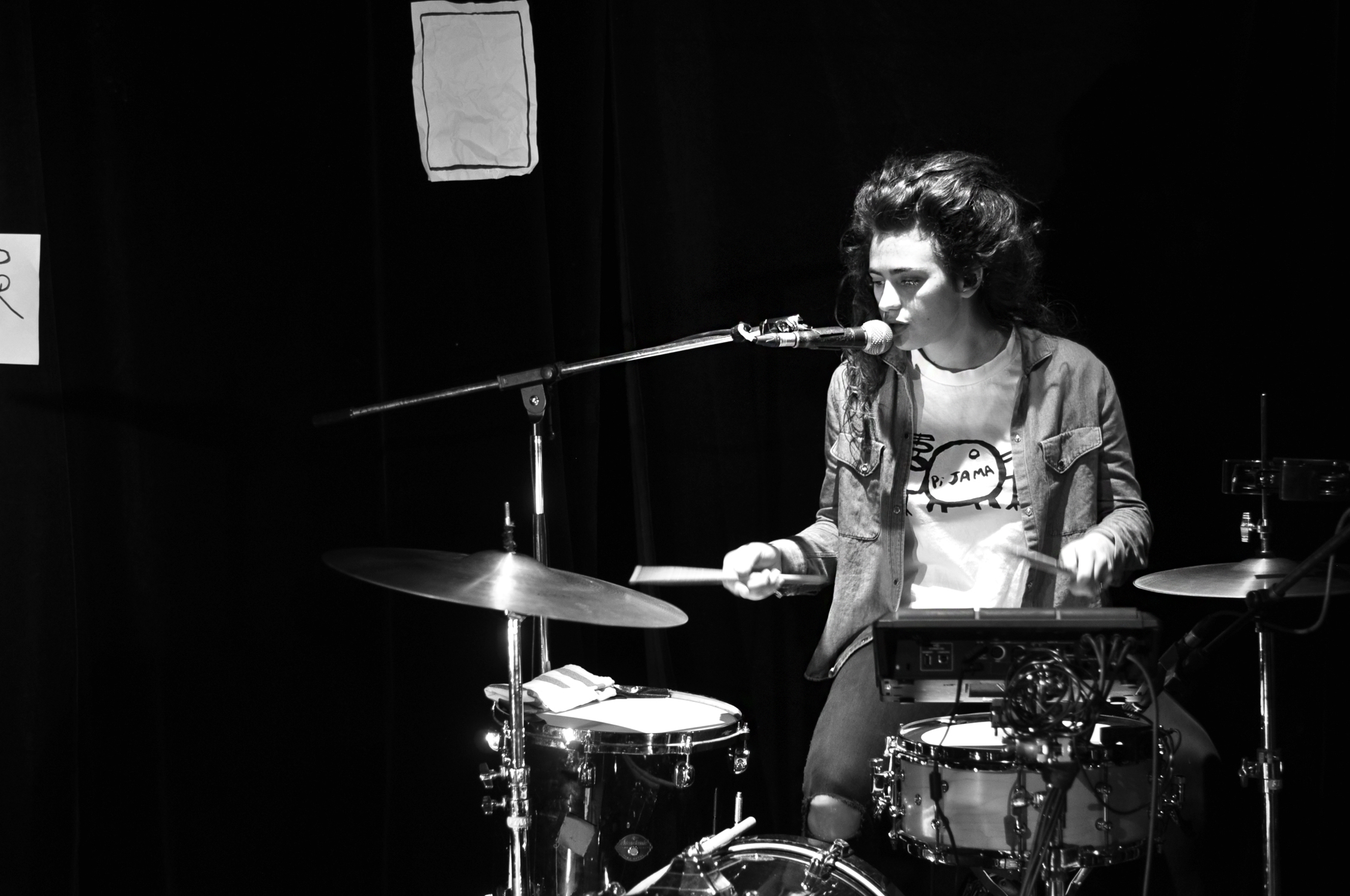 Après avoir parsemé la scène de dessins à l’encre noire, marque de fabrique de Pi Ja Ma, le groupe monte sur scène. Une batteuse, un guitariste, une bassiste se partagent avec équilibre l’accompagnement et les chœurs. On se souvient de l’impression plutôt rock indé qu’on avait eue au festival Les Femmes s’en mêlent. Ce soir, dans une salle plus intimiste, Pi Ja Ma nous apparaît plus douce et psychédélique.