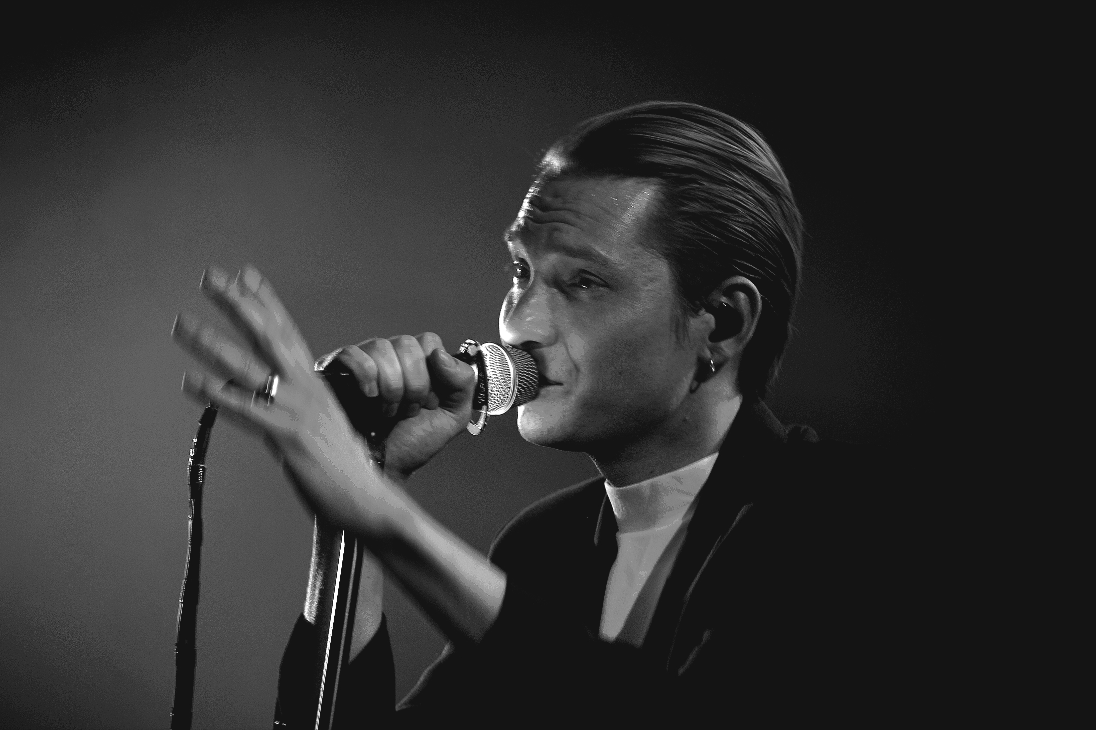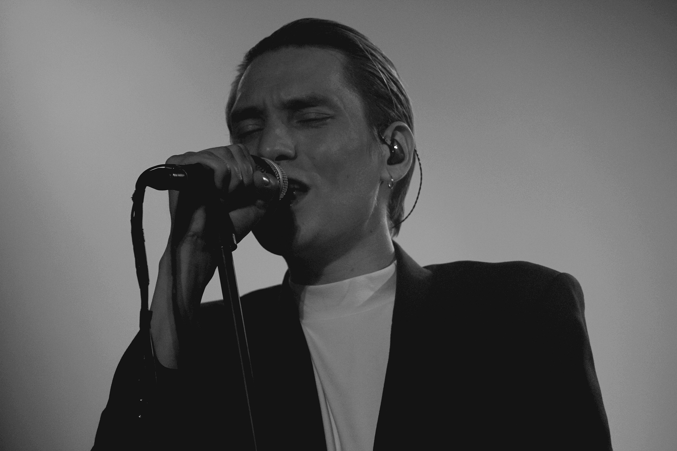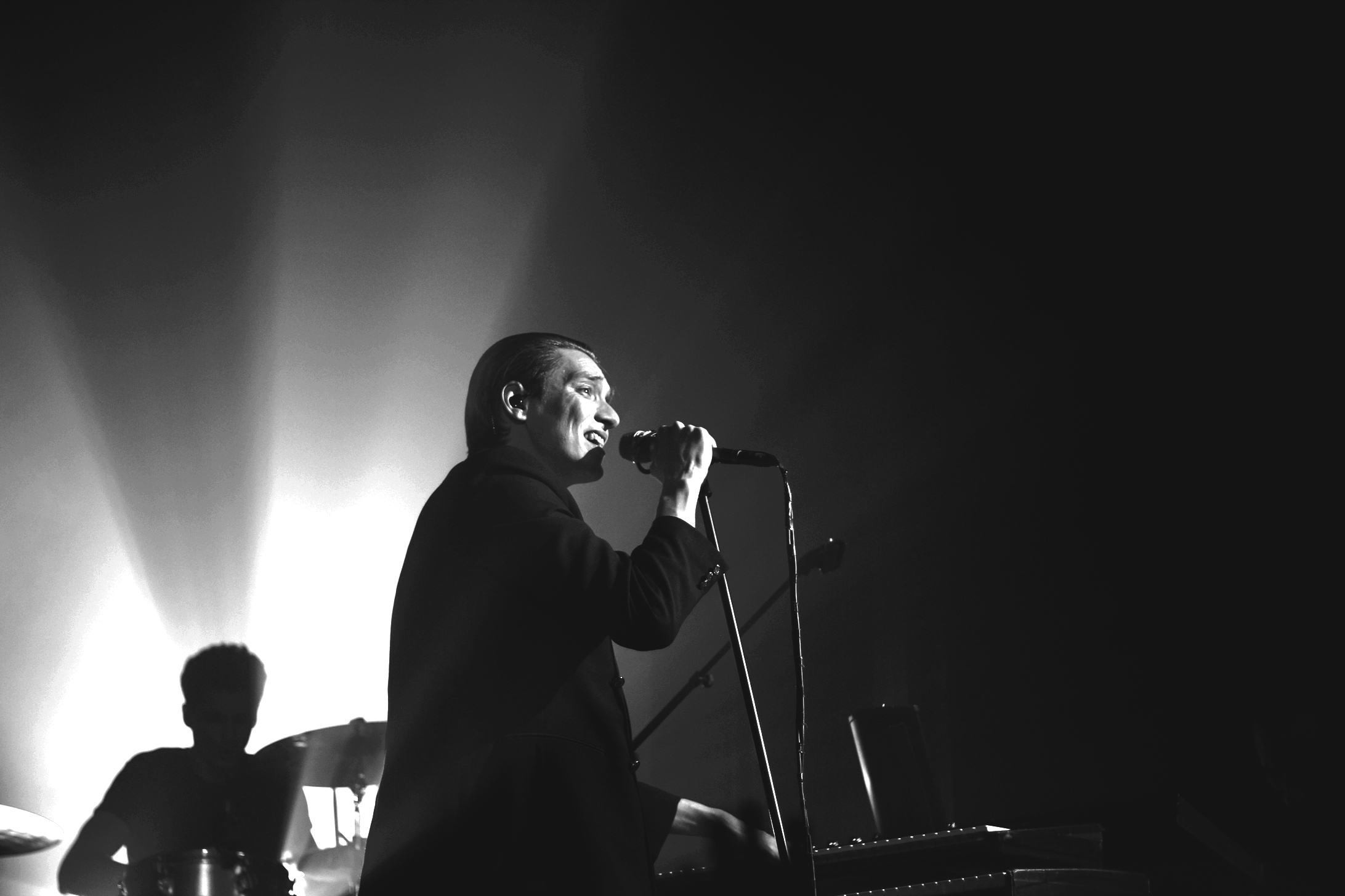 21h10. Thomas Azier, son col roulé blanc et son costume foncé débarquent enfin sur scène, accompagné de trois musiciens, acclamé par un public prêt à en découdre. Le groupe est encadré par des rideaux noirs, fendus, qui ondulent au gré des ventilateurs juste placés derrière. Thomas Azier apparaît dans un voil de fumée, cheveux bien peigné en arrière.