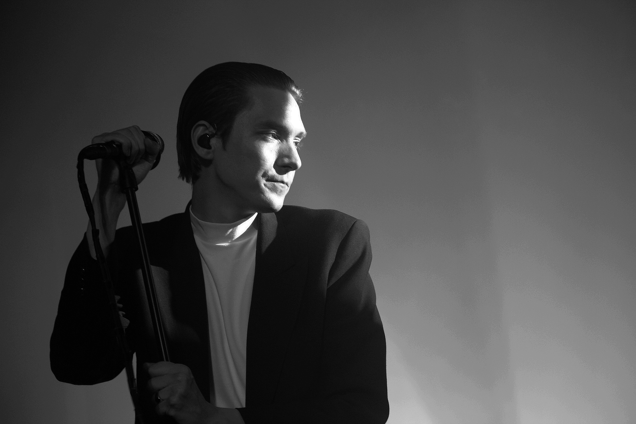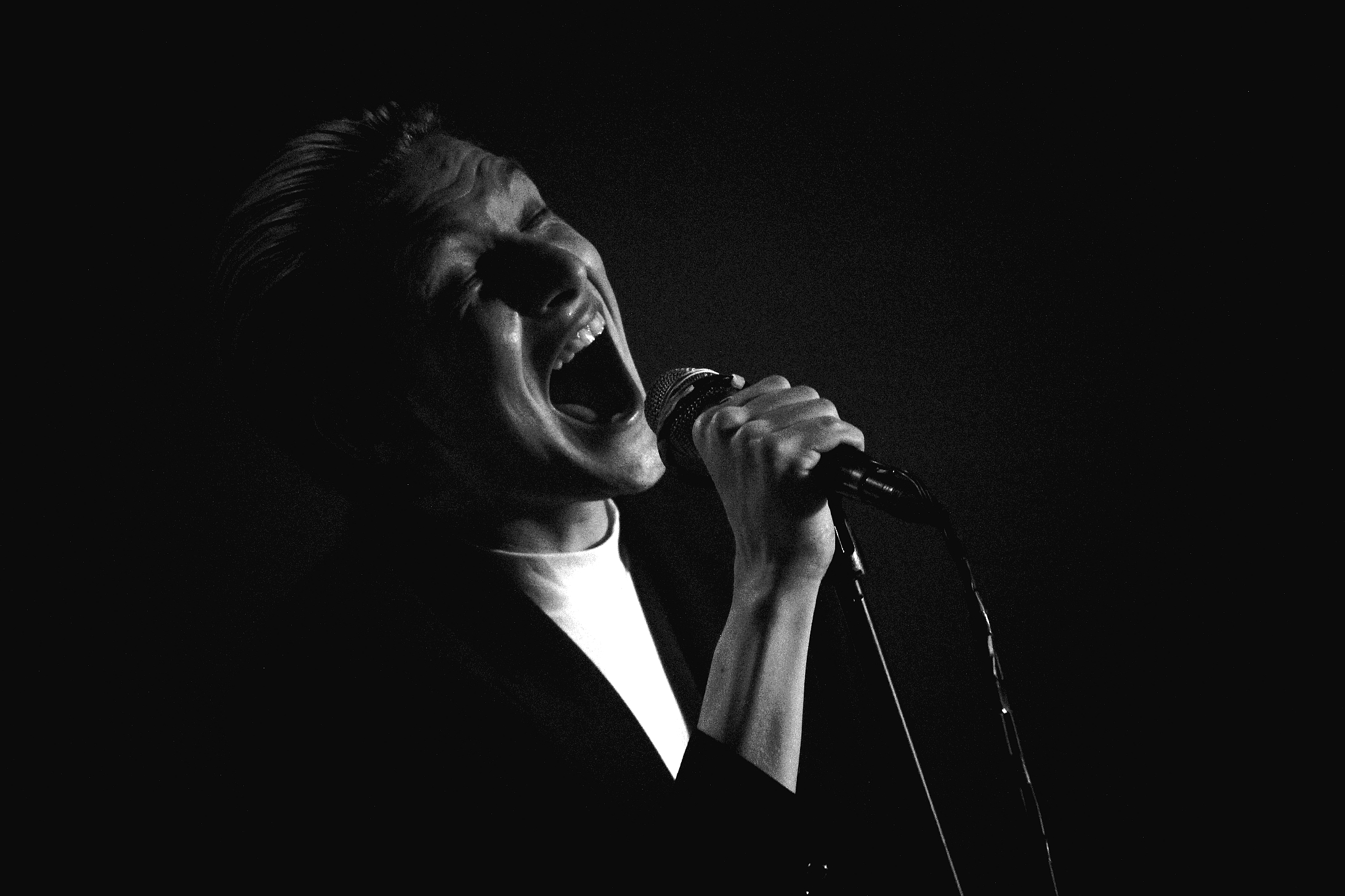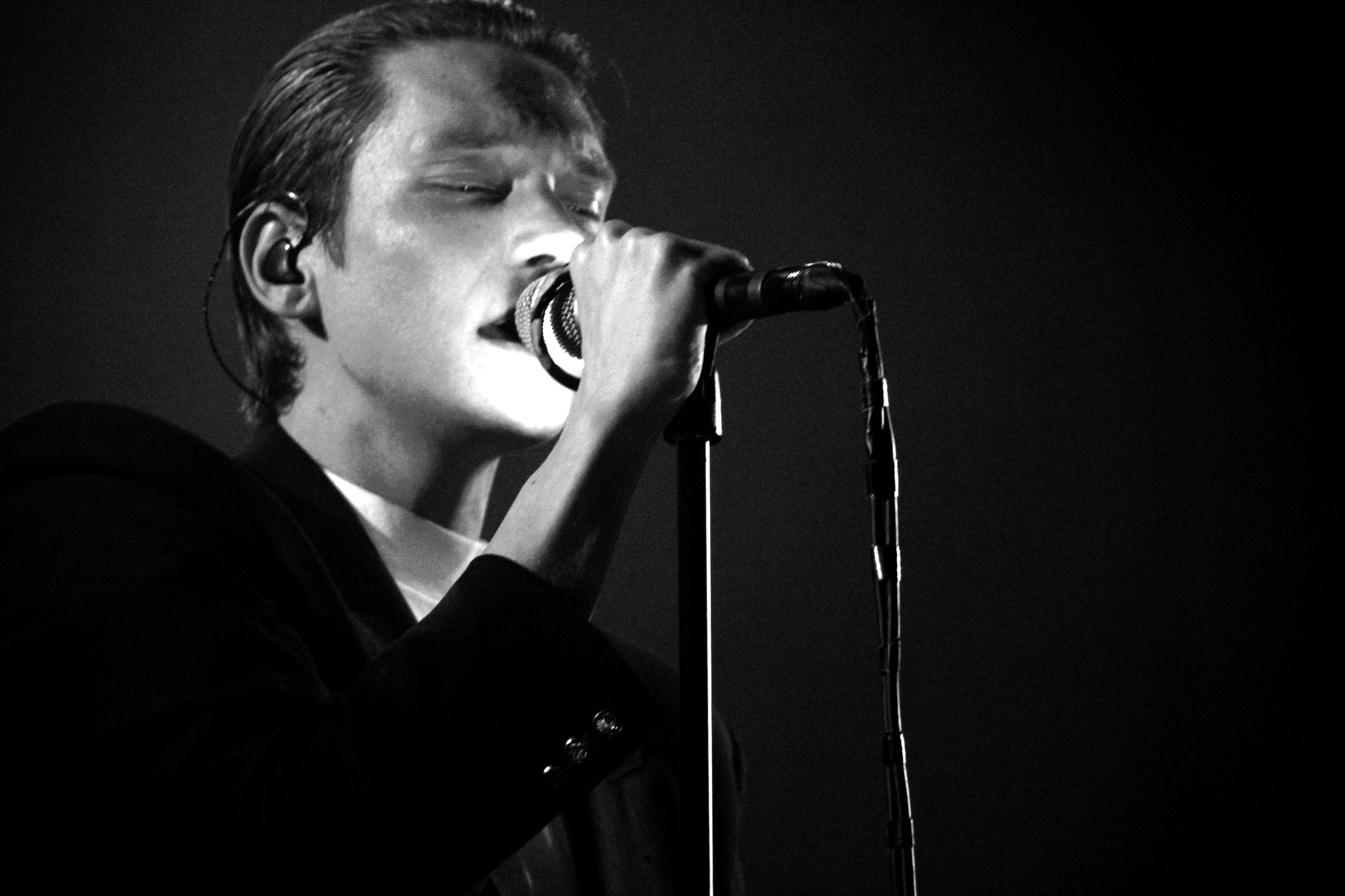 21h10. Thomas Azier, son col roulé blanc et son costume foncé débarquent enfin sur scène, accompagné de trois musiciens, acclamé par un public prêt à en découdre. Le groupe est encadré par des rideaux noirs, fendus, qui ondulent au gré des ventilateurs juste placés derrière. Thomas Azier apparaît dans un voil de fumée, cheveux bien peigné en arrière.