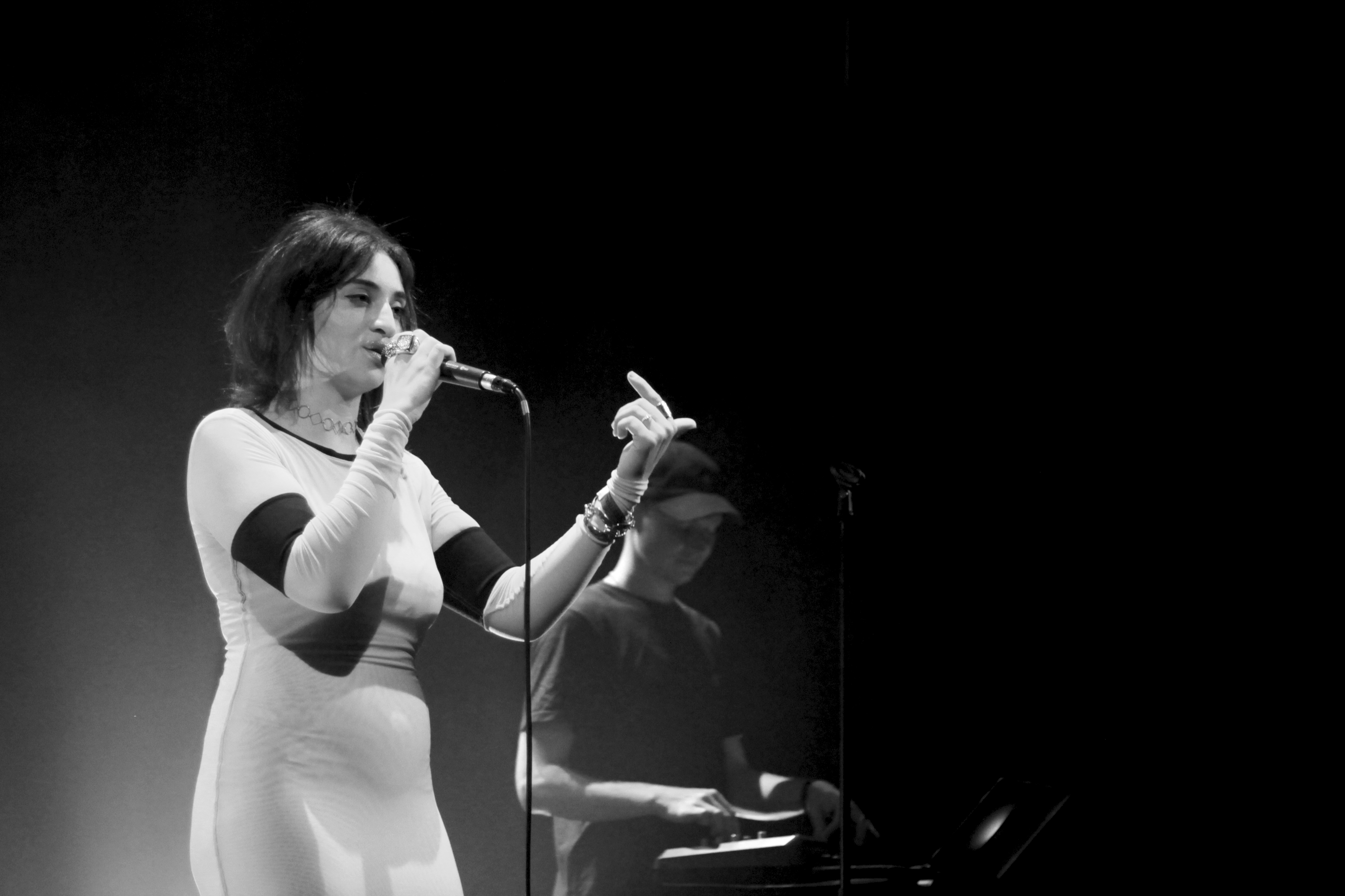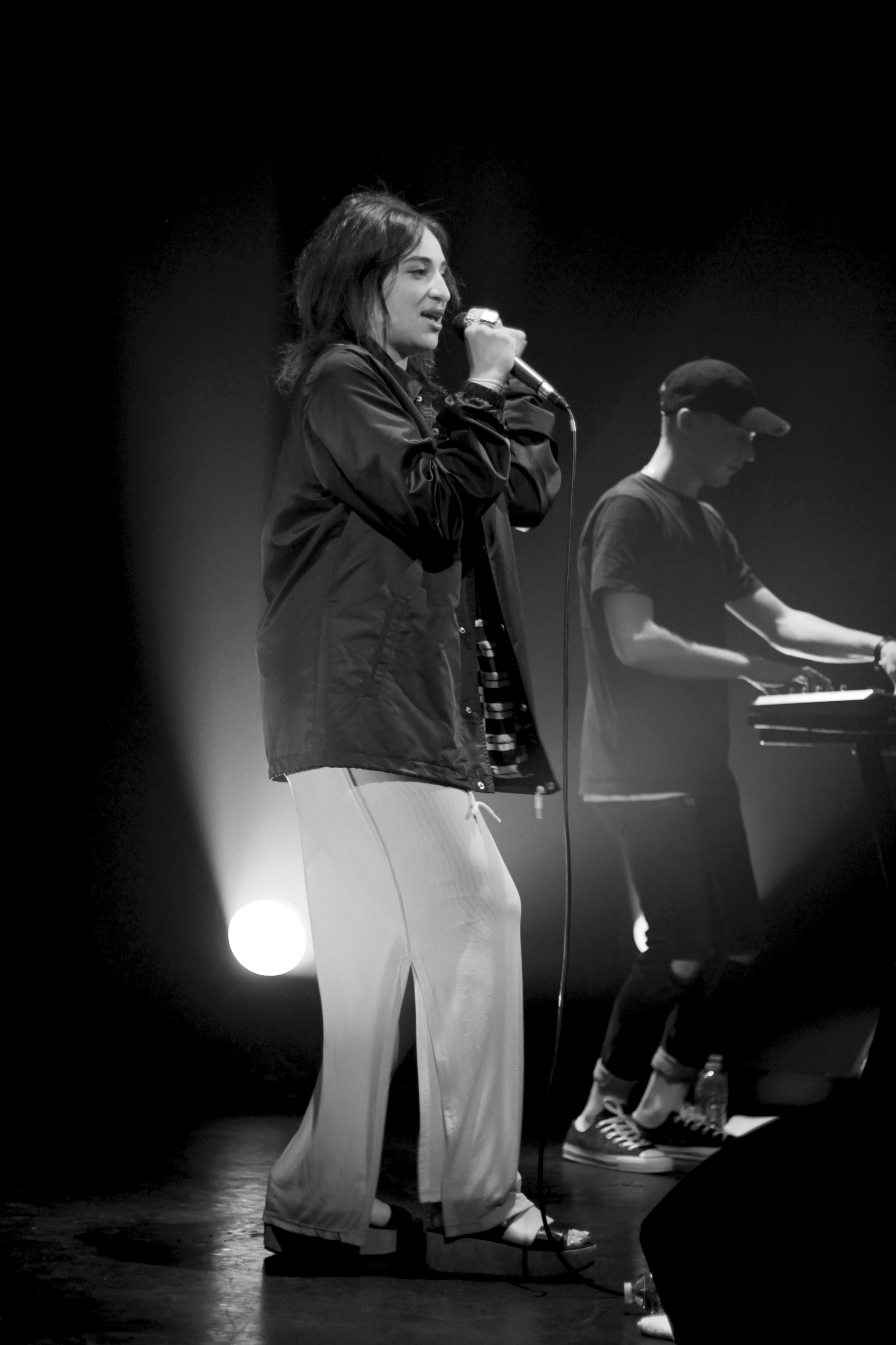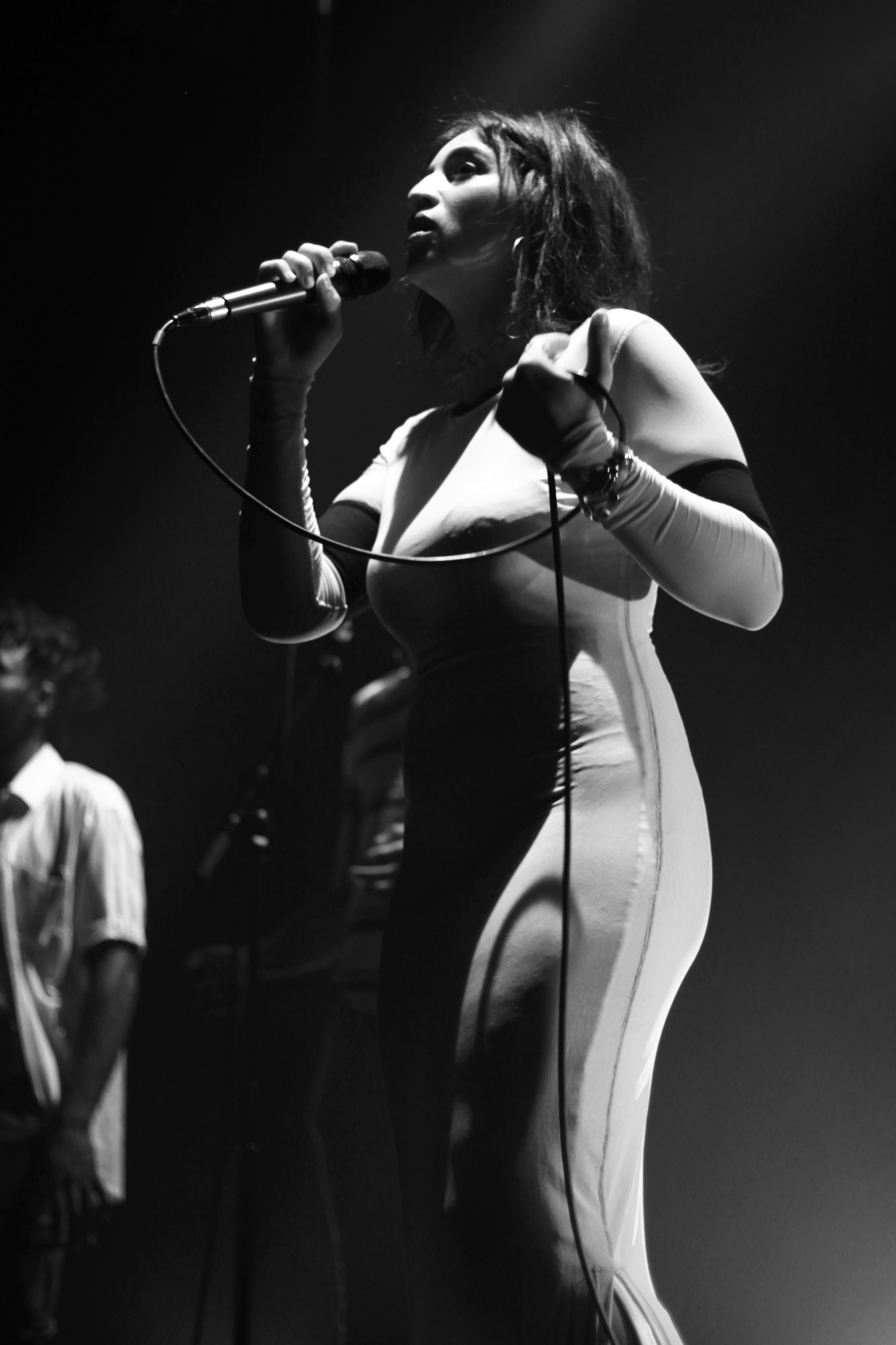 Lorsque Camélia Jordana et ses trois musiciens montent sur scène, le public semble avoir changé du tout au tout. Elle salue les têtes connues et présente rapidement l’origine de ce nouveau projet, qu’elle a monté avec Laurent Bardainne (qui ne peut pas être présent ce soir). LOST est né de la volonté de chanter l’entente et la tolérance entre tous. Et pour cela, elle joue du métissage de la musique et des langues, alternant arabe, français et anglais ; chant trad, pop, électro, hip-hop, etc.