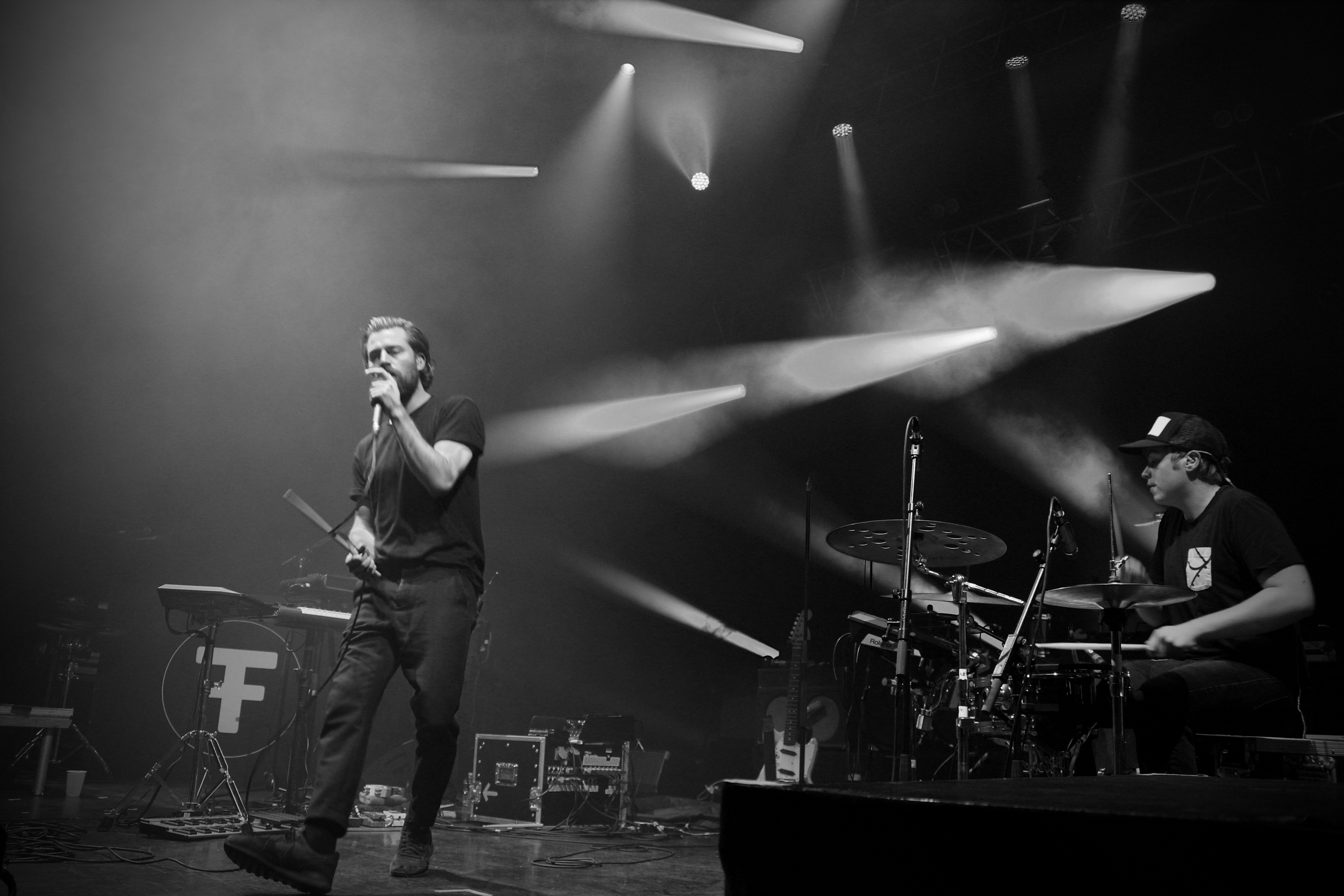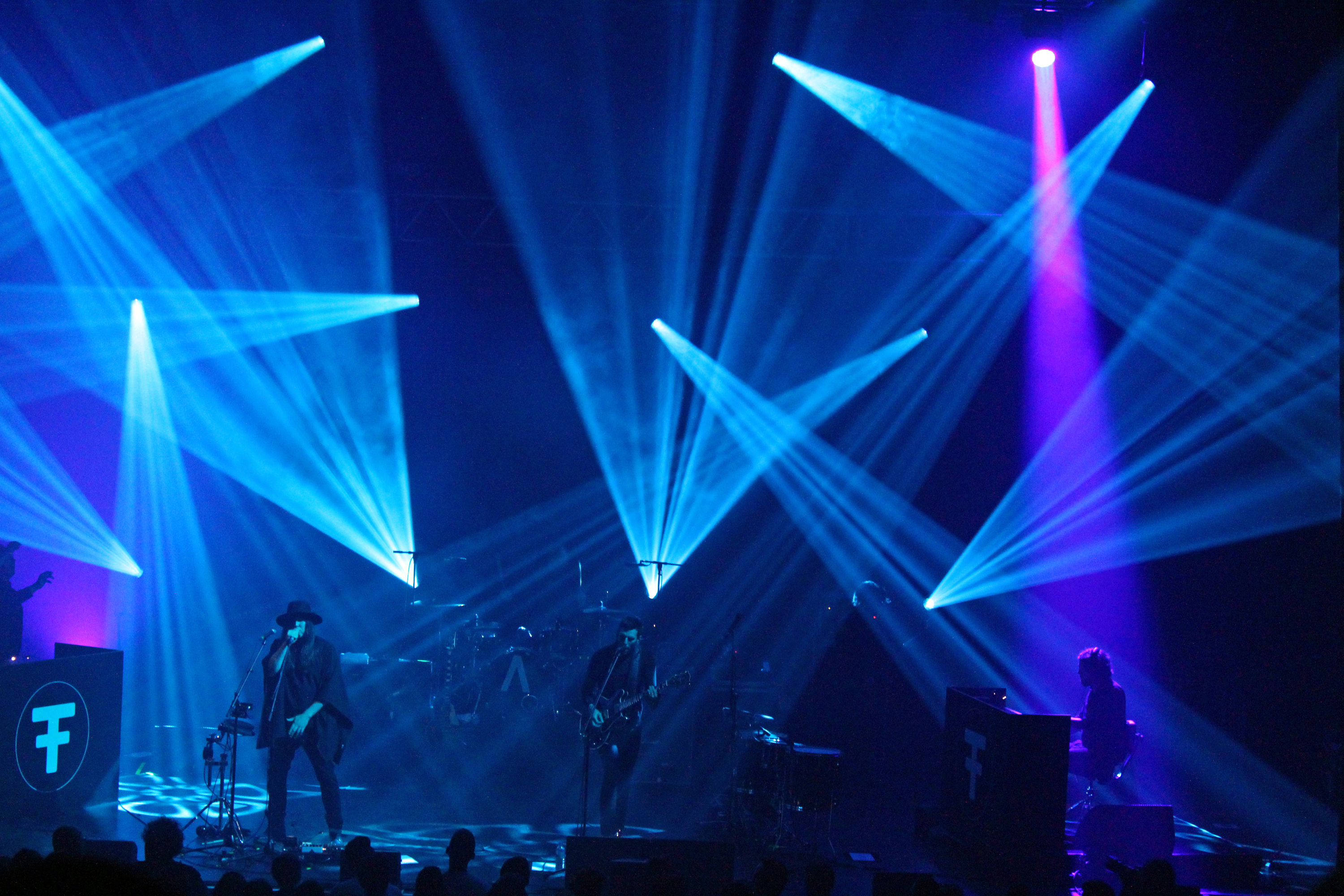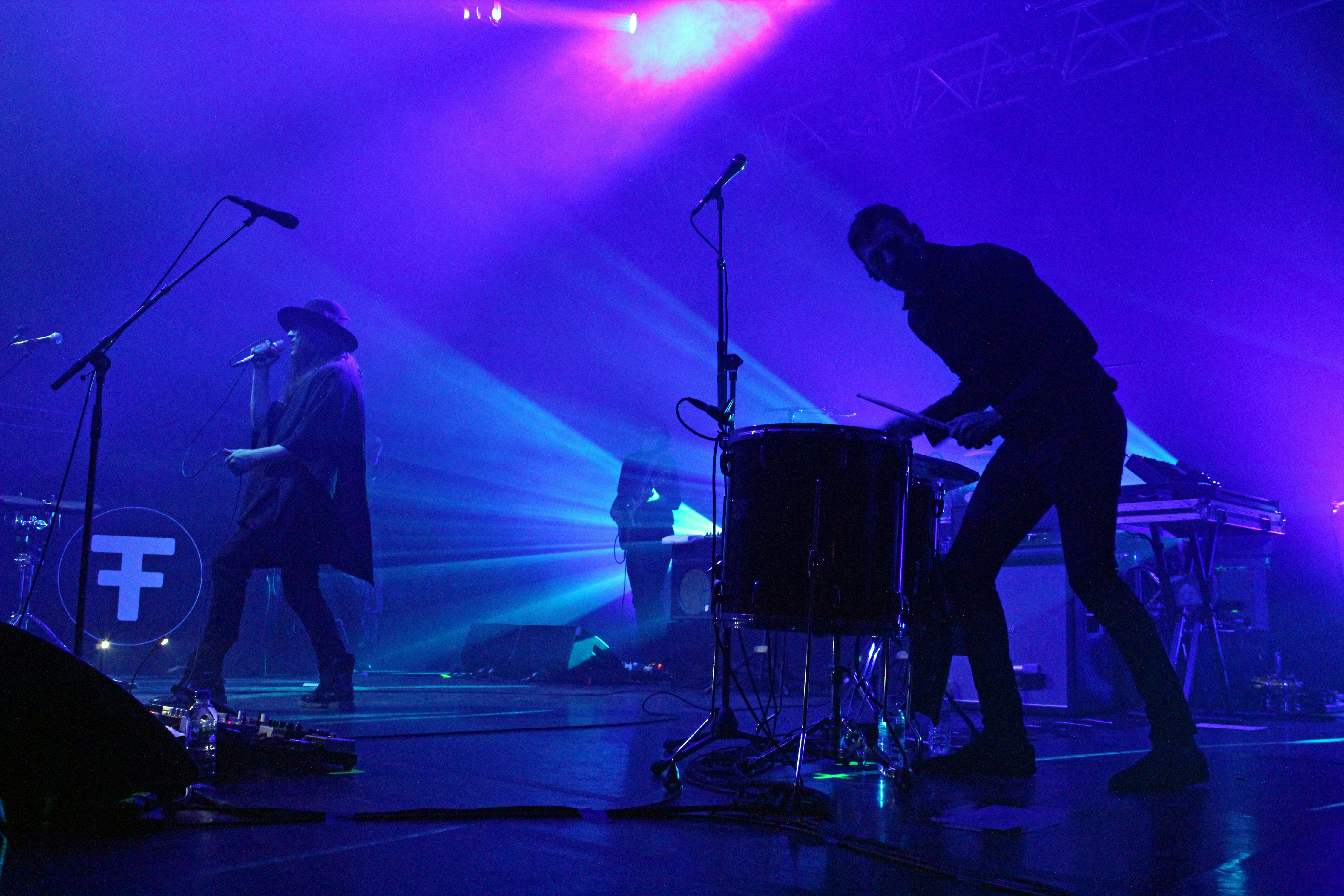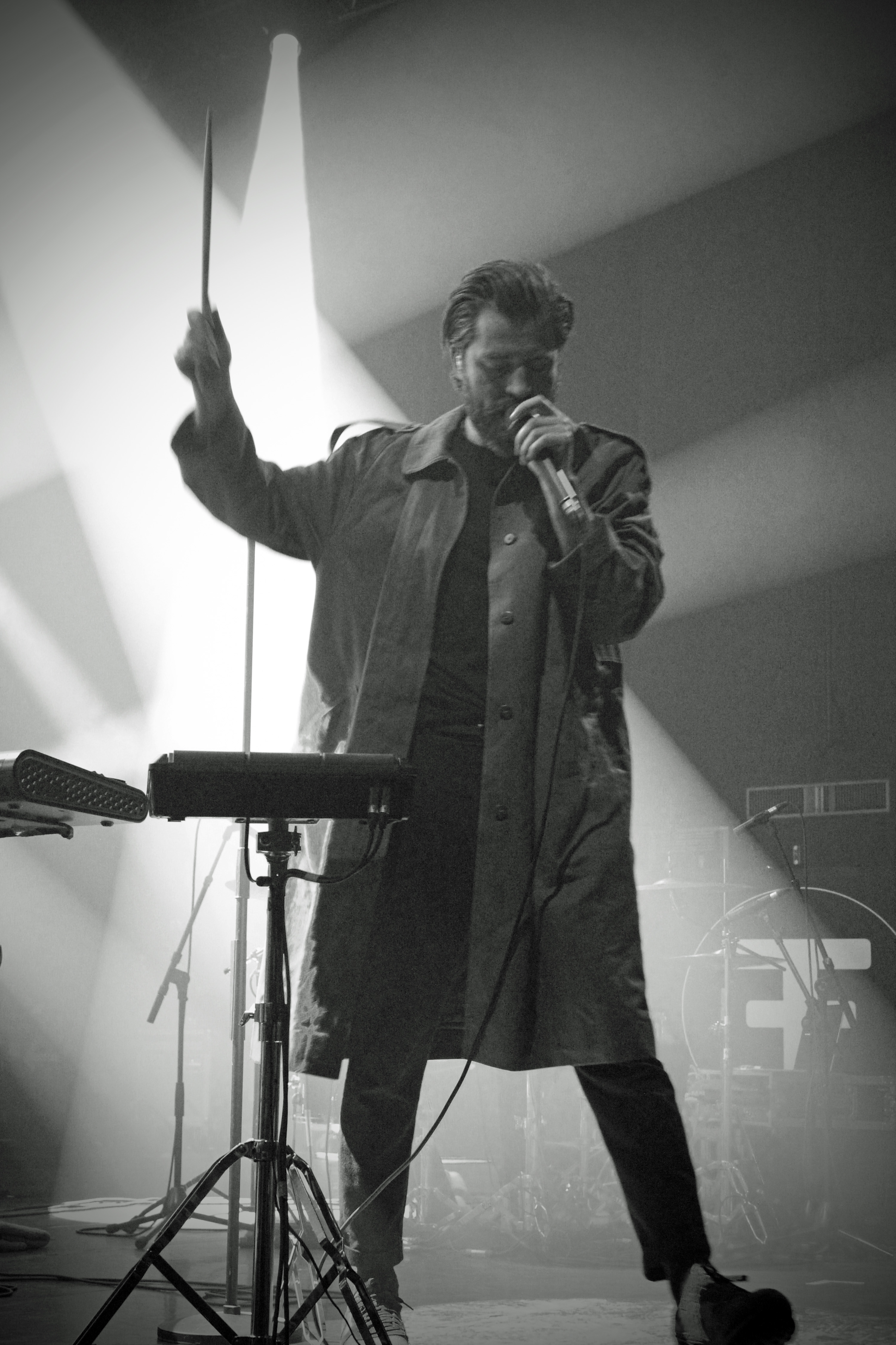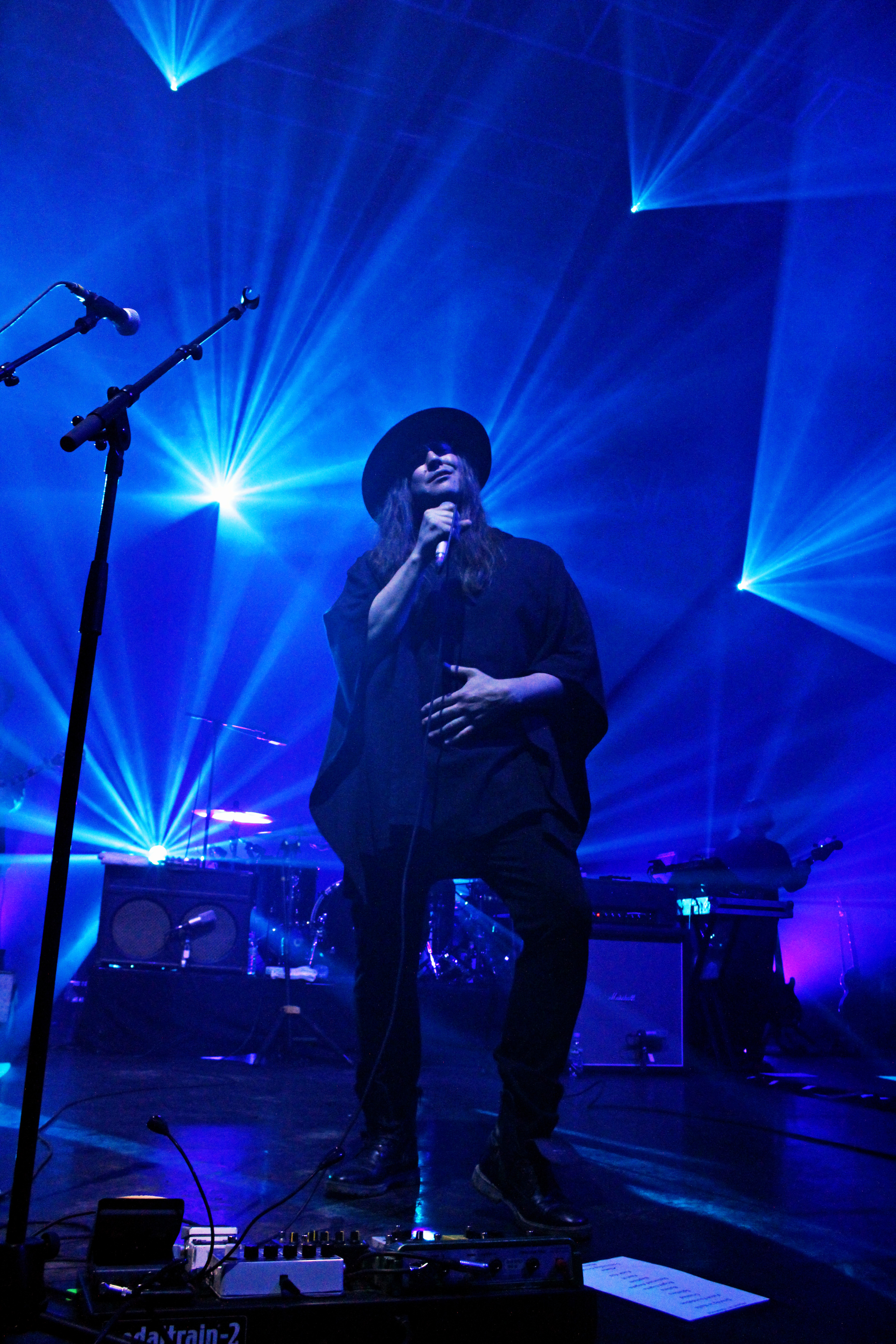 À peine le temps d’enlever les instruments de J.Bernardt (hommage, ici, à tout le service de La Coopé, qui fait un travail énorme à chaque concert), que le public est déjà chaud bouillant et attend avec impatience les stars de la soirée, Archive. 21h40, les lumières s’éteignent, et le groupe va se lancer dans un show d’une heure trente de folie. Le public connaît déjà tous les titres par cœur, les smartphones s’allument dans toute la salle pour filmer et photographier le groupe et la salle entière acclament et crient leur joie de retrouver Archive, dès la fin de “Driving In Nails”, premier titre du concert, issu de leur dernier album The False Foundation.