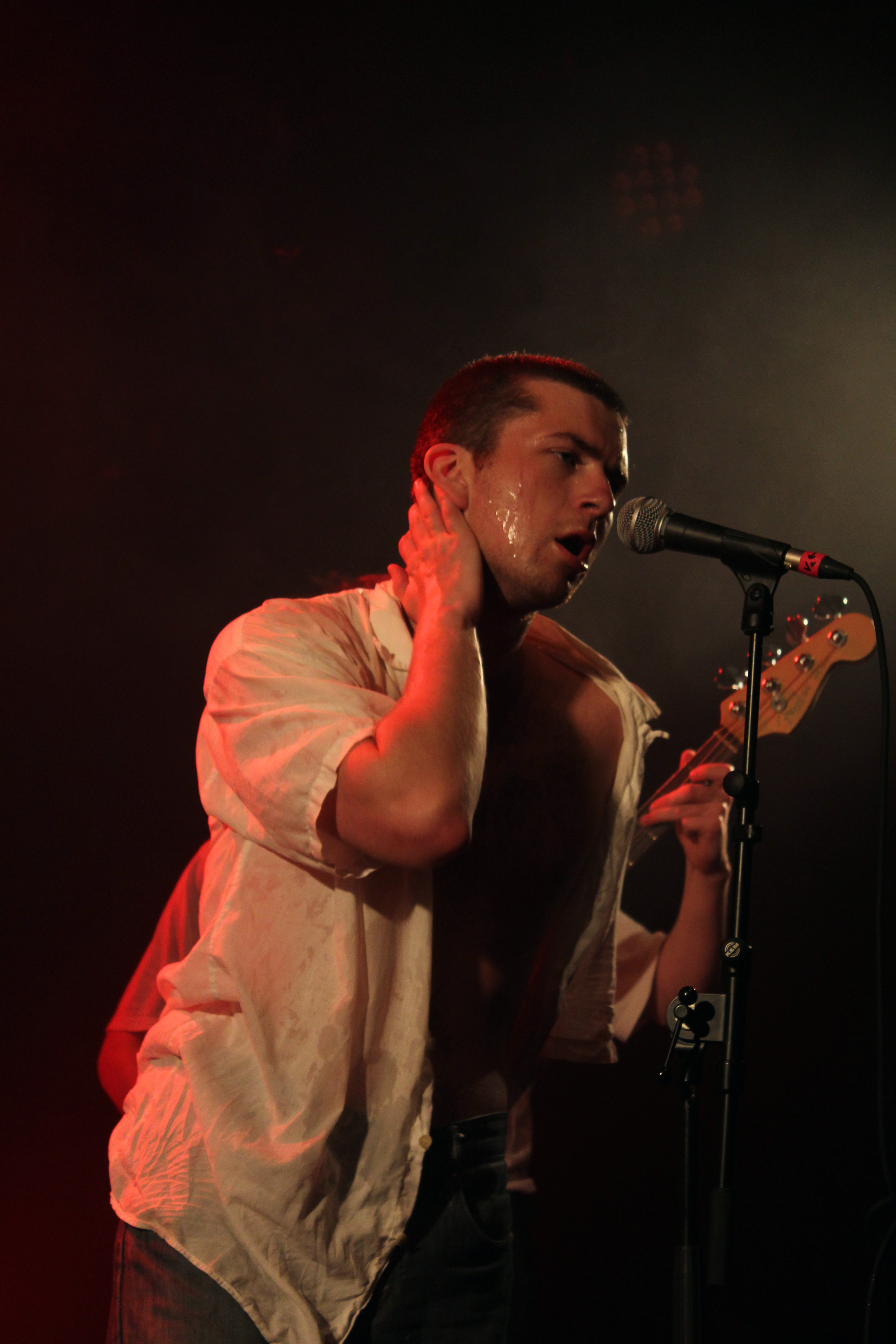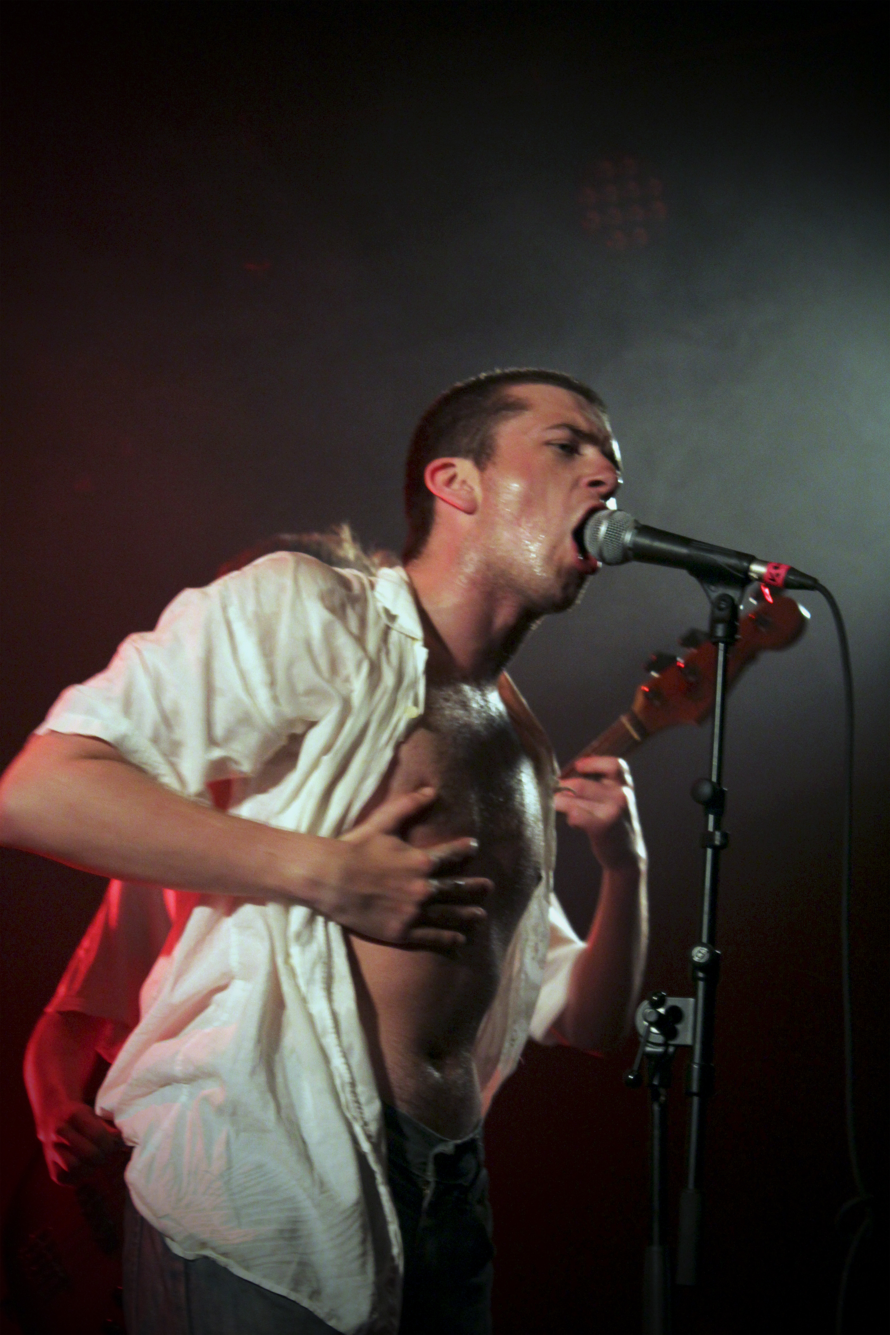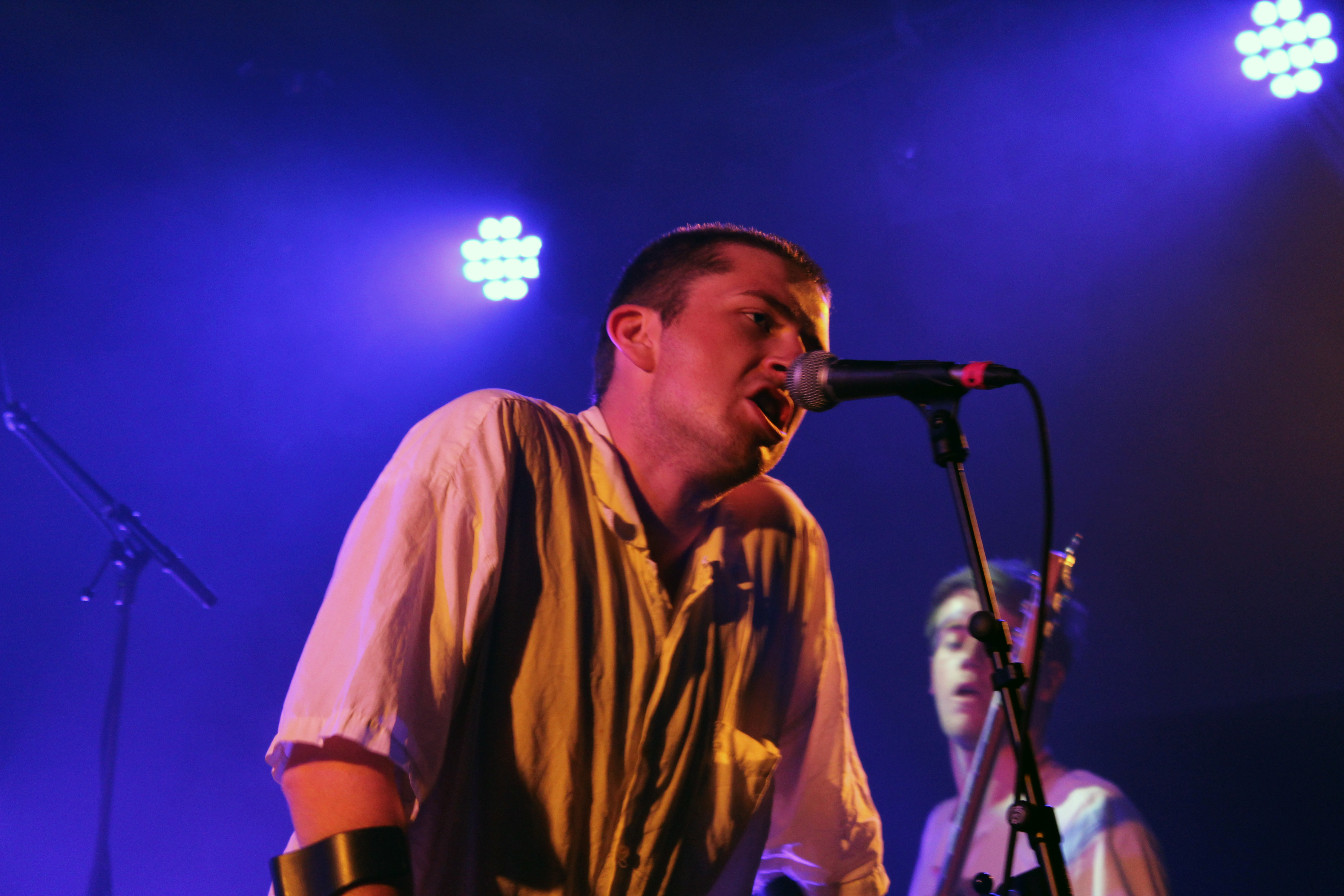 Certainement pas les Britanniques de Shame. Cinq jeunes Londoniens qui pourraient très vite connaître la même carrière que les Arctic Monkeys s’ils ne font pas de mauvais choix. Charlie Steen, chanteur du groupe, arrive en béquilles et bandage à la cheville, suite à un concert un peu trop punk la veille. Mais qu’importe béquilles ou non, le groupe fait le show dans tous les sens du terme. Petit strip-tease de la part du chanteur qui drague le public, guitariste et batteur merveilleux. On a chaud. Sexy Shame ! On en demande encore. Mais malheureusement, la tête d’affiche de la soirée (-M-) est en parallèle, et on se doit de les quitter en milieu de set.
