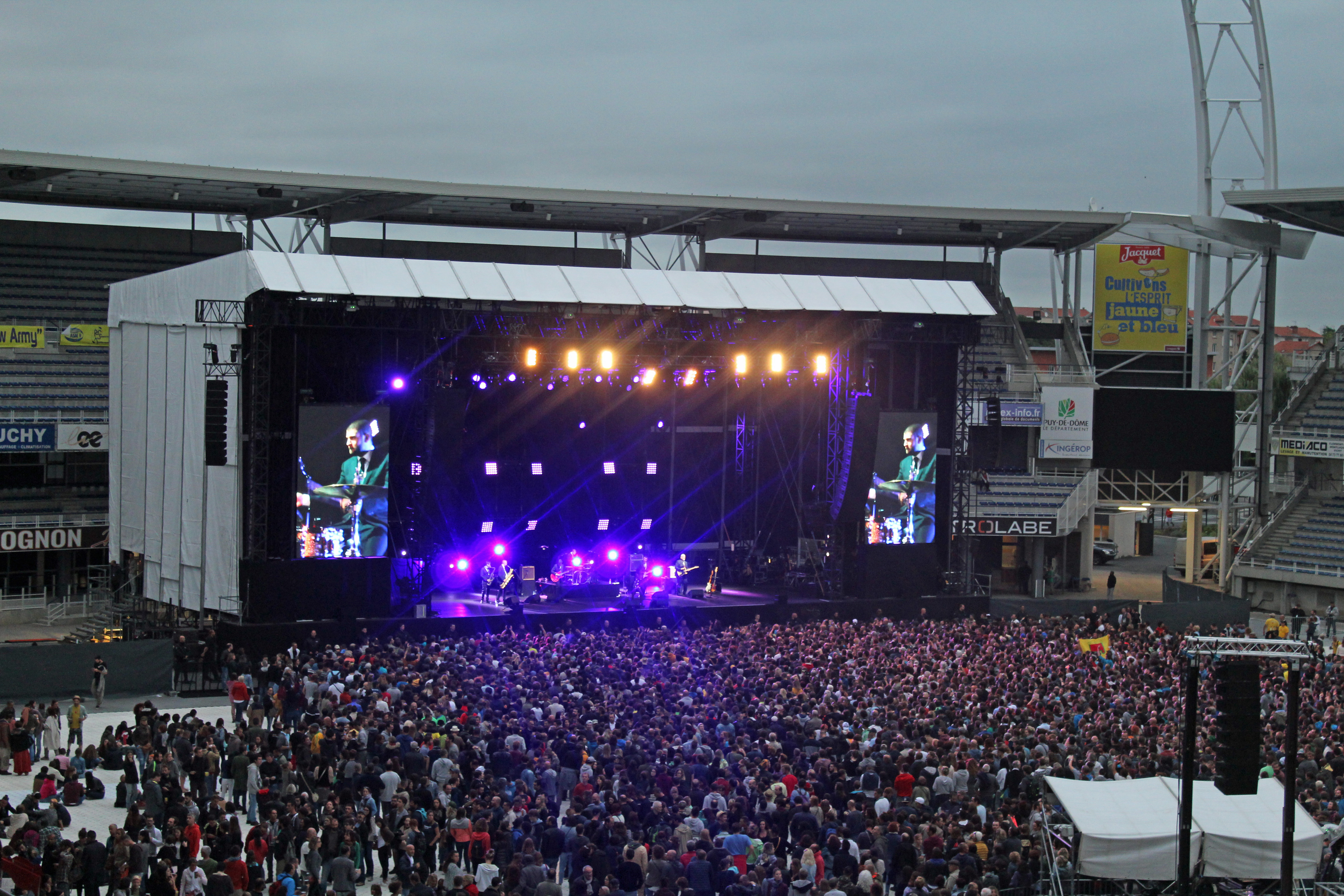 21h46, Montferrand est déjà en feu. Côté photographe, rarement le stade Michelin n’en aura vu autant. Côté public, 20 000 spectateurs se déchaînent. Alors que la guitare de Madjid Fahem commence à se faire entendre, Manu Chao salue “Vous êtes là les Champions ?” !! Rugby et Manu Chao, public bobo et “punks à chien” comme certains diraient. Ce n’est plus Europavox, c’est une fête anti-nationalisme et FN que l’on peut voir ce soir ! Car il n’y qu’une seule France, celle qui aime la fête, celle qui aime les cultures du monde entier et ne se referme pas sur soi ! C’est une ode au partage et une excellente publicité pour la candidature de Clermont-Ferrand à la Capitale Européenne de la Culture.