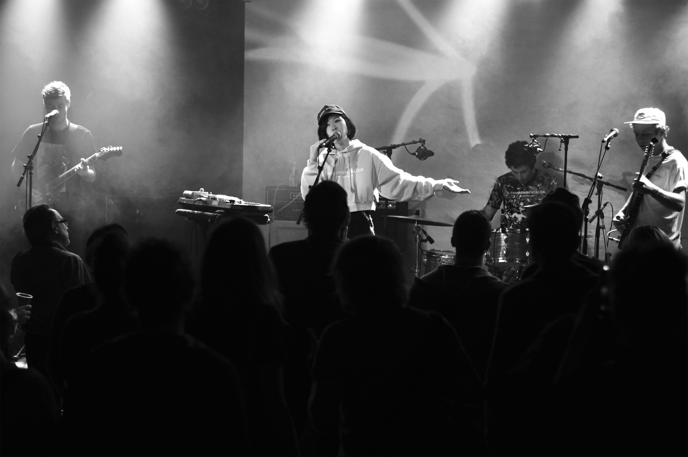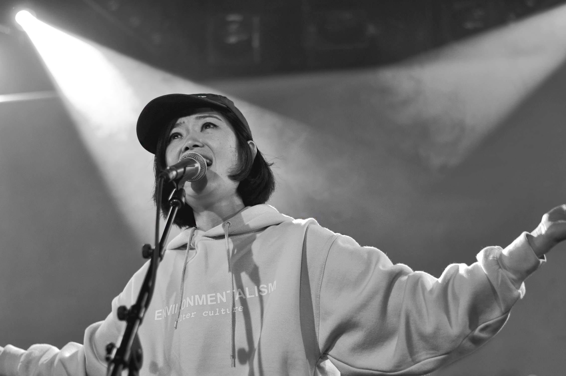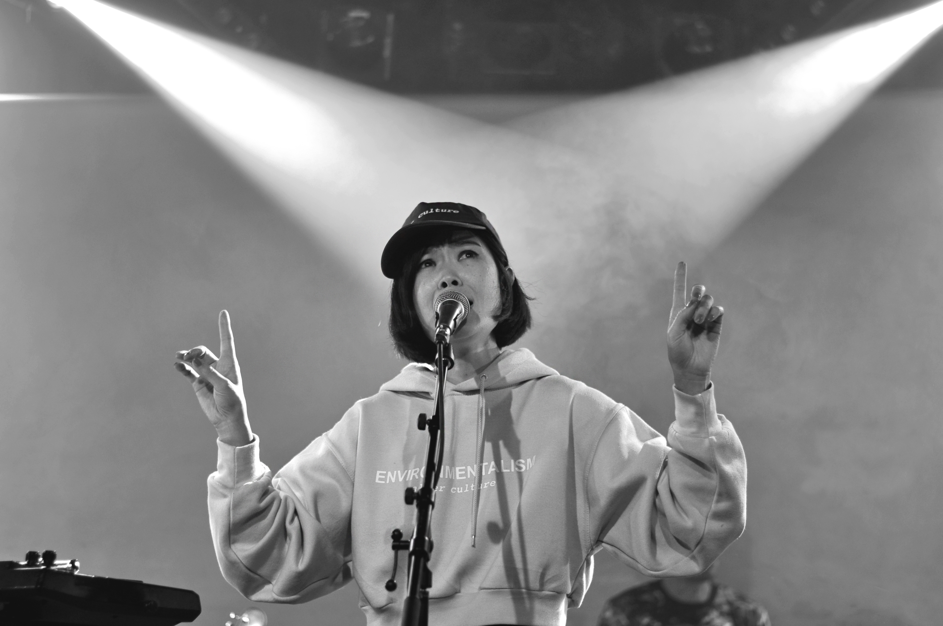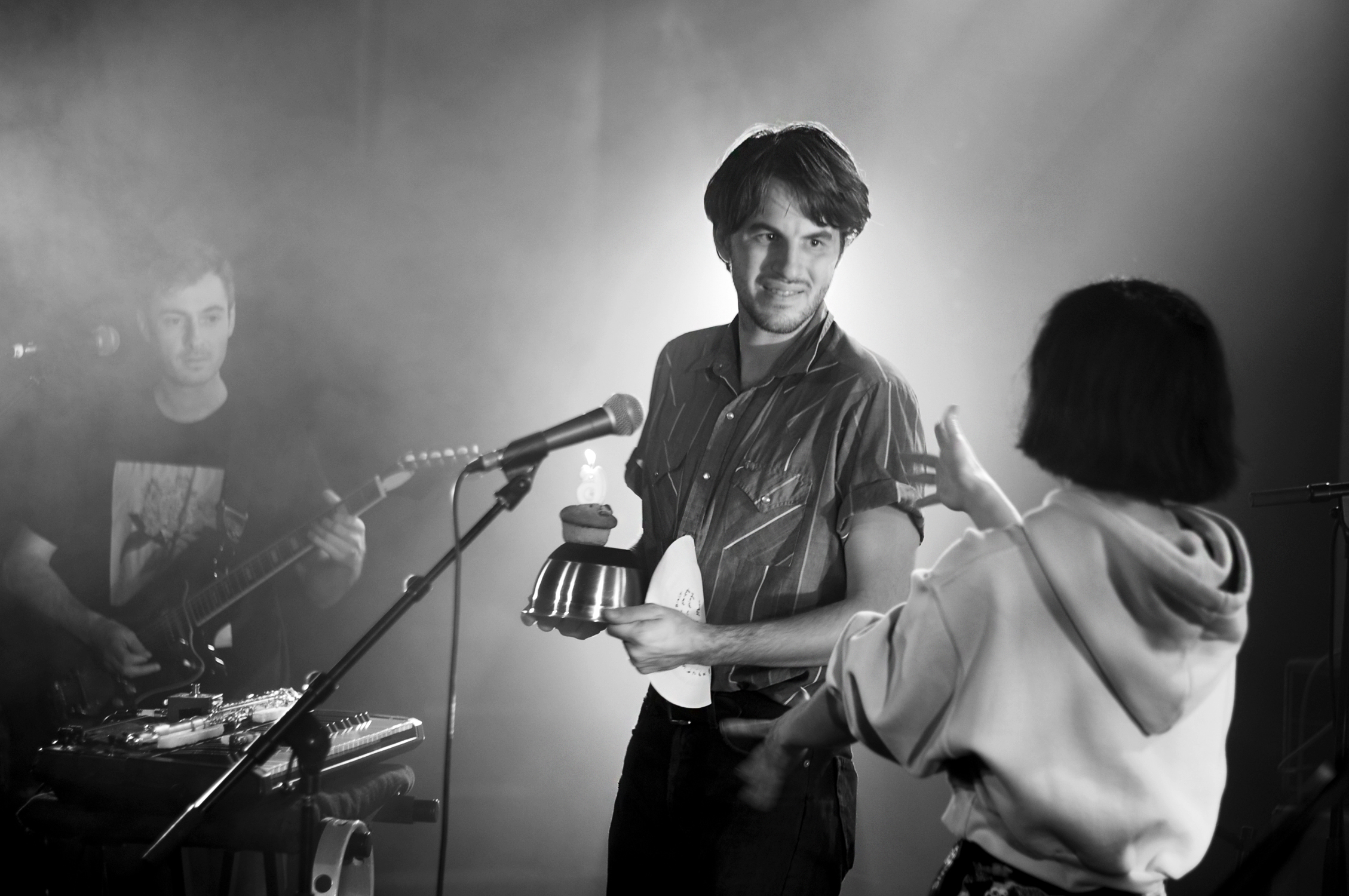 Kumisolo est le parfait et évident mélange des cultures française et japonaise. Avec des textes second degrés en français (ou en japonais sur “Kabuki femme fatale”), une naïveté dans l’interprétation et une musique pop sucrée, Kumisolo est un ovni d’absurdité et de joyeuseté. On se prend à onduler des hanches sur “Chapardeuse” ou “Transports en commun”. L’ambiance est plus aérienne avec “Voyage” et son intro à la flûte traversière ou “La tête ailleurs”. Et puis vient l’heure du dessert, elle chante “Fondant au chocolat” puis allume sur scène une bougie qu’elle plante dans un muffin que Victor Peynichou vient souffler. Elle termine son set sur “Kung Fu Boy”, titre bien connu des Kumisolo fans qui chantent le poing en l’air kung fu.