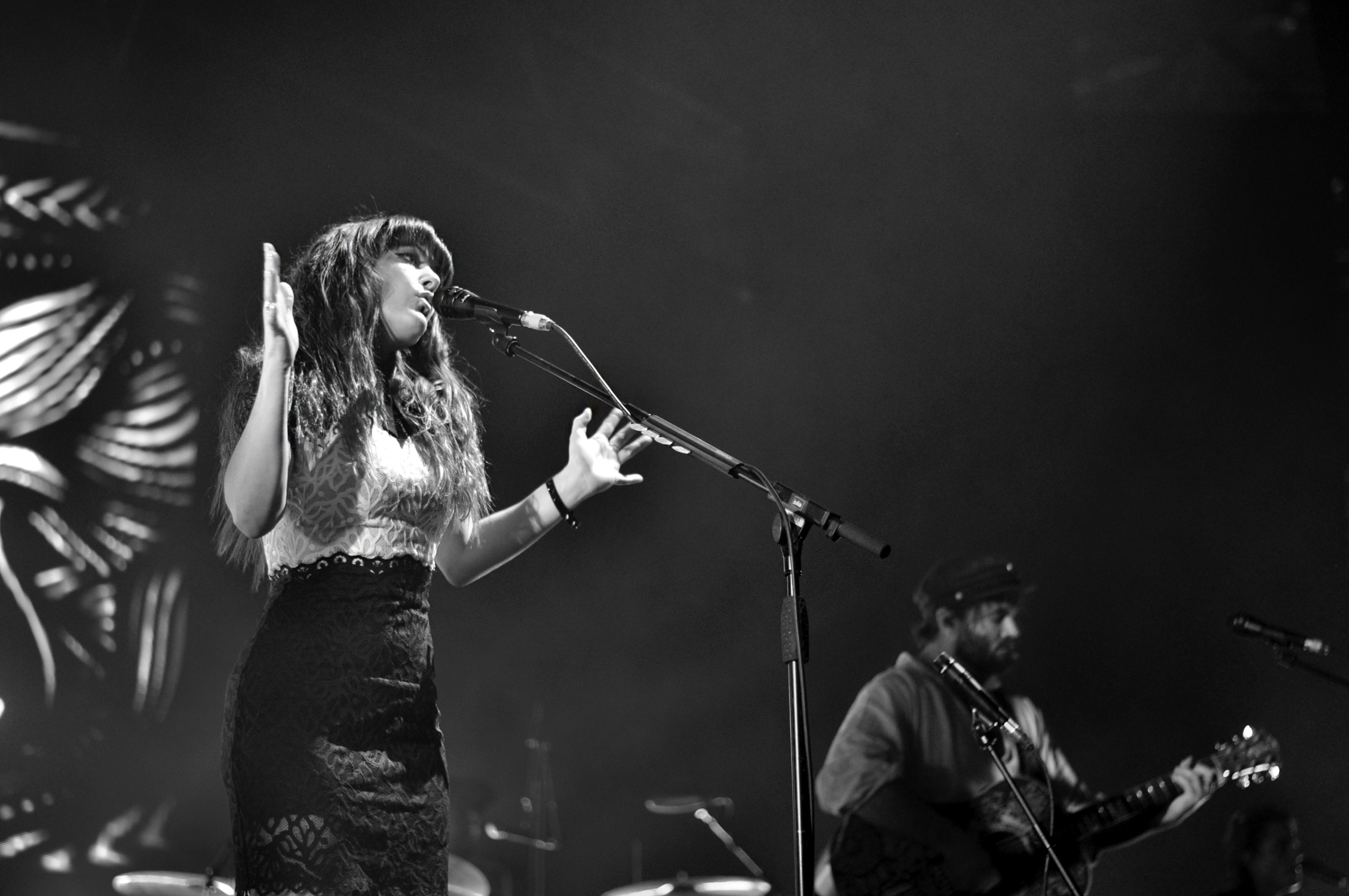 C’est un peu après 21h qu’Angus et Julia Stone débarquent sur scène, avec leur quatre musiciens. Derrière eux, un gigantesque totem électrique a été dressé à l’inter-set. Un autre, tout petit, est posé sur l’un des ampli à côté de la batterie. Un grand écran diffuse des images romantico-psychédéliques : des mandalas, des étoiles, des loups qui hurlent, des soleils couchants… Sur le devant de la scène, Julia et Angus sont à un bon mètre cinquante d’intervalle. Julia, en robe dentelle noire et blanche est resplendissante, Angus casquette vissée sur le crâne, grosse veste en cuir et chemise blanche bien loose est fidèle à lui-même.