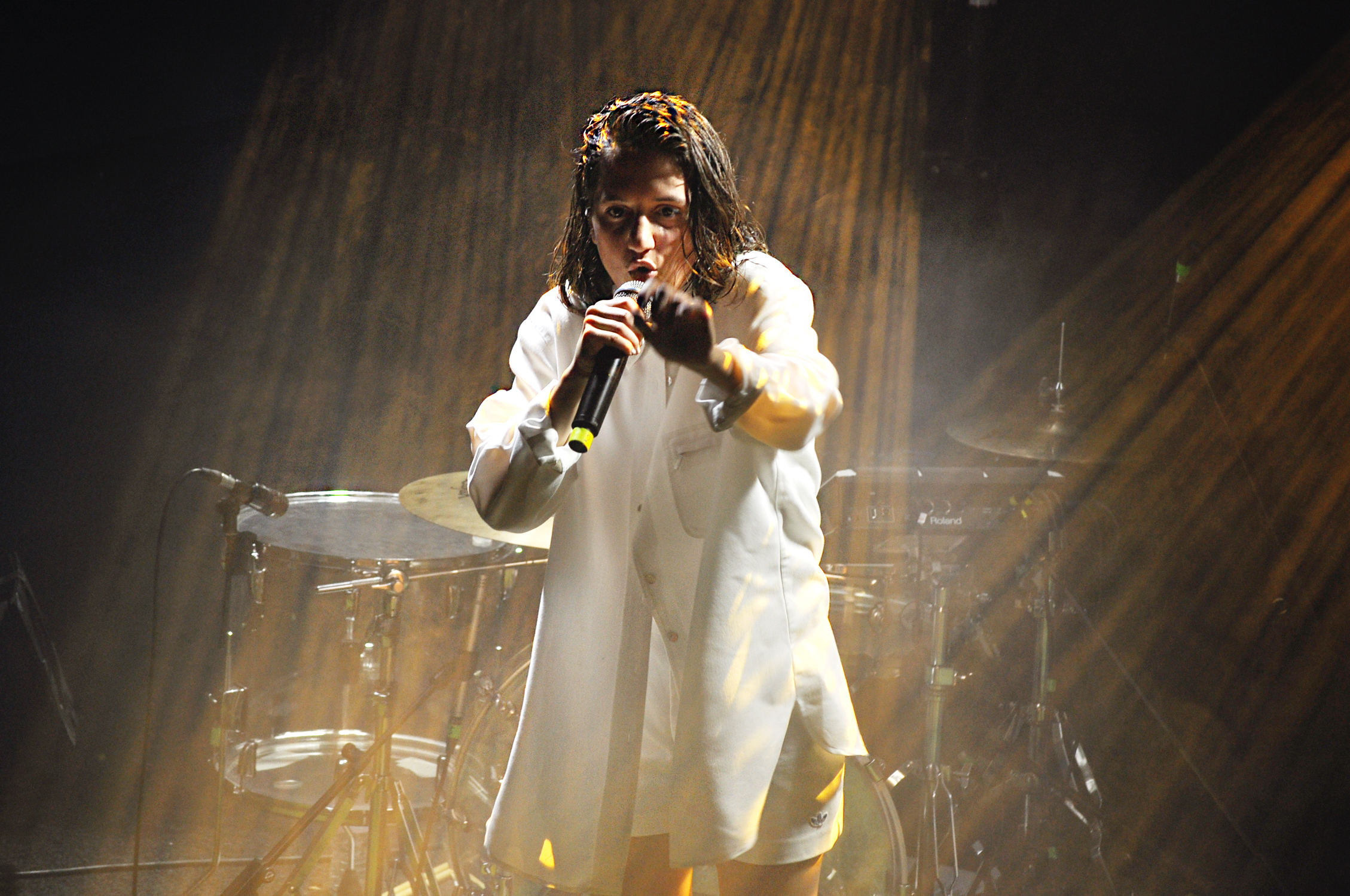 Pour nous faire patienter, Eddy a invité Aloïse Sauvage, bout de femme explosive que tu connais peut-être pour son rôle dans 120 Battements par minute. Tout habillée de blanc, short et chaussettes remontées, la jeune rappeuse pourrait tout aussi bien faire un one woman show. Les blagues et les vannes sont une intuition pour cette artiste multi-facettes qui a fait des études en arts du cirque. Ce n’est que son 3e concert ce soir-là et elle se débrouille comme un chef. Entre pas de danse à la Christine & the Queens et textes sur l’amour (“Osmose”) ou les doutes (“Hiver brûlant”), on ne voit pas le temps passer. Elle parvient même à faire scander au public le refrain de sa dernière chanson très dansante, “Aphone”. Chapeau bas.