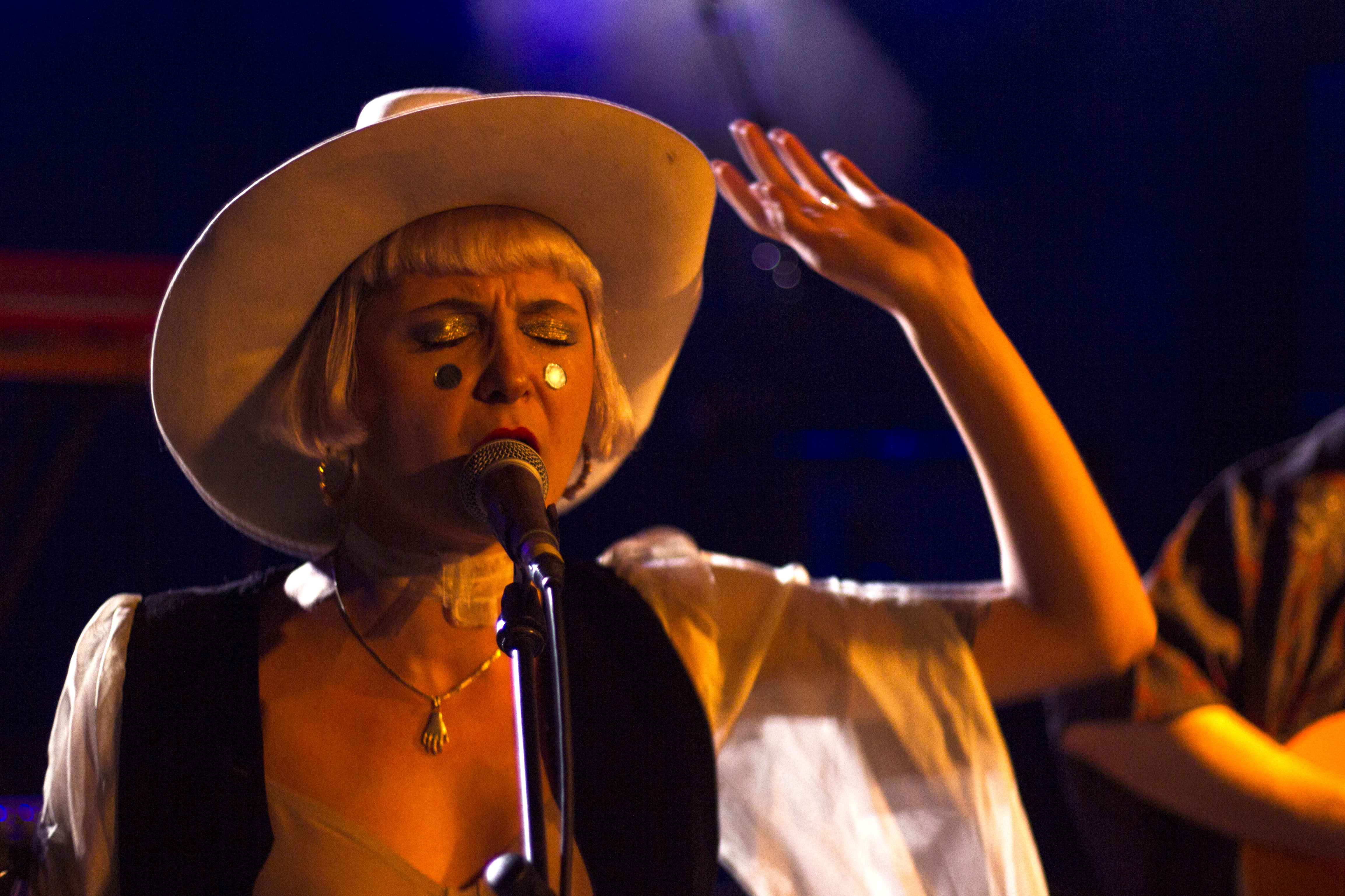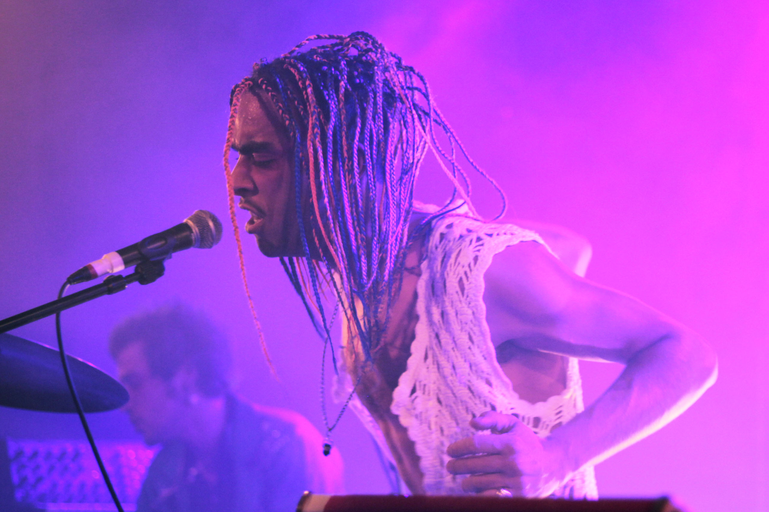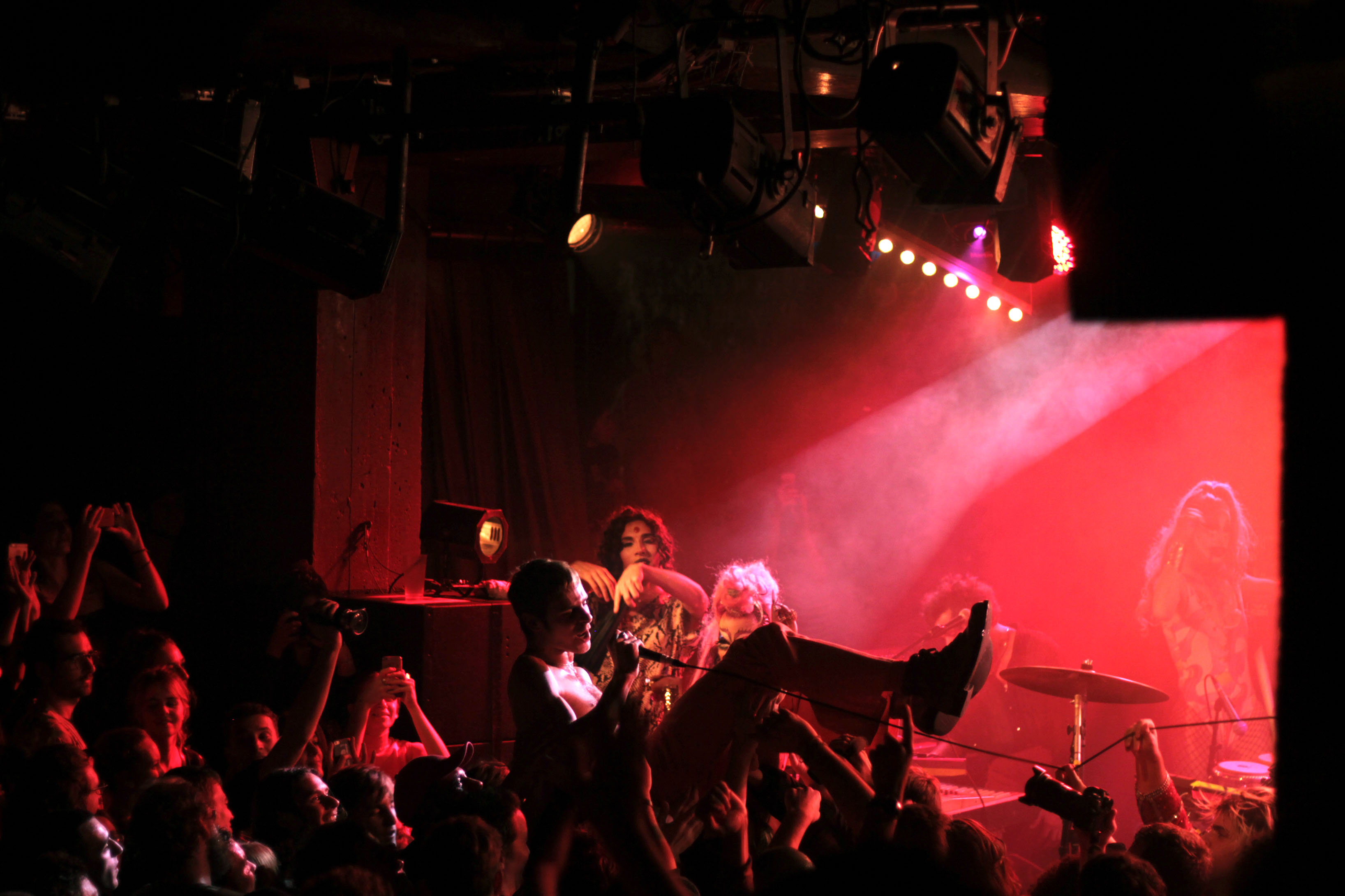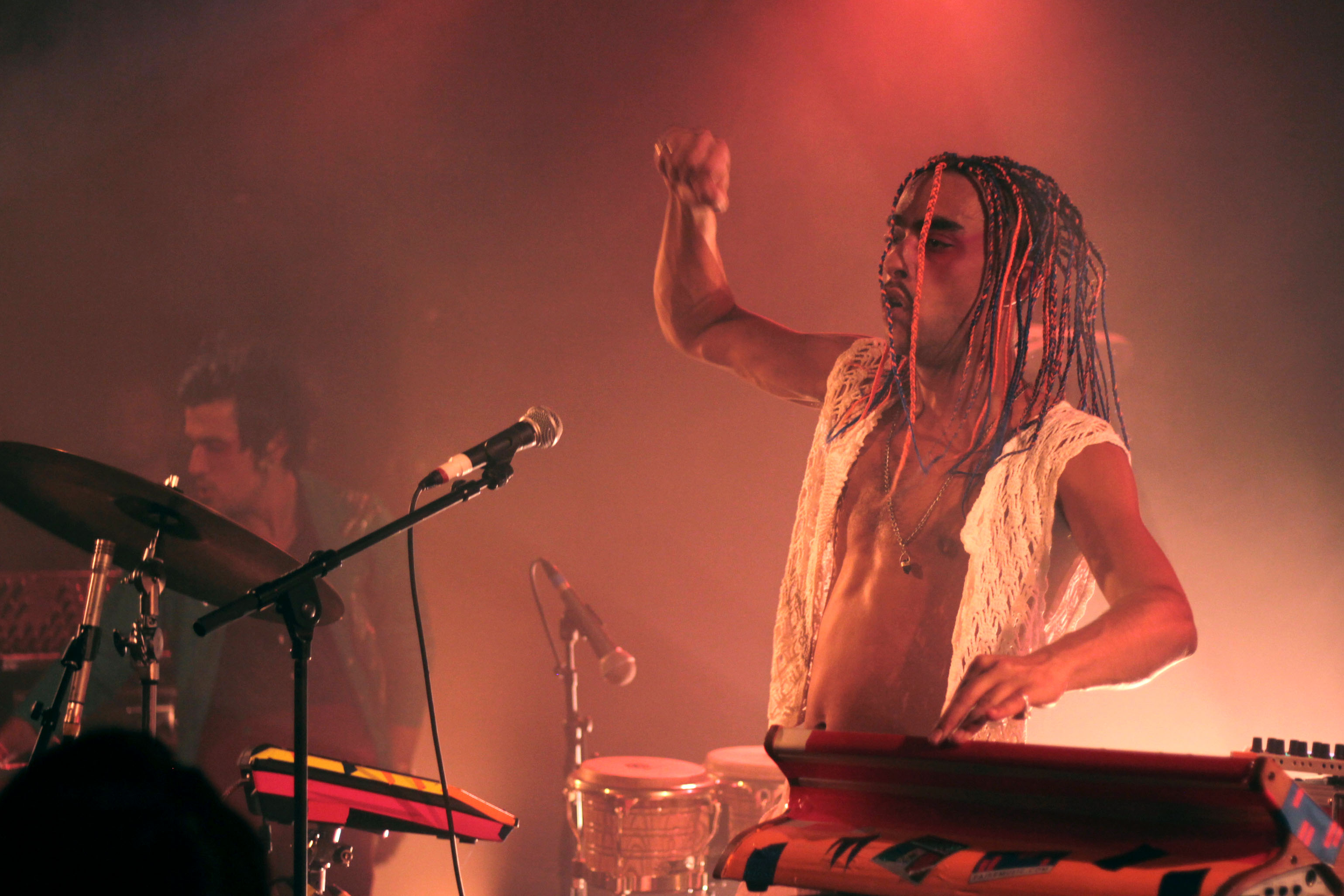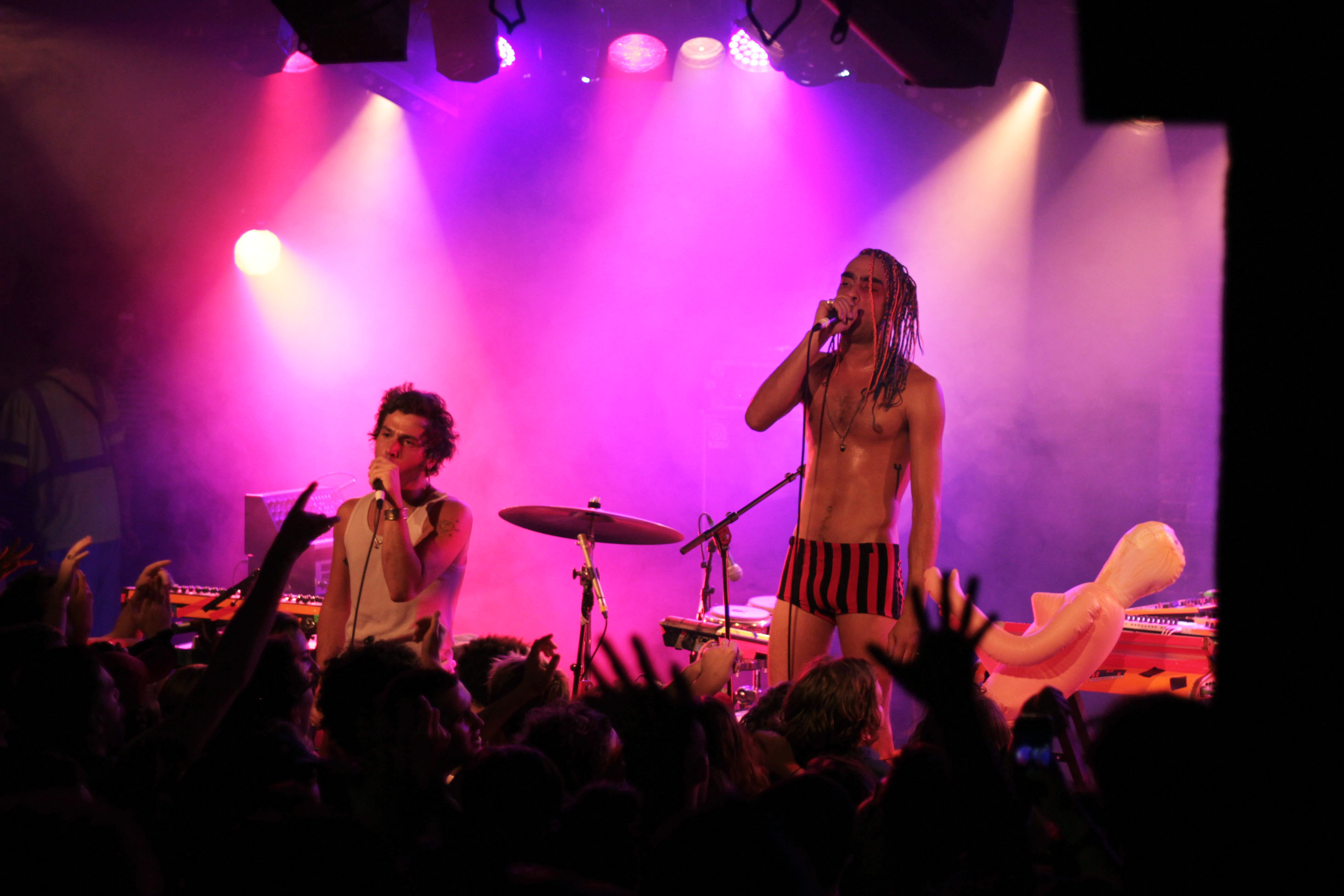 Le trio tant attendu sait se faire désirer. Le public est déjà amassé au devant de la scène lorsque les trois garçons font leur entrée. Avec leurs chapeaux et fourrures, ils sont élégants et en jouent, même si toute la salle le sait déjà, il finiront en caleçon. Mais pour les premières notes, scène et salle sont encore chastes. Le début de set est instrumental, histoire d’échauffer doucement les cervicales et les articulations. Mais dès que “Christiane” est lancée et que la scène est envahie de sensuelles et dénudées invitées, la Maroquinerie se transforme en une arène de pogo géante, qui ne reprendra son souffle que lorsque les lumières se rallumeront, 2h plus tard.