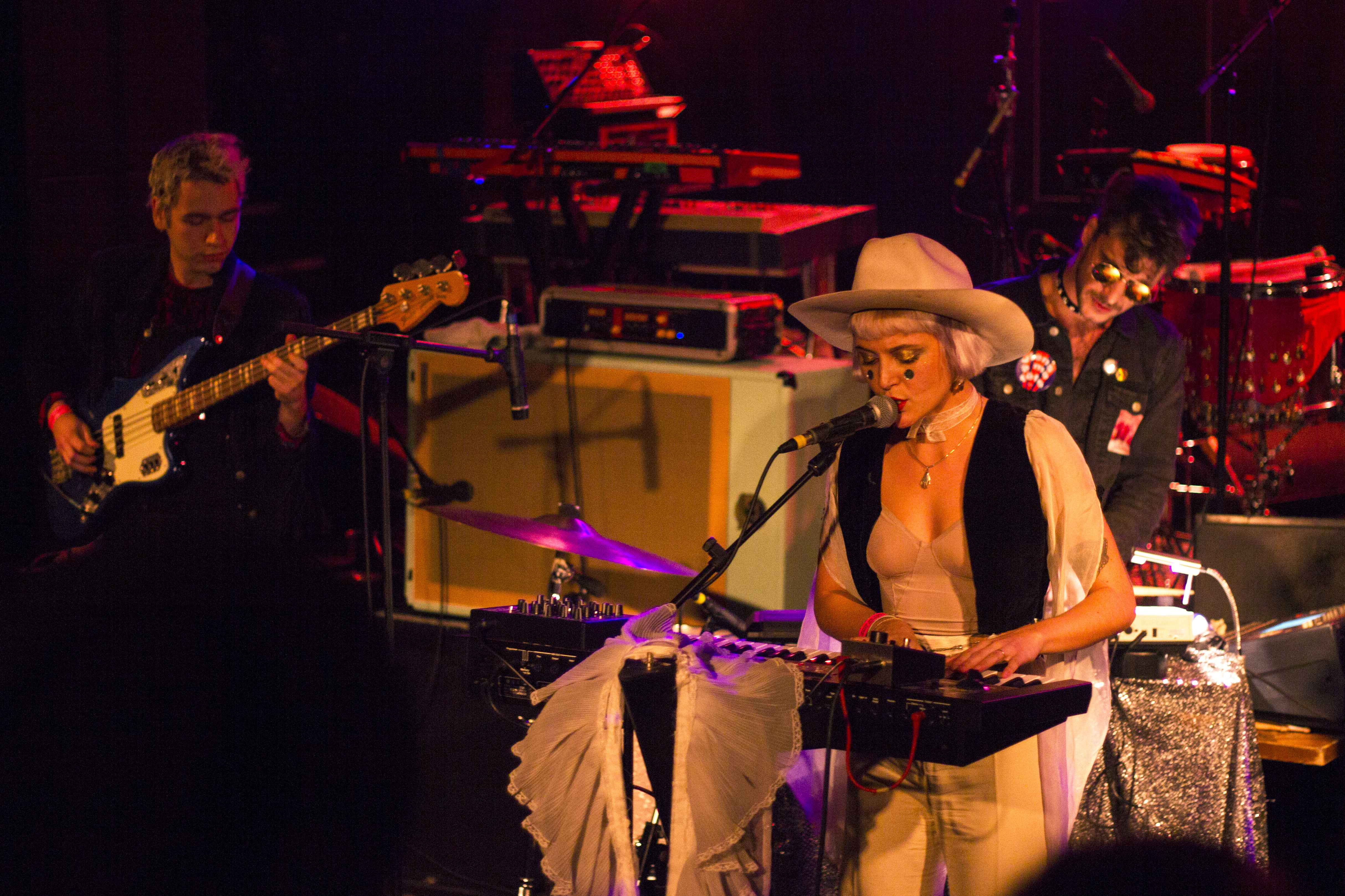 Pour la première partie, le cadre est intimiste. Les quatre musiciens de Lulu van Trapp sont installés au creux de la Maroquinerie, au cœur de la fosse. Autour d’eux, un public disséminé se rapproche progressivement au fil du set. Sur cette petite scène improvisée, une chanteuse-claviériste, un chanteur-guitariste, un bassiste et un lanceur de samples-batteur électronique s’amusent et font le show. C’est pourtant leur tout premier concert ensemble ! La setlist est colorée et variée, un peu d’électro, une touche de jazz, du R’n’B, un pincée de punk et trois gouttes de drum & bass. Le cocktail est efficace, et le jeu de scène enflammé. Mission accomplie, la salle est bien chaude pour accueillir Faire.