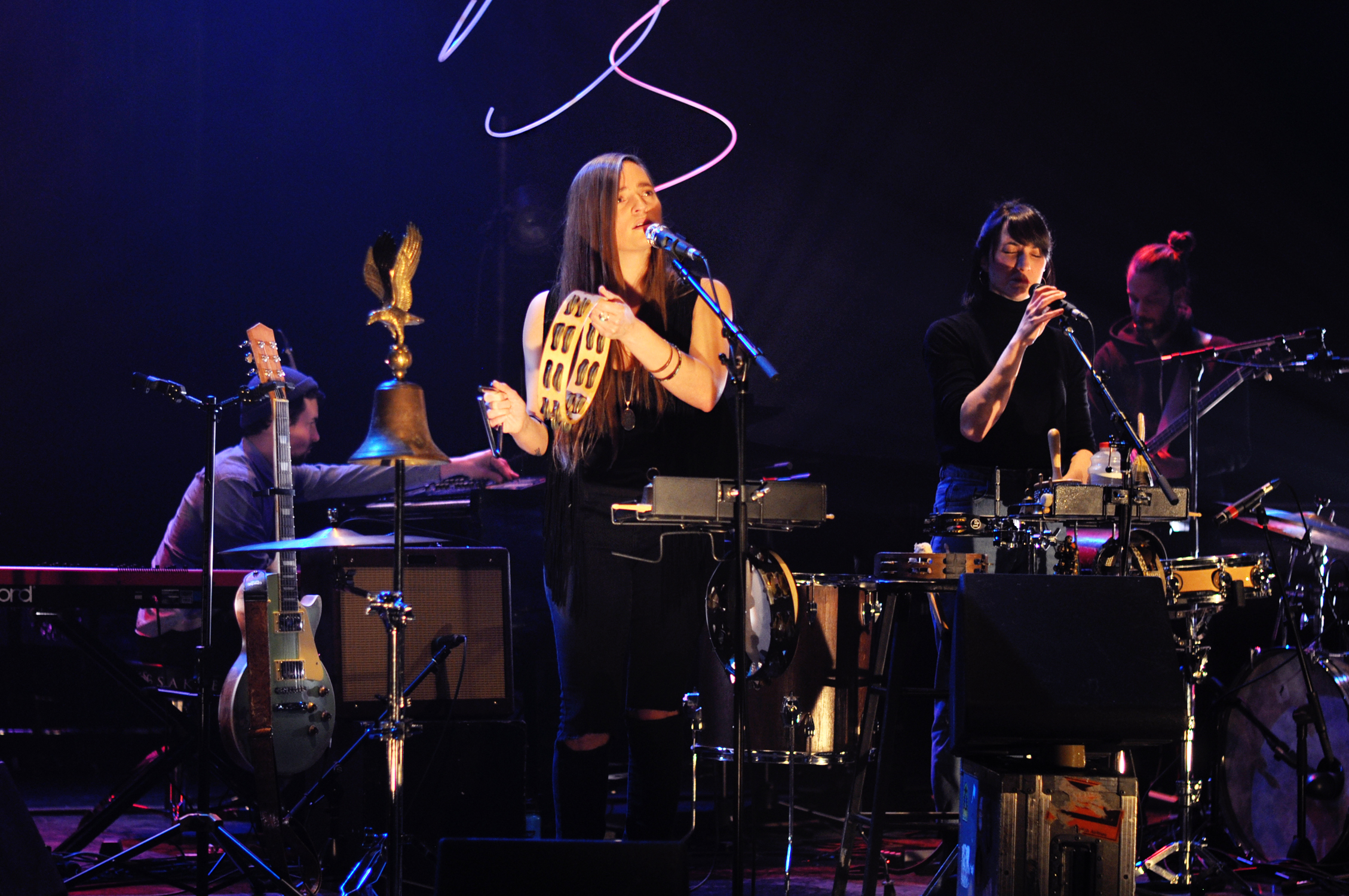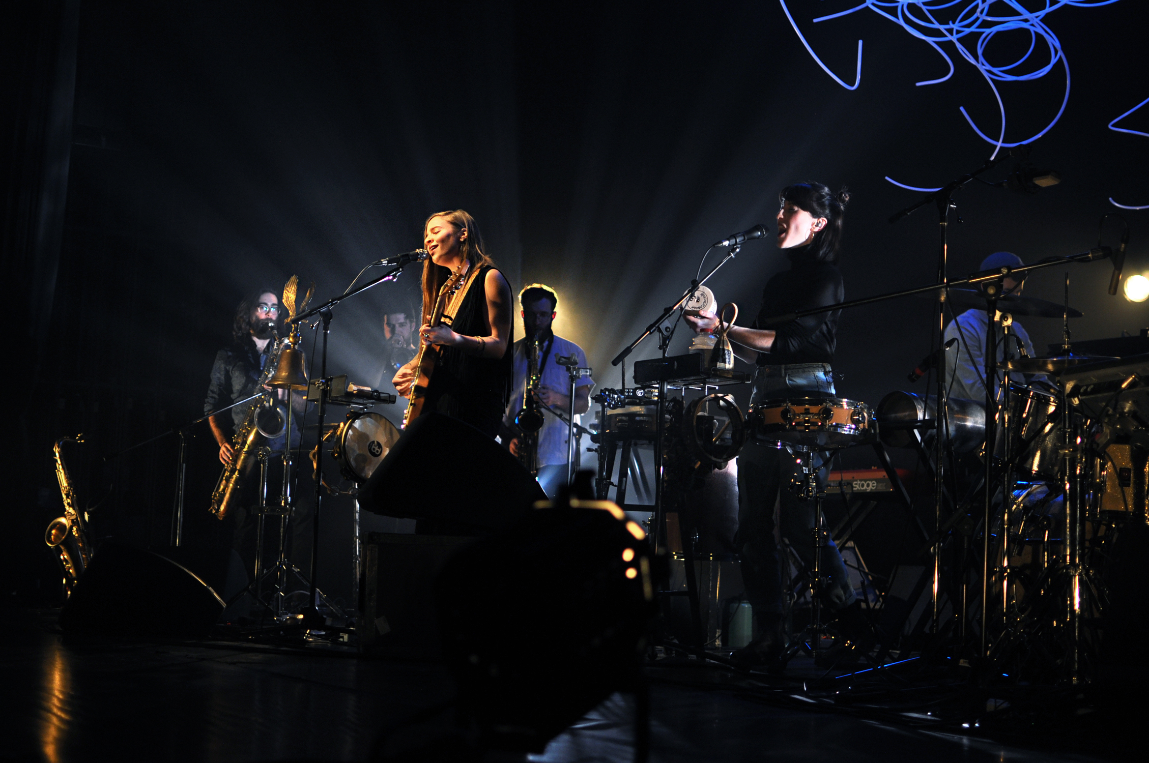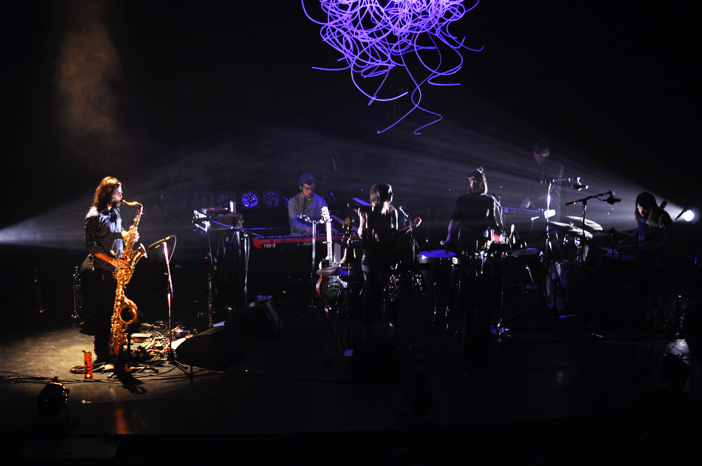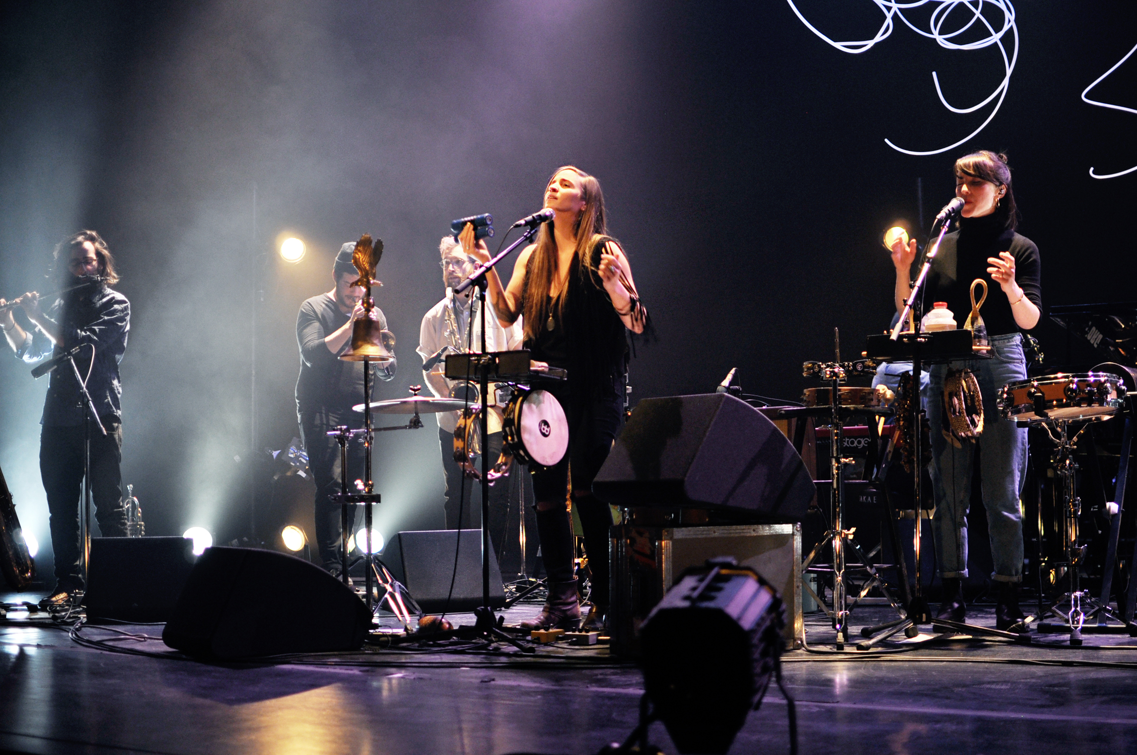 Cela faisait quelques jours que je voyais passer des photos de Bellflower répétant à la Maison de la culture Frontenac. Le concert était prévu le lundi soir, l’histoire de bien finir le mois de janvier. Les huit Québécois étaient pour quelques jours en résidence dans ce bel auditorium d’arrondissement. Sièges cosy et scénographie épurée, Bellflower présentait un show retravaillé pour The Season Spell leur dernier album.