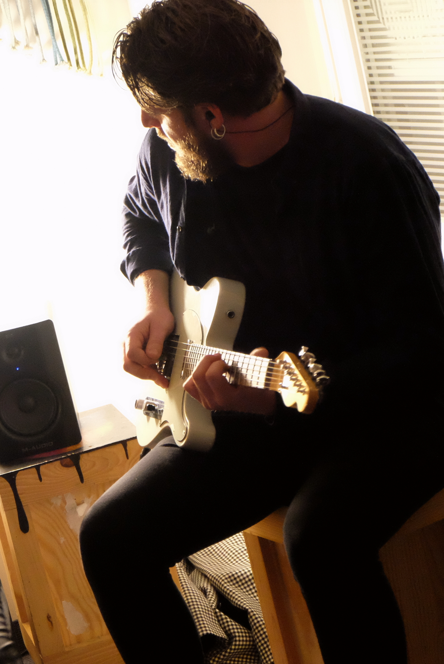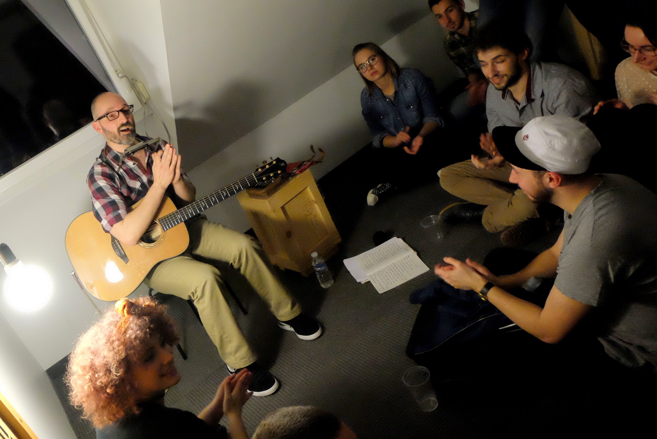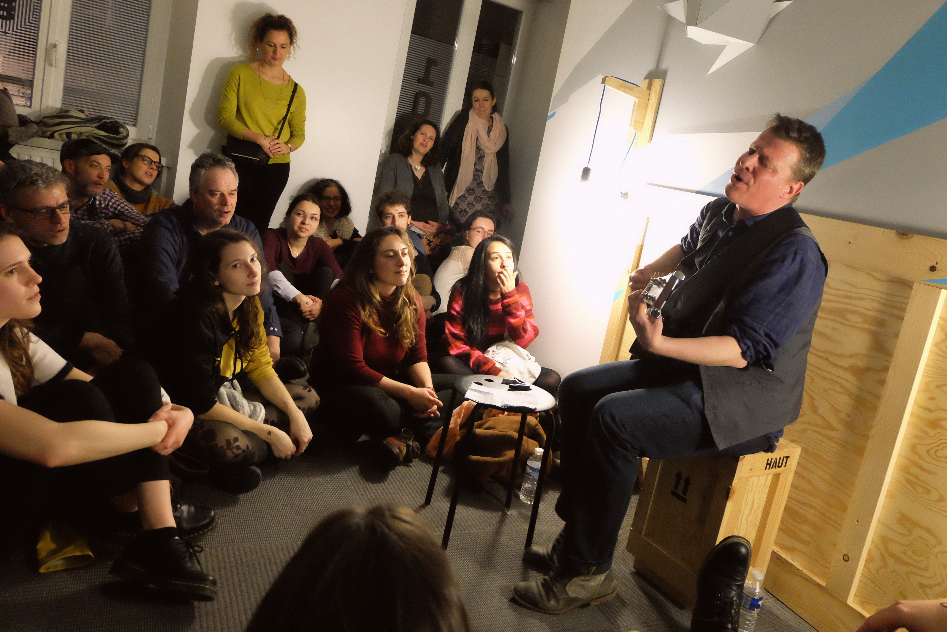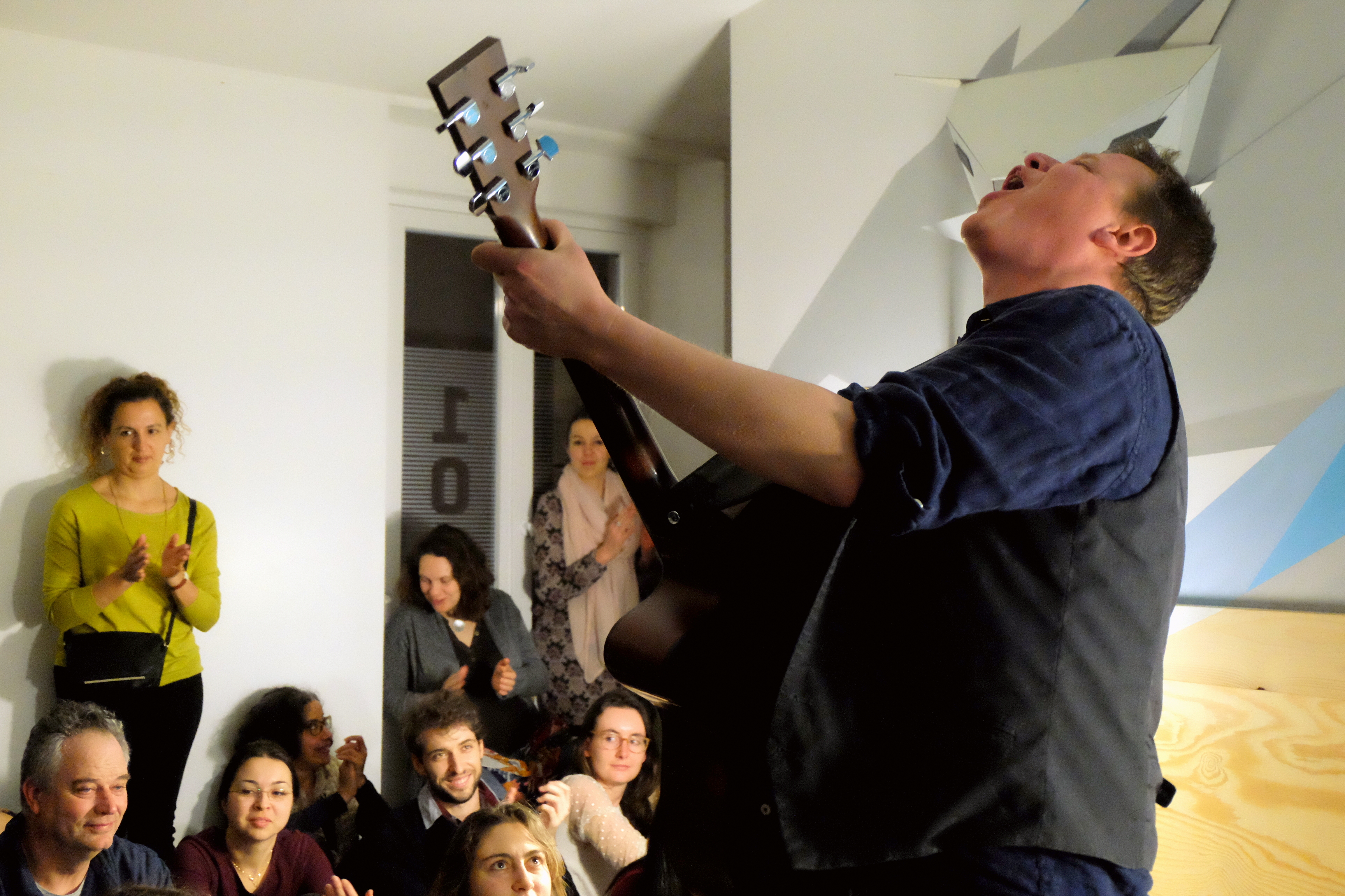 Mony attend tranquillement que le public soit autorisé à monter. Il sent bien la chambre : “101, c’est le nom d’une tournée de Depeche Mode, ça !” Seul avec sa guitare, lui qui souvent joue avec son groupe The Hatmen, il chante des chansons de son futur album en totale acoustique, sans micro. C’est ça l’avantage des petites chambres d’hôtel. S’il commence le concert assis, il le finira tout de même debout, ne résistant pas à faire battre la mesure à un public qui ne se fait pas trop attendre pour participer. Voix rocailleuse et adepte d’un blues rock qui sent l’Amérique, ses reprises trahissent ses influencent : un standard de Blues/jazz “Delta Bound”, et une reprise des fameux Kaleo “Way Down We Go”. L’ambiance est posée : la soirée sera rythmée et souriante.